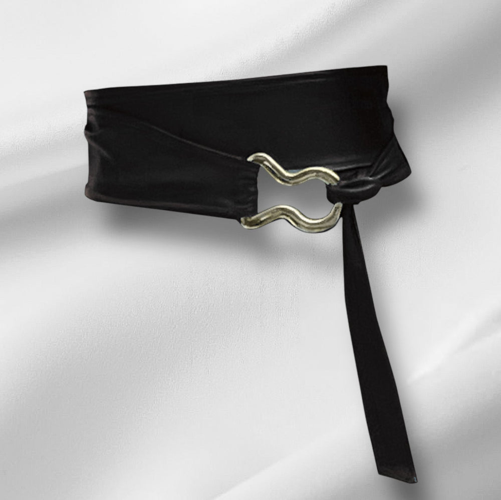 Cintura in simil-pelle, elasticizzata e molto morbida alta 10 cm. con aggancio in metallo scorrevole dorato. Fa due giri attorno alla vita, per un effetto"a bustino". Il materiale, molto elastico e confortevole permette una grande regolazione.