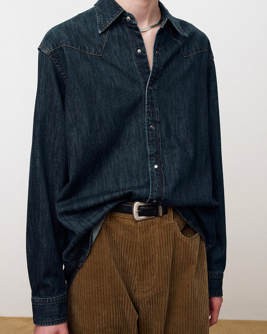 Cintura in pelle nera con fibbia Western in metallo lucido sul fronte.