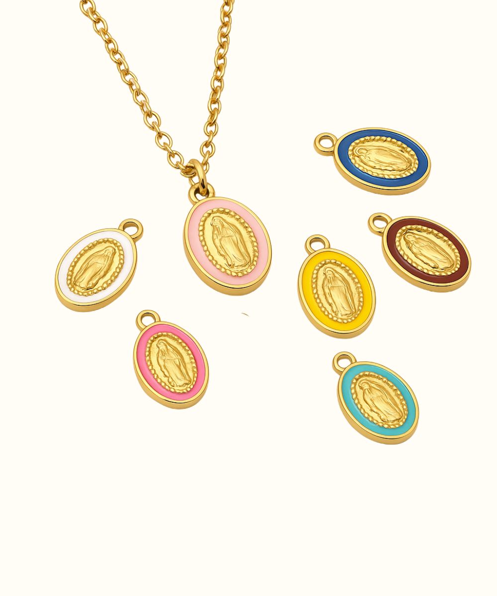 Questa elegante collana con ciondolo smaltato raffigura una delicata madonnina, simbolo di protezione e fede. Perfetta per chi desidera un accessorio raffinato che unisce spiritualità e stile, è ideale da indossare ogni giorno o in occasioni speciali. Un gioiello che dona un tocco di significato e bellezza al tuo look.