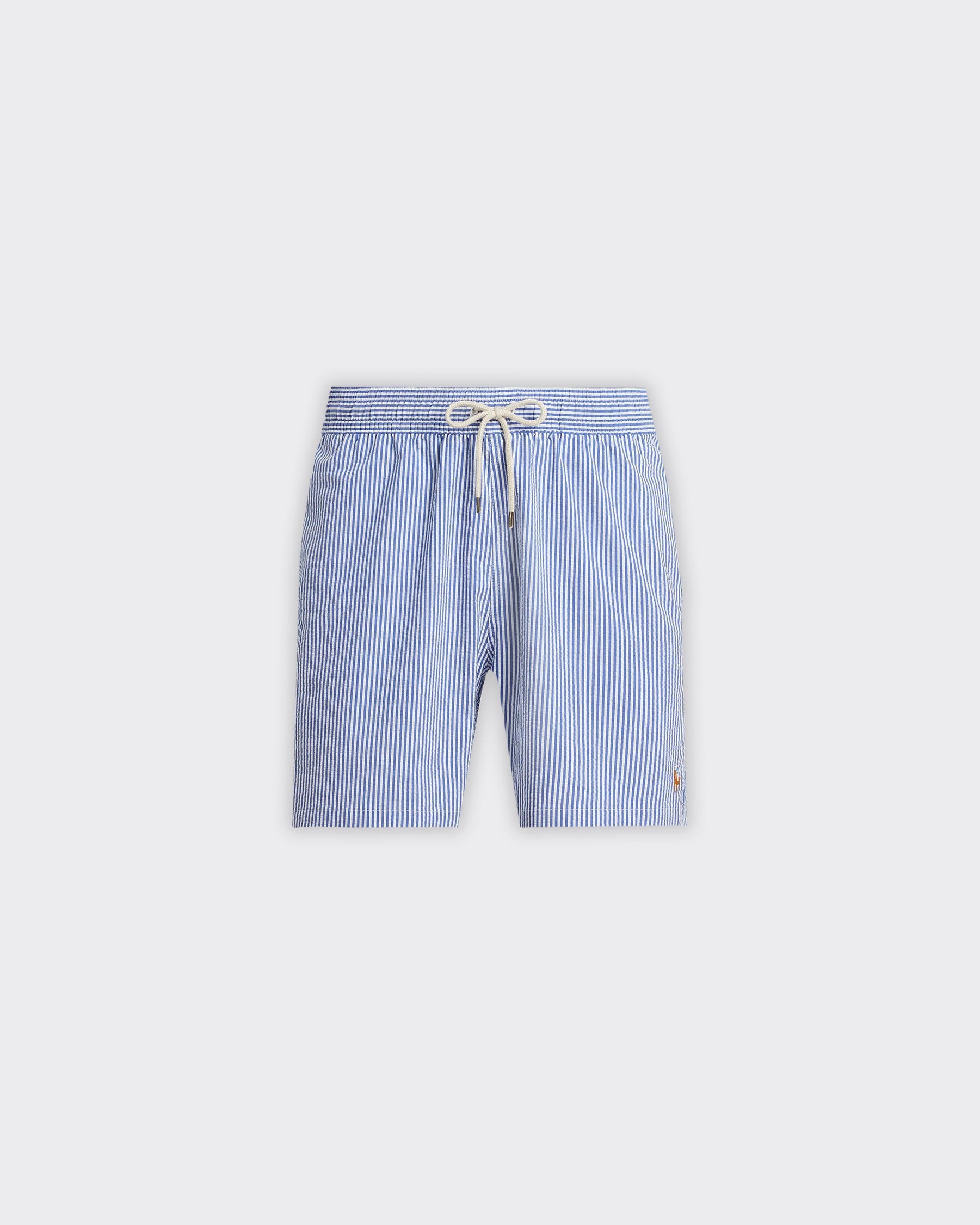 Shorts in tessuto seersucker a righe bianche e blu, con logo ricamato sul fianco sinistro e coulisse in vita.