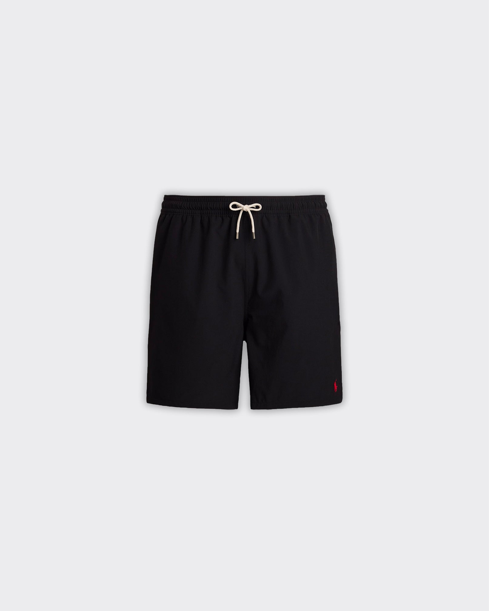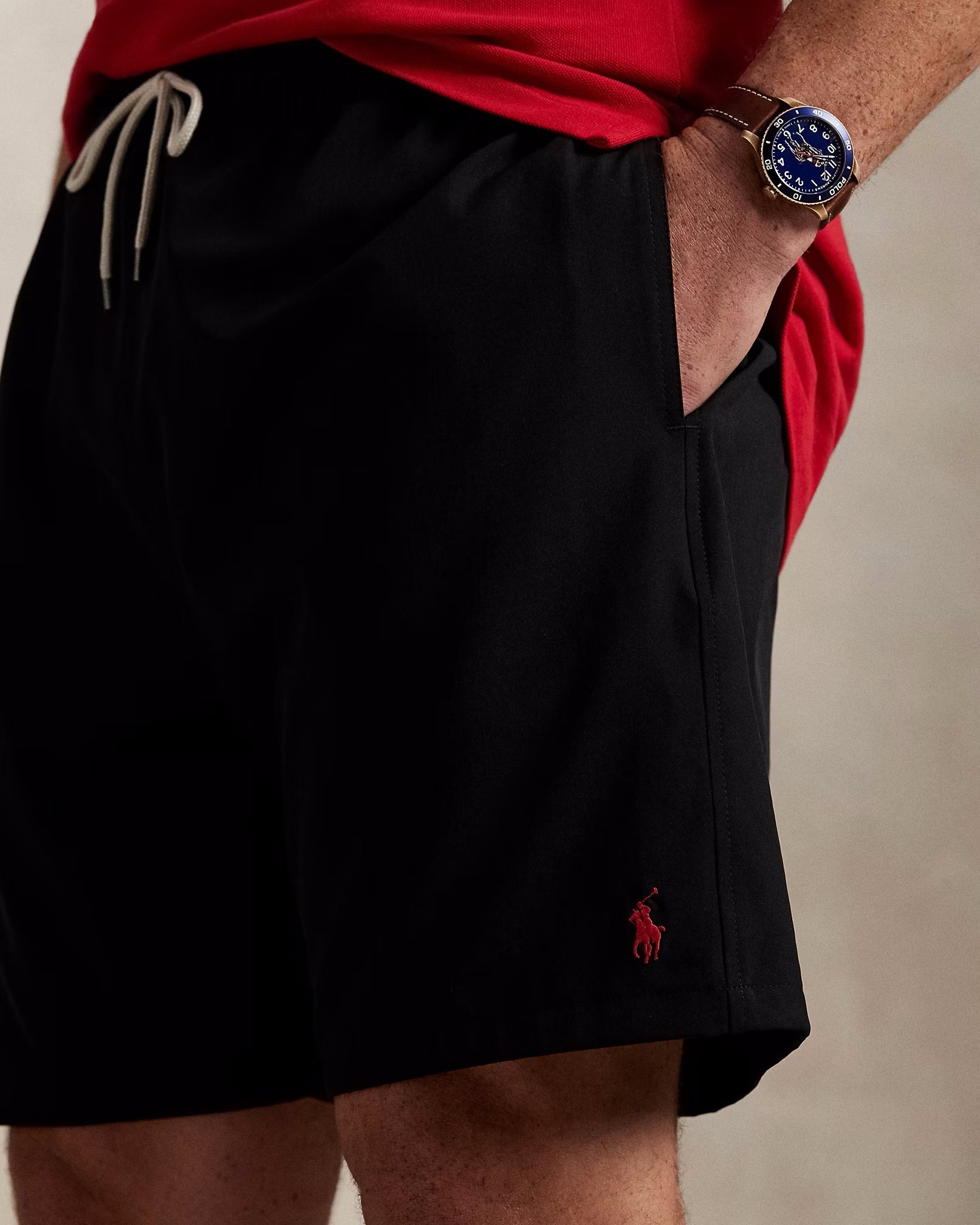 Colore nero, tessuto liscio, logo ricamato in rosso sulla gamba sinistra, cordino in vita.