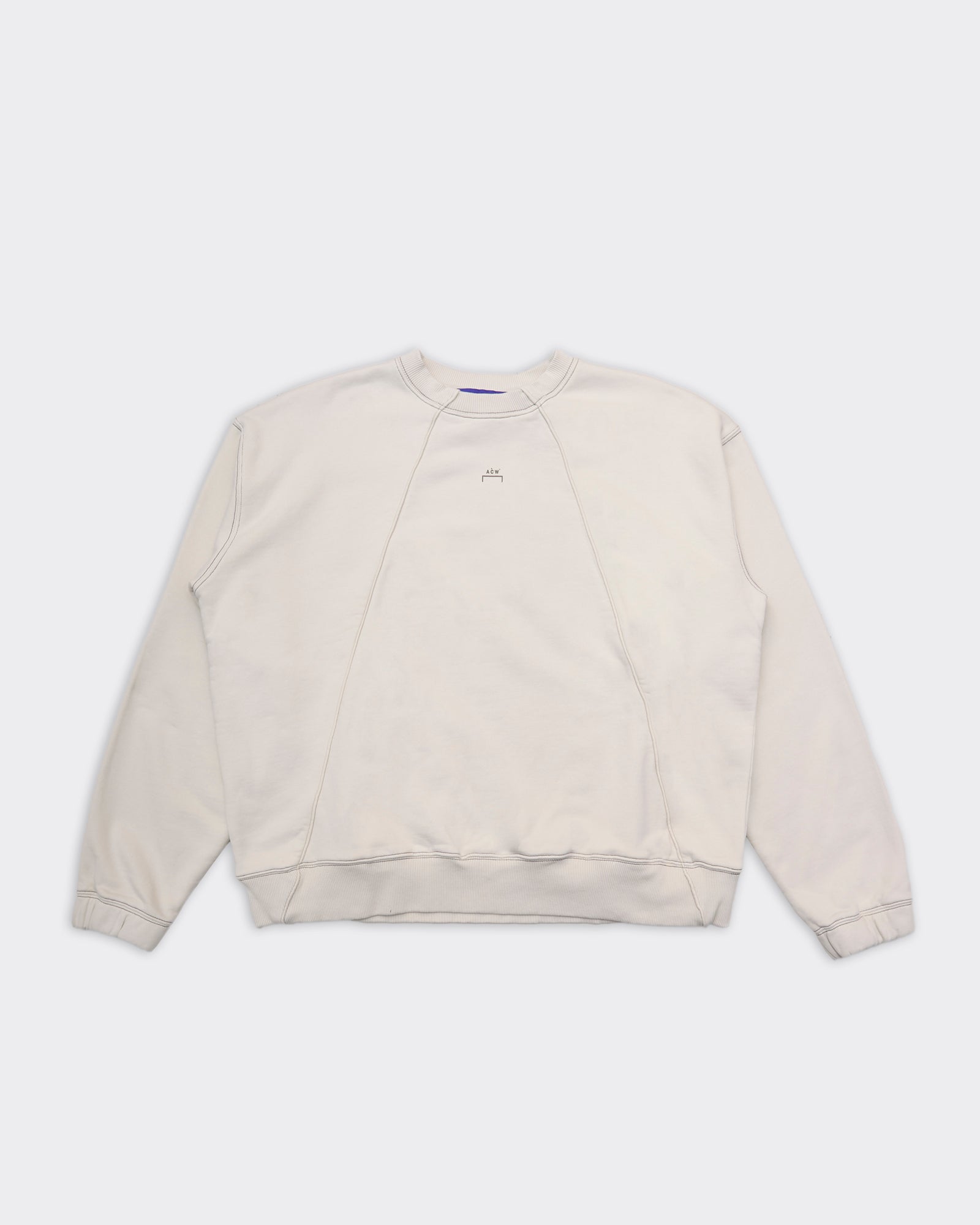 Colore beige chiaro con cuciture visibili tono su tono. Logo piccolo ricamato al centro del petto. Orli e polsini a coste.