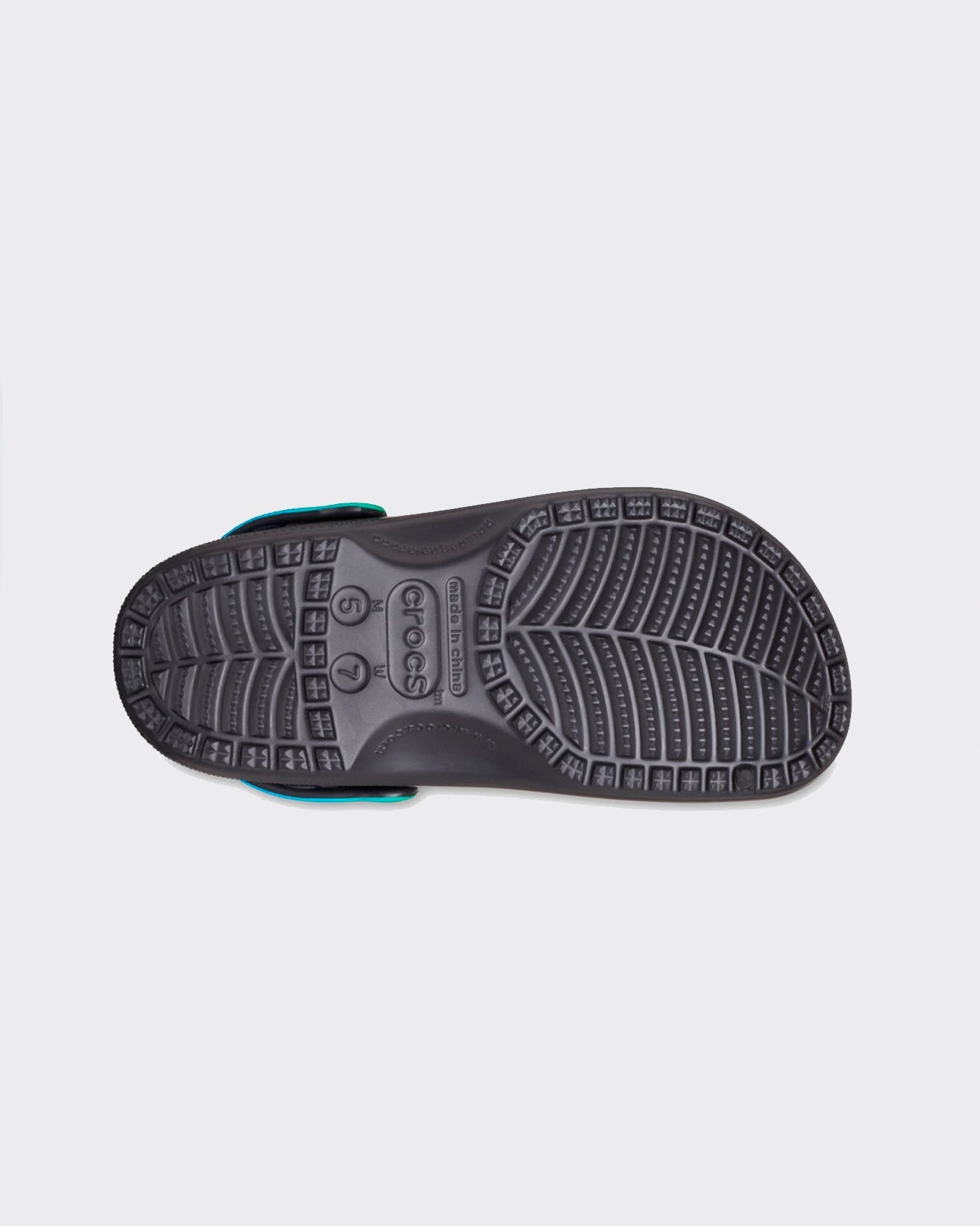 Zoccoli multicolore con base verde e dettagli pixelati multicolori. Elementi 3D applicati sulla parte superiore. Materiale sintetico con fori ventilati. Cinturino posteriore blu con bottone decorativo su entrambi i lati.