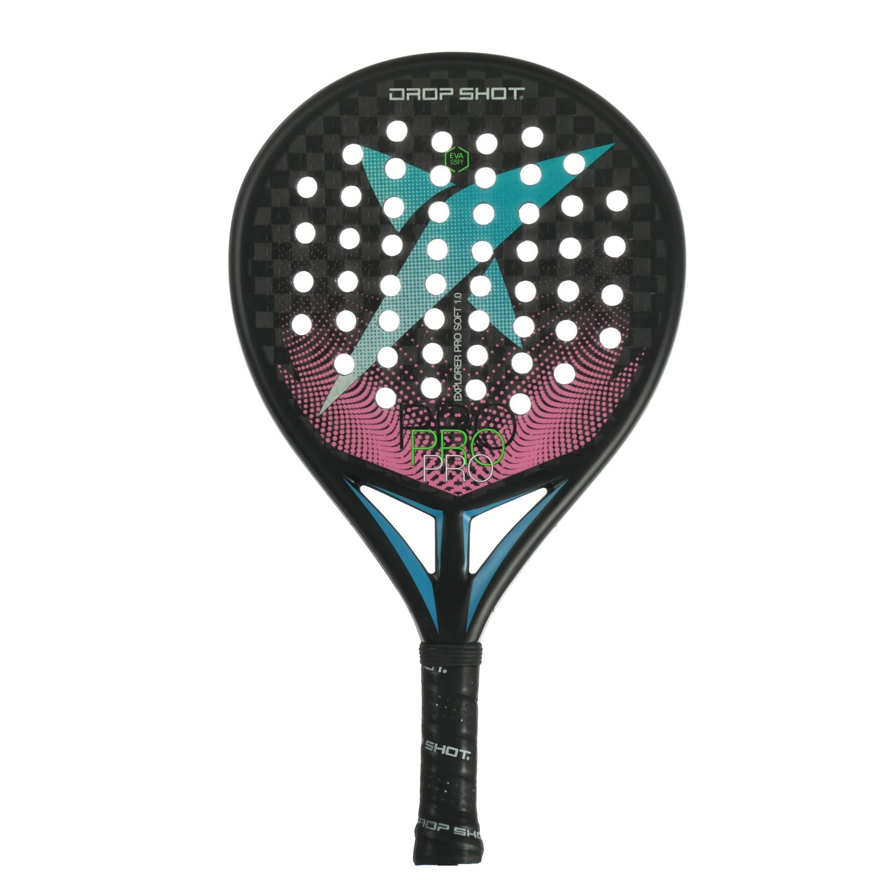 Perché la Drop Shot Explorer Pro Soft 1.0 ha una forma a goccia -nonostante la sua somiglianza con quella rotonda-, unpunto dolce molto ampio che copre quasi tutti i lati e un bilanciamento medio-alto che consente un ottimo controllo e un punto di forza in più. Un modello che ha una manifattura pregiata e si affida a un telaio composto da Twin Tubular System, Carbon 12.000 e 3D Face sui lati e un'anima interna in gomma Eva Soft a bassa densità e leggerissima. Una racchetta padel che incorpora anche grandi progressi tecnologici per migliorare le prestazioni: Core Shox e Smart Holes System nell'area dell'impatto, Power Beam Heart, PU Soft Protector nel telaio e Silicone Grip Channel o Cork Cushion Grip nell'area dell'impugnatura. Questo 2022 la Drop Shot Explorer Pro Soft 1.0 si evolve esteticamente e sfoggia una personalità più marcata dove i toni magenta e ciano giocano con i dettagli dello sfondo per esaltare l'effetto cangiante che ha conquistato tanti cuori. Una racchetta con molto controllo e che brilla per la sua insolita potenza grazie alle eccezionali prestazioni delle tecnologie coinvolte e che ampliano la gamma di colpi offensivi.