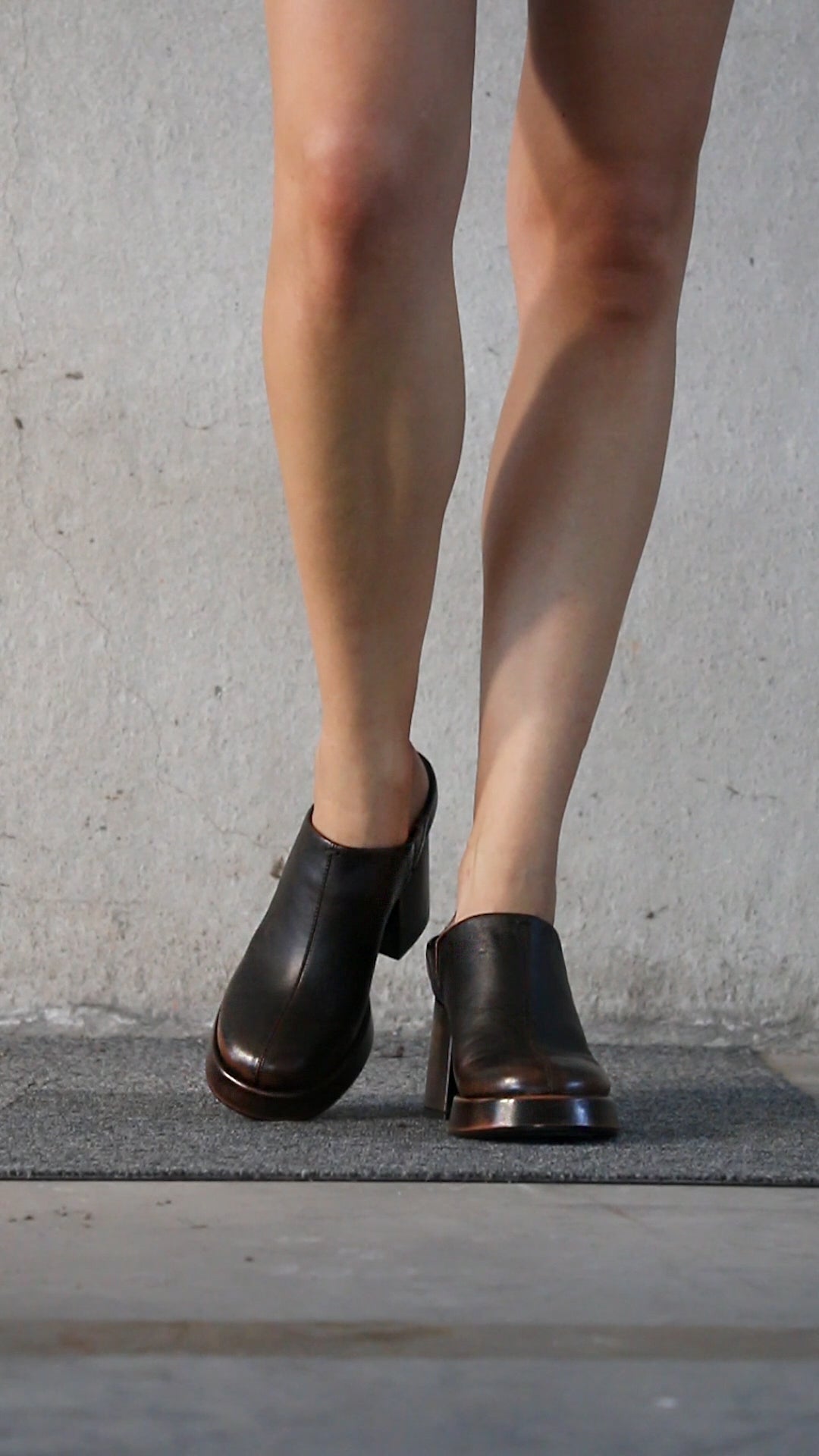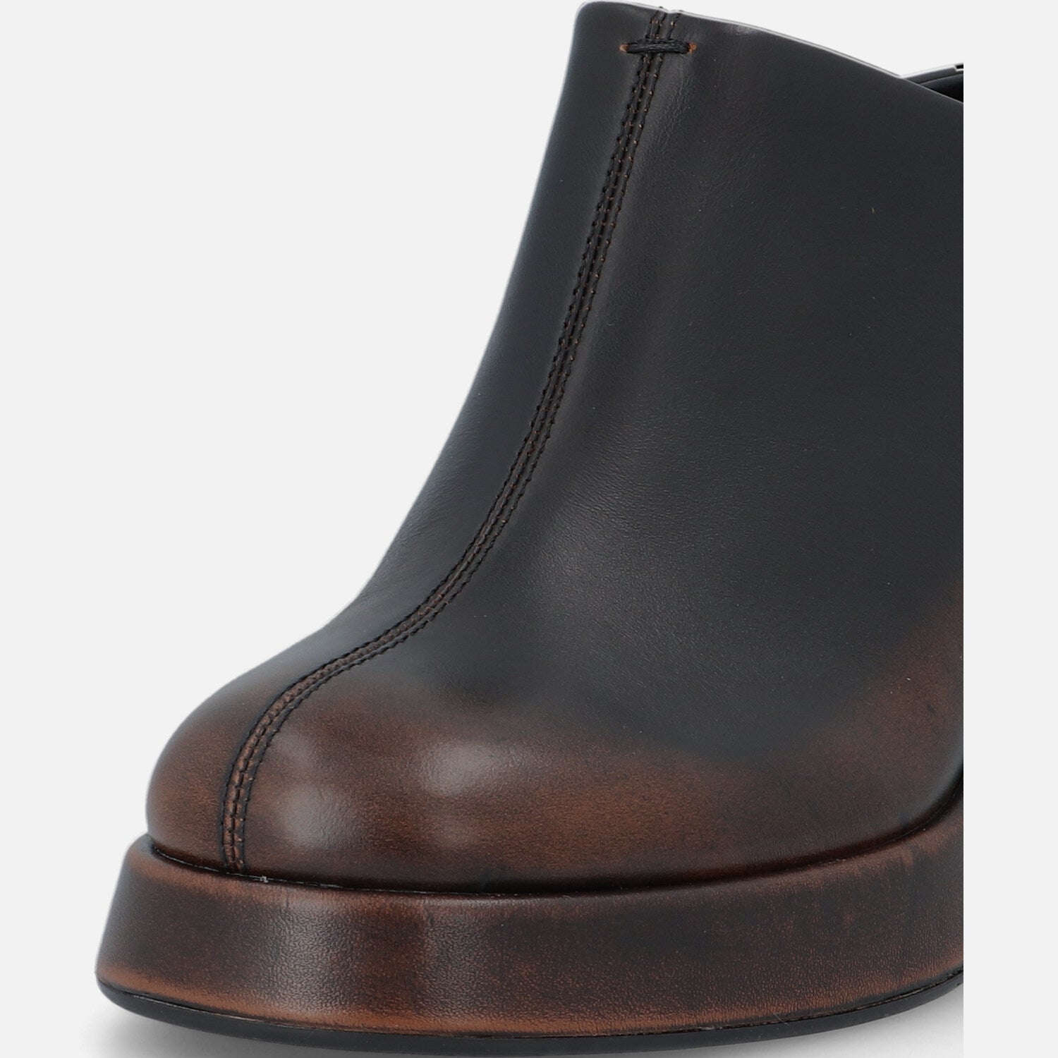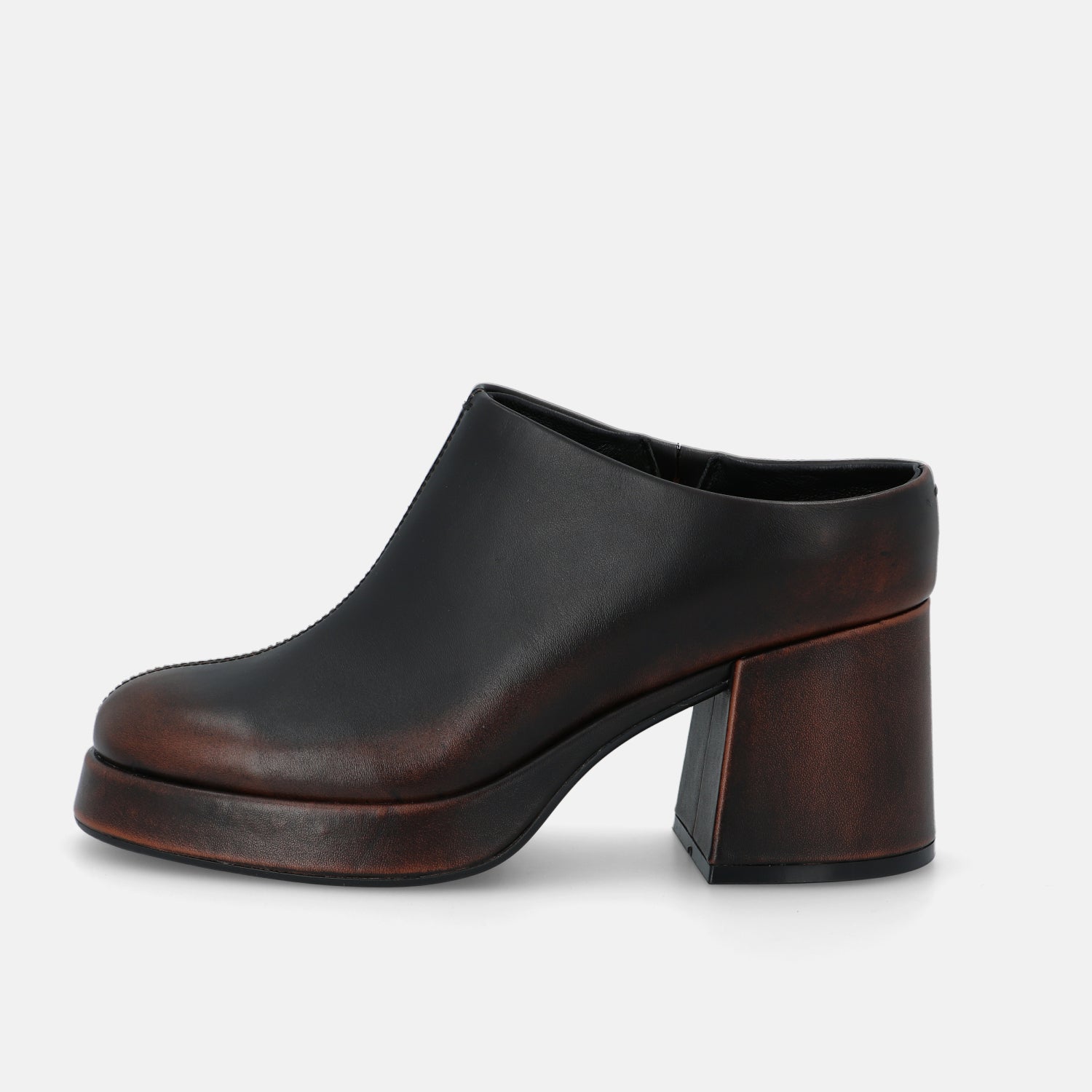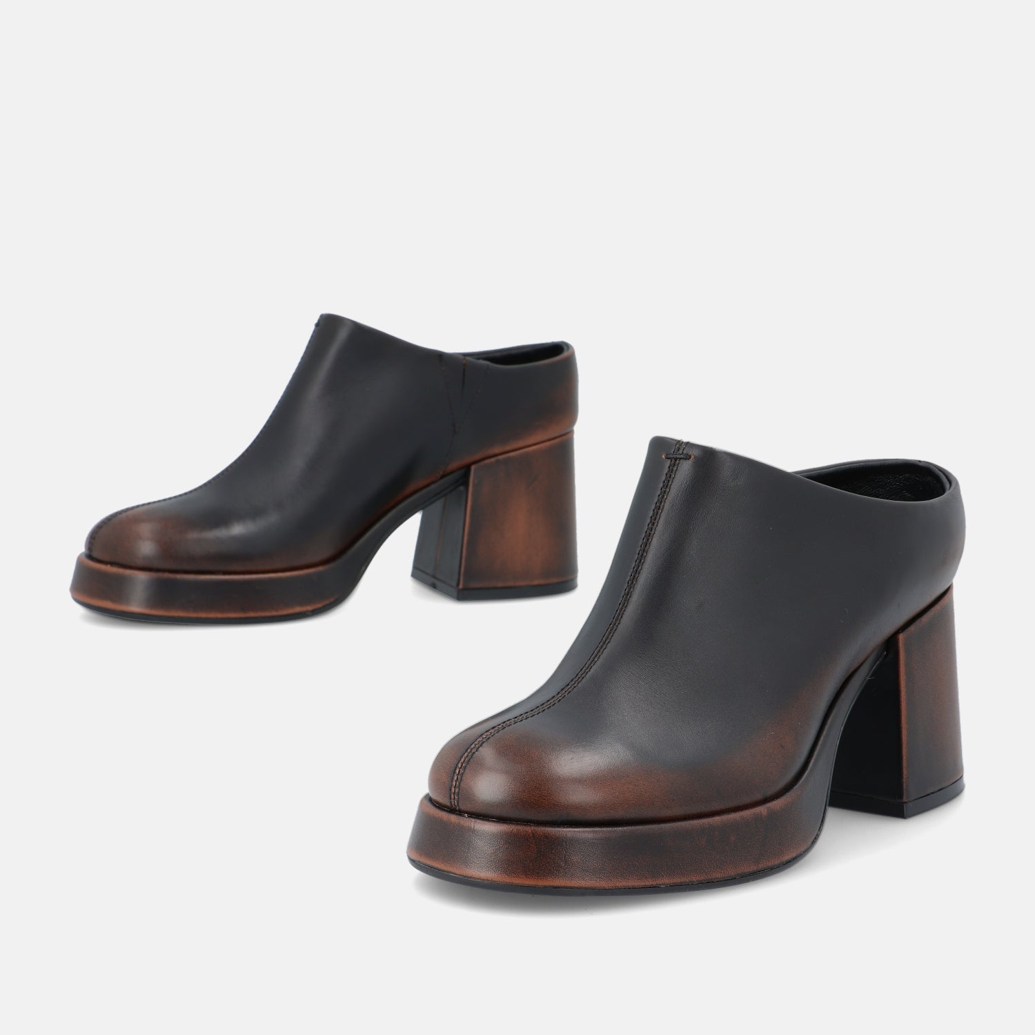 Le mules Eva Mu combinano linee essenziali e carattere deciso in una calzatura dallo stile contemporaneo. Realizzate in pelle asportata color cuoio, presentano una particolare lavorazione sfumata che crea un effetto vissuto ed elegante, esaltando la profondità della tonalità e conferendo unicità a ogni modello.