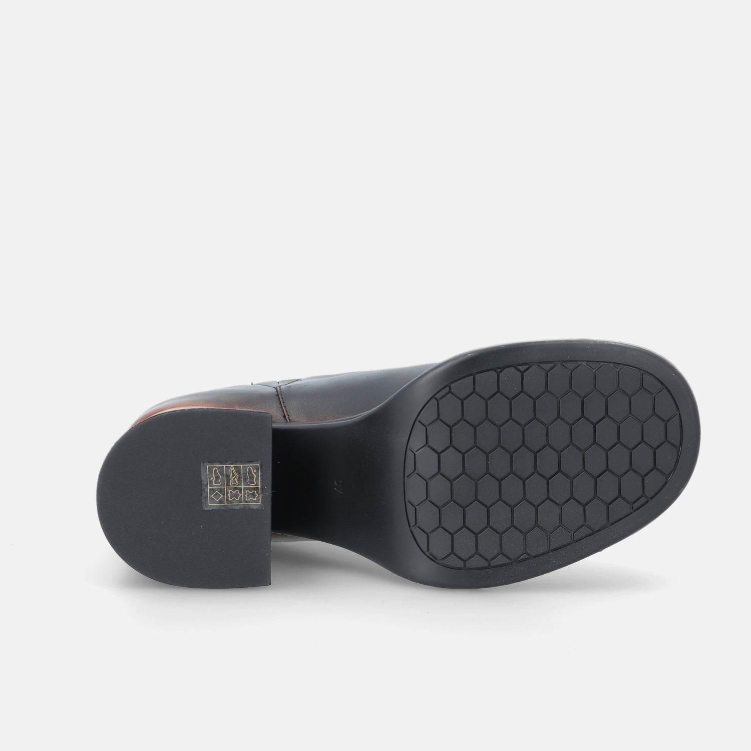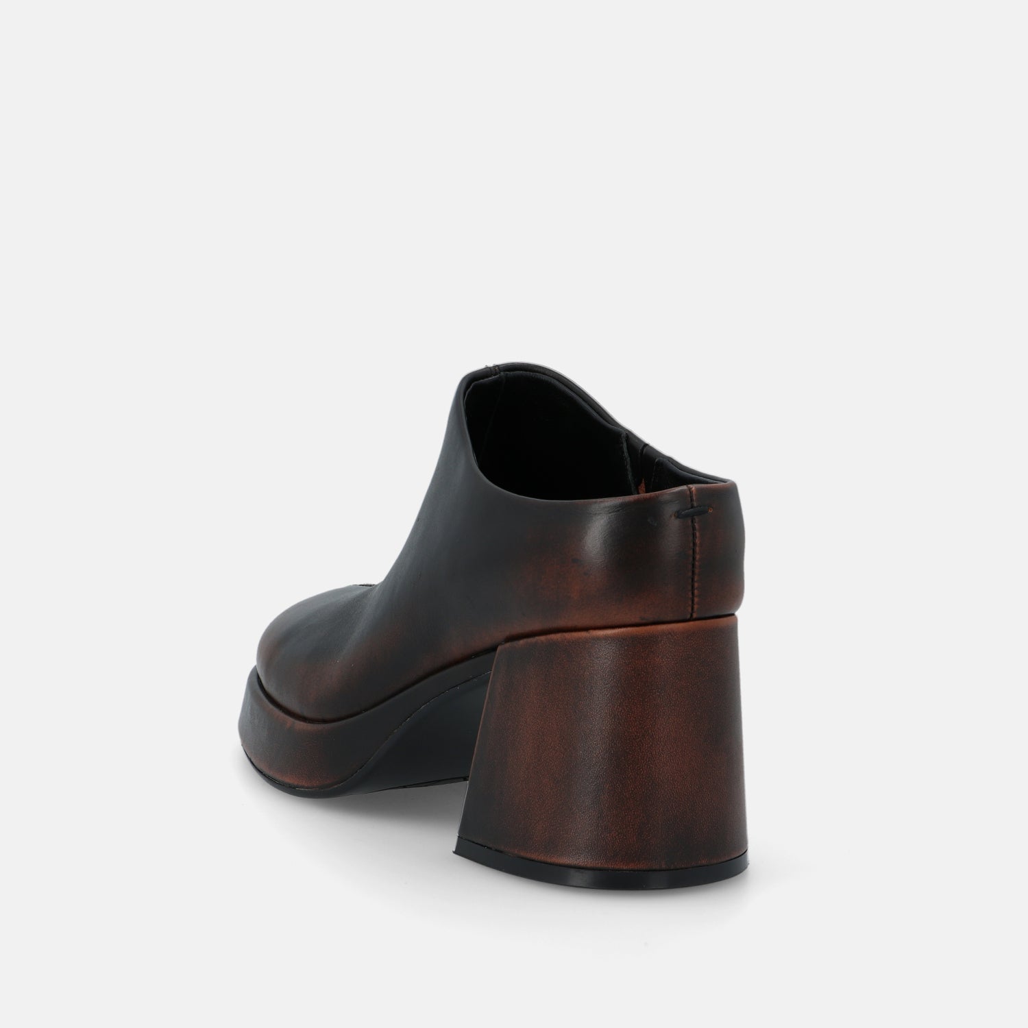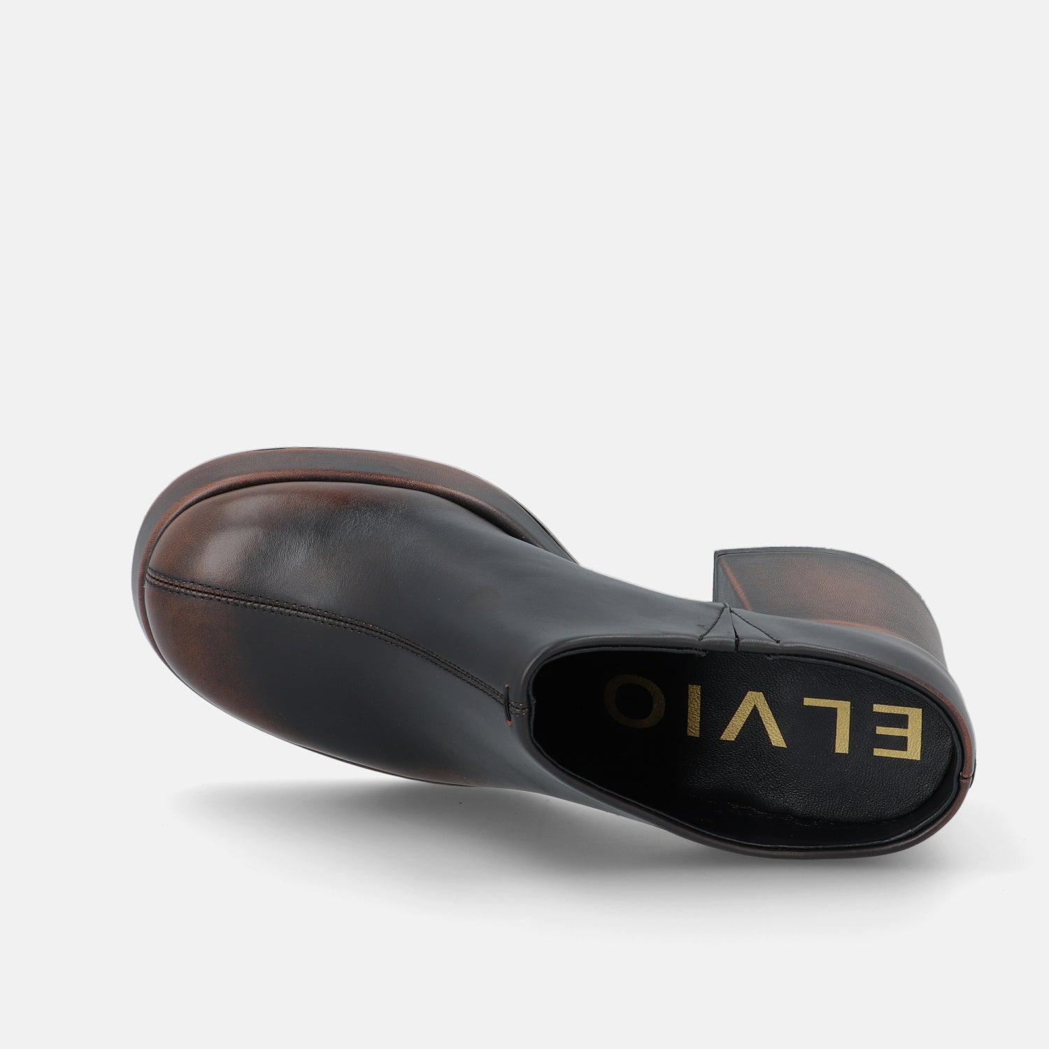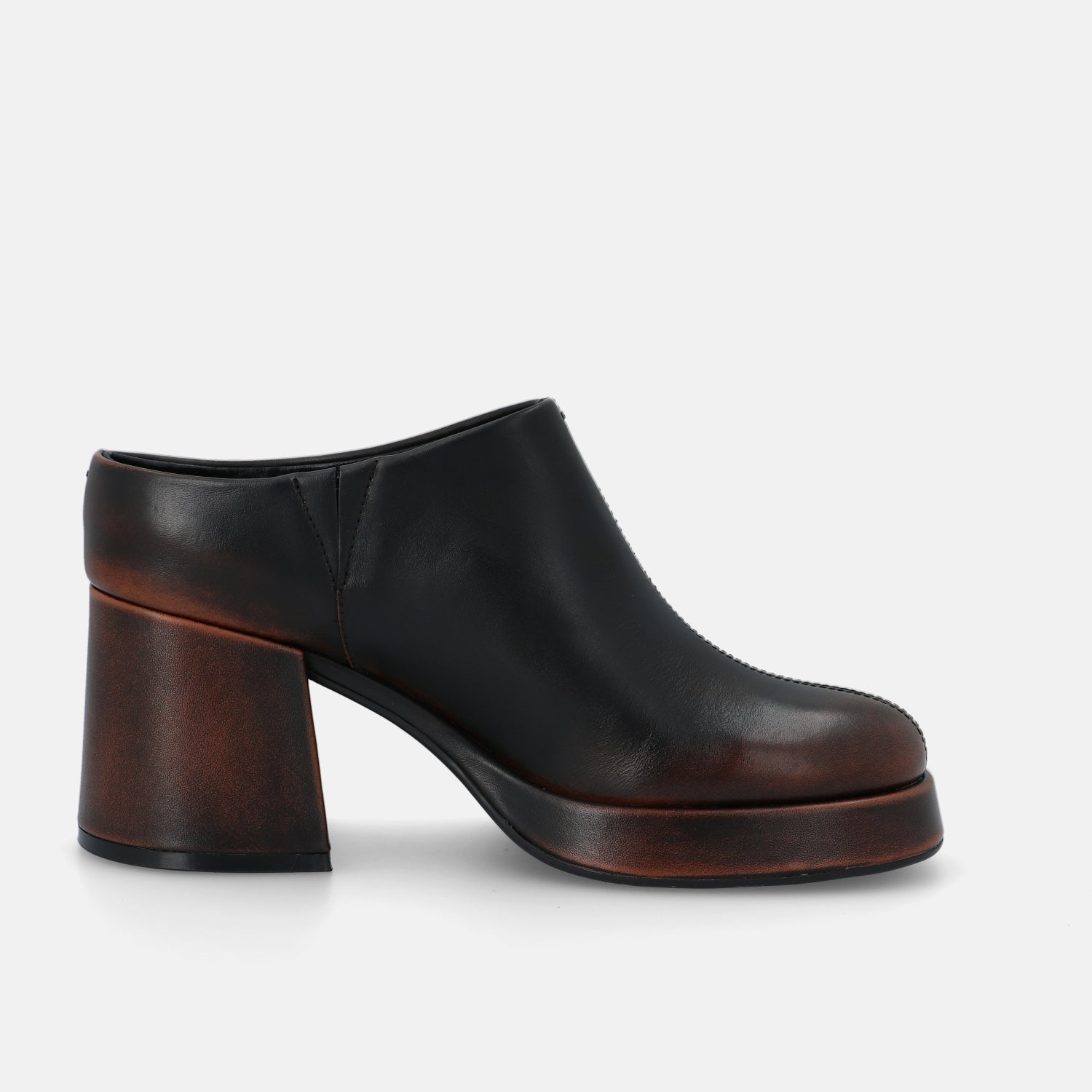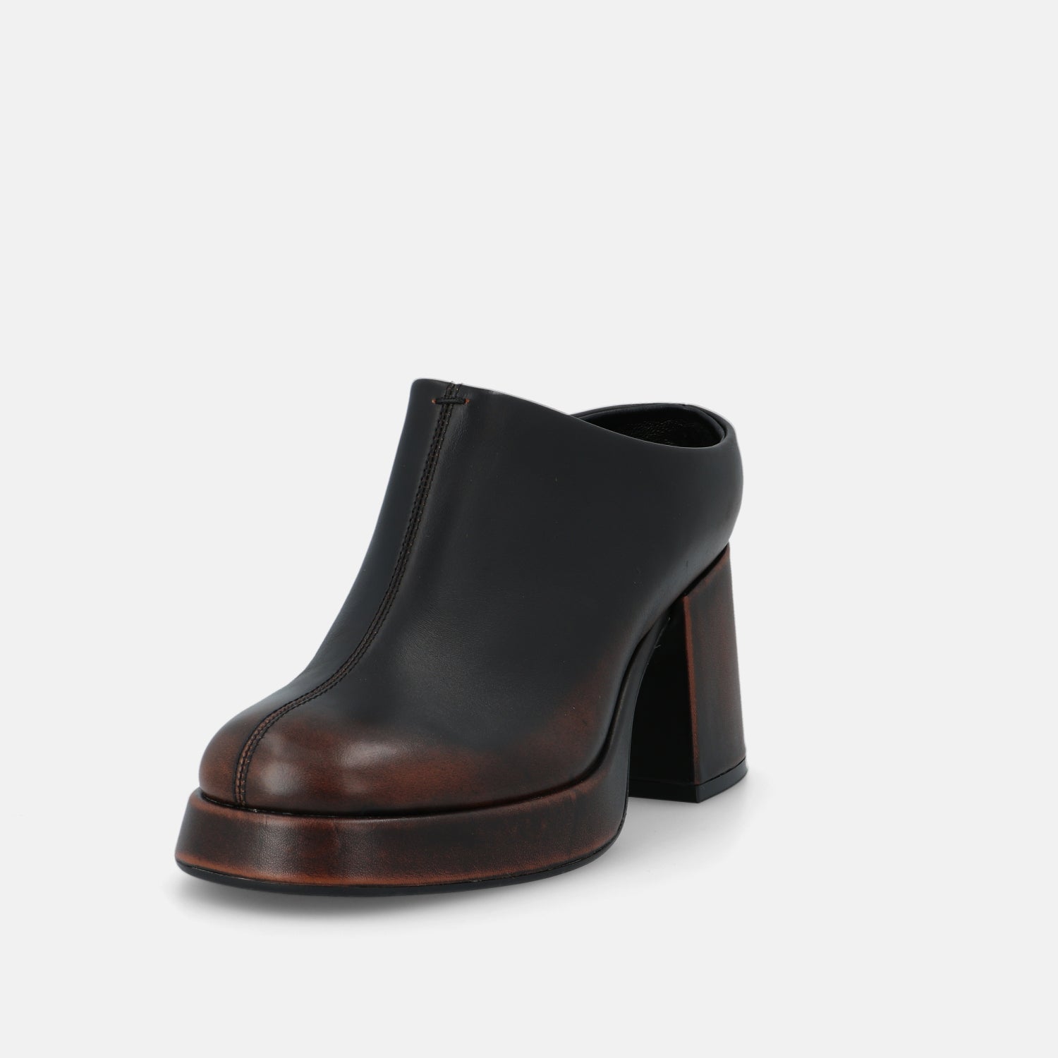 Le mules Eva Mu combinano linee essenziali e carattere deciso in una calzatura dallo stile contemporaneo. Realizzate in pelle asportata color cuoio, presentano una particolare lavorazione sfumata che crea un effetto vissuto ed elegante, esaltando la profondità della tonalità e conferendo unicità a ogni modello.