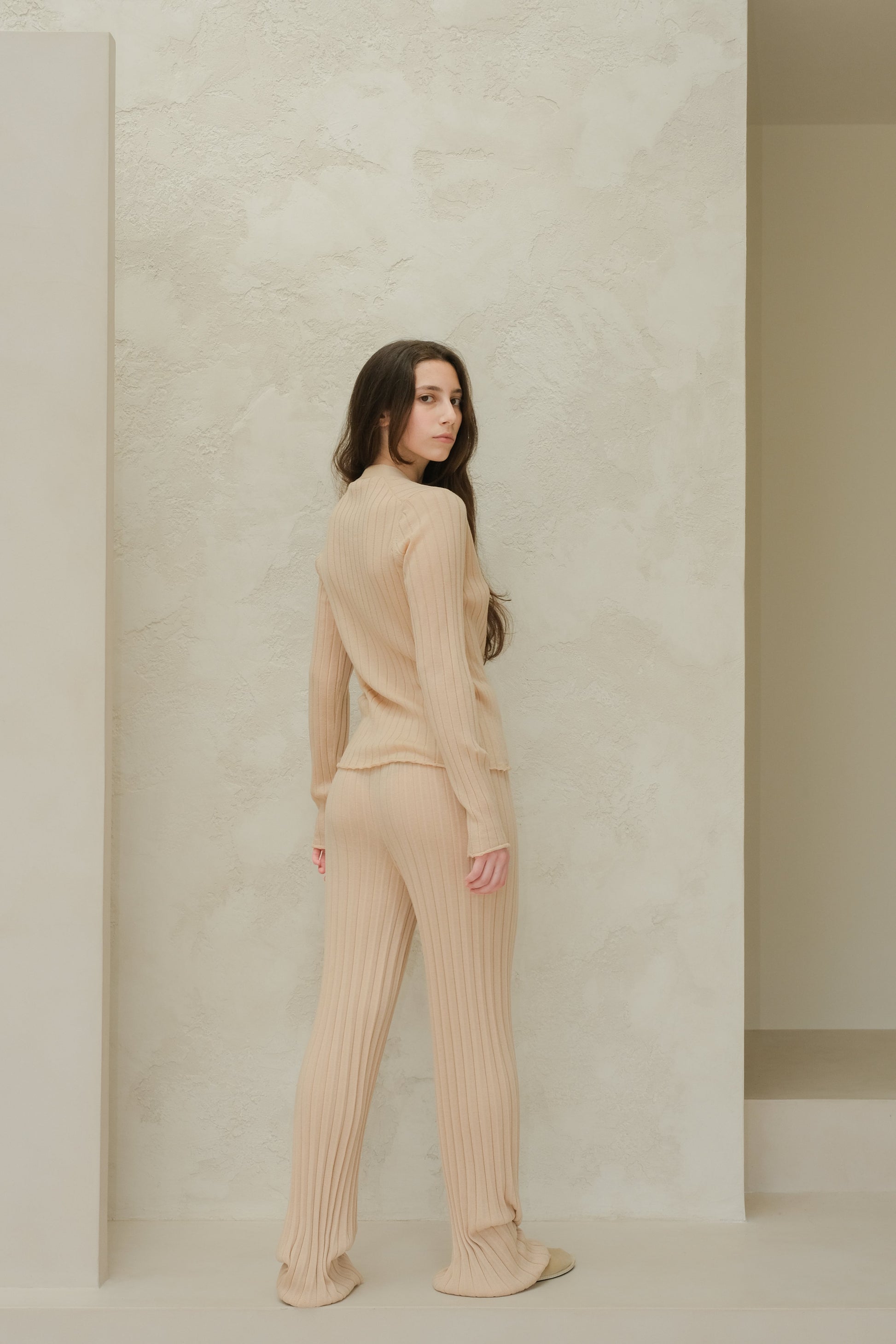 These plissé pants are knitted in seamless 3D using 100% extrafine merino wool (Cashwool®).