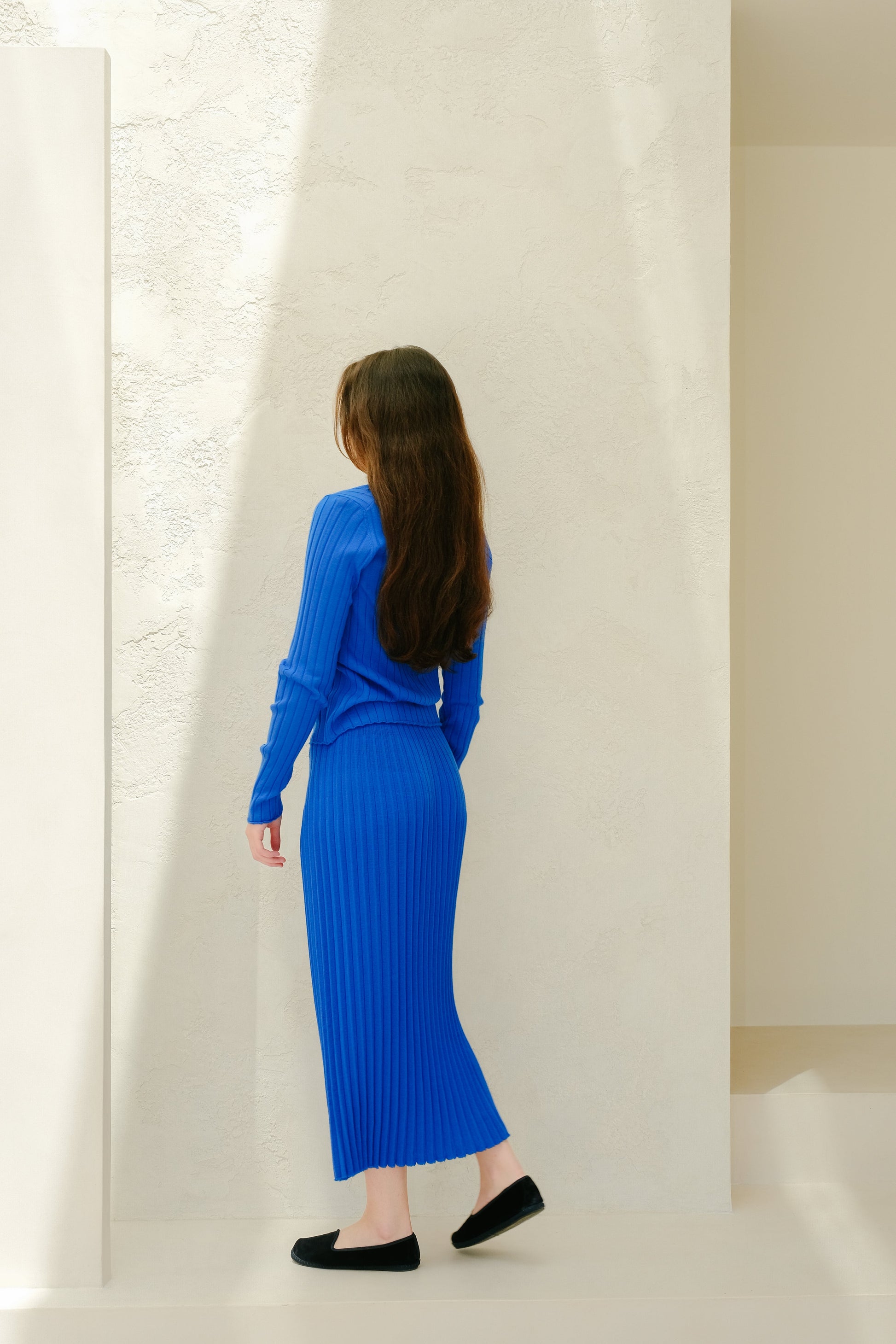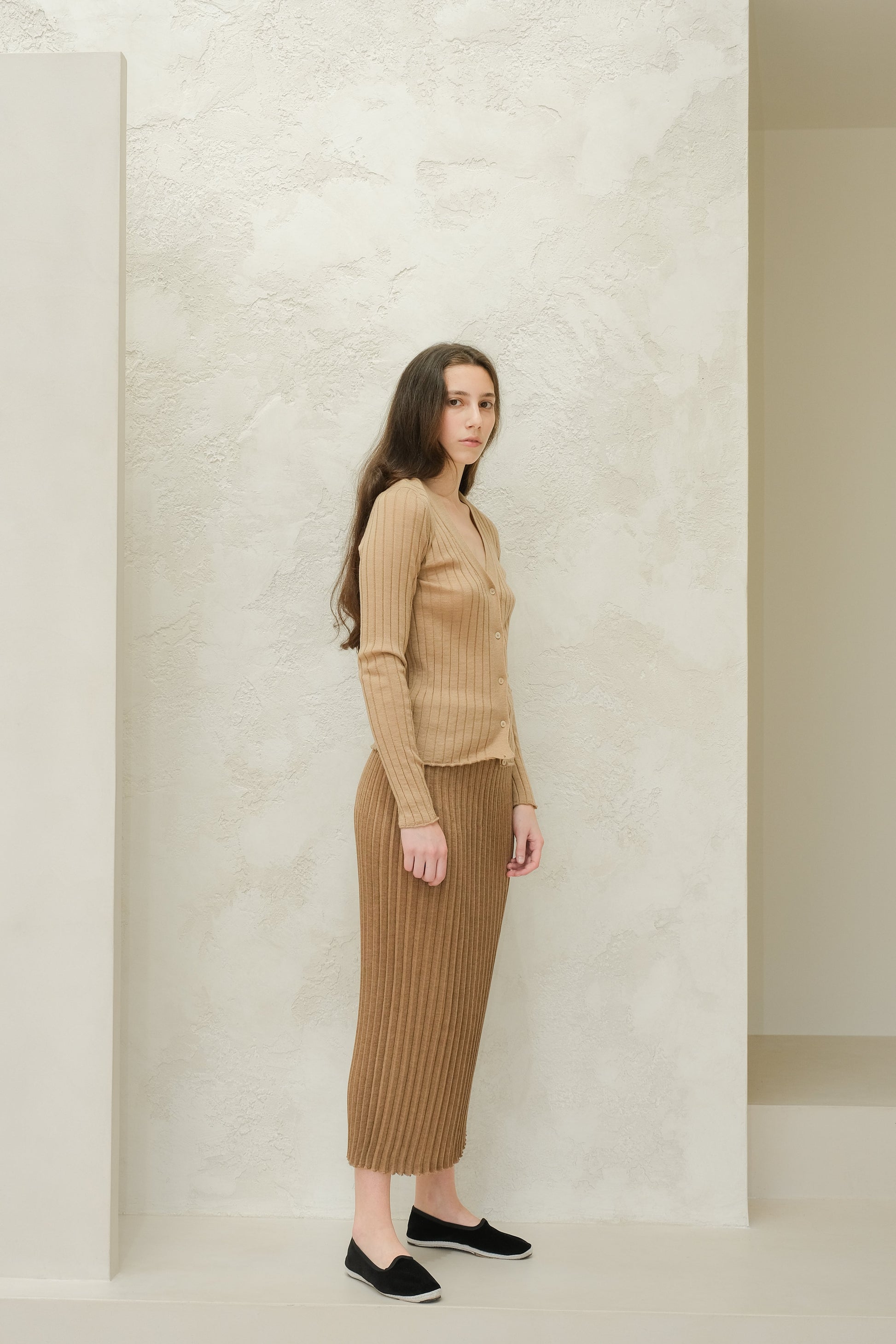 Its soft texture and refined details—mother-of-pearl buttons and wide ribbed body —make it a warm and versatile layer throughout the season.