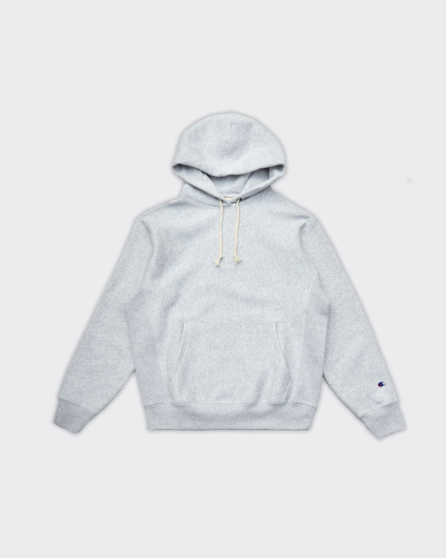 Felpa grigia con cappuccio e coulisse, tasca frontale a marsupio, logo ricamato sulla manica