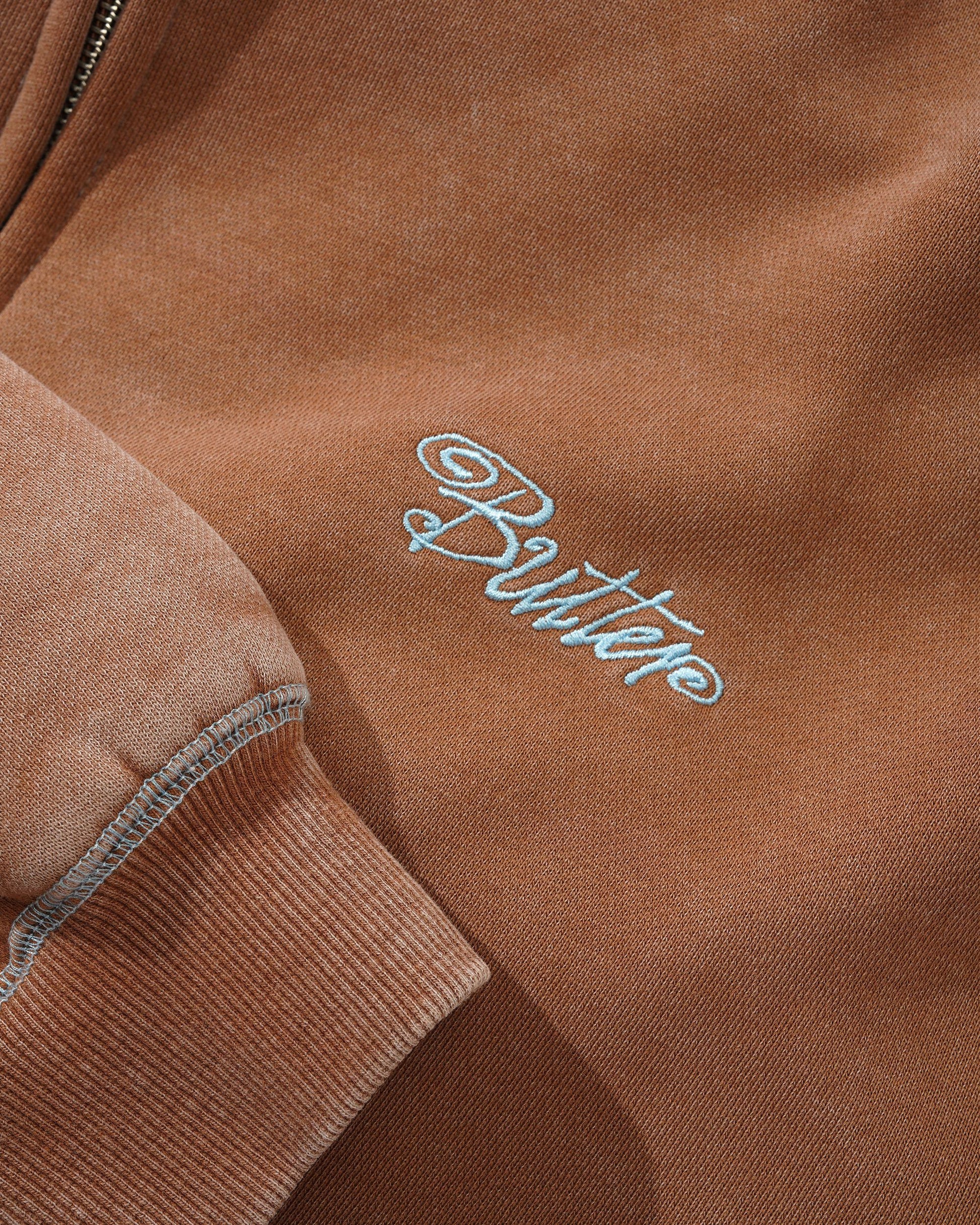 Felpa marrone con zip frontale, ricamo sul petto a sinistra. Materiale a effetto lavato, tasche a marsupio, cappuccio.