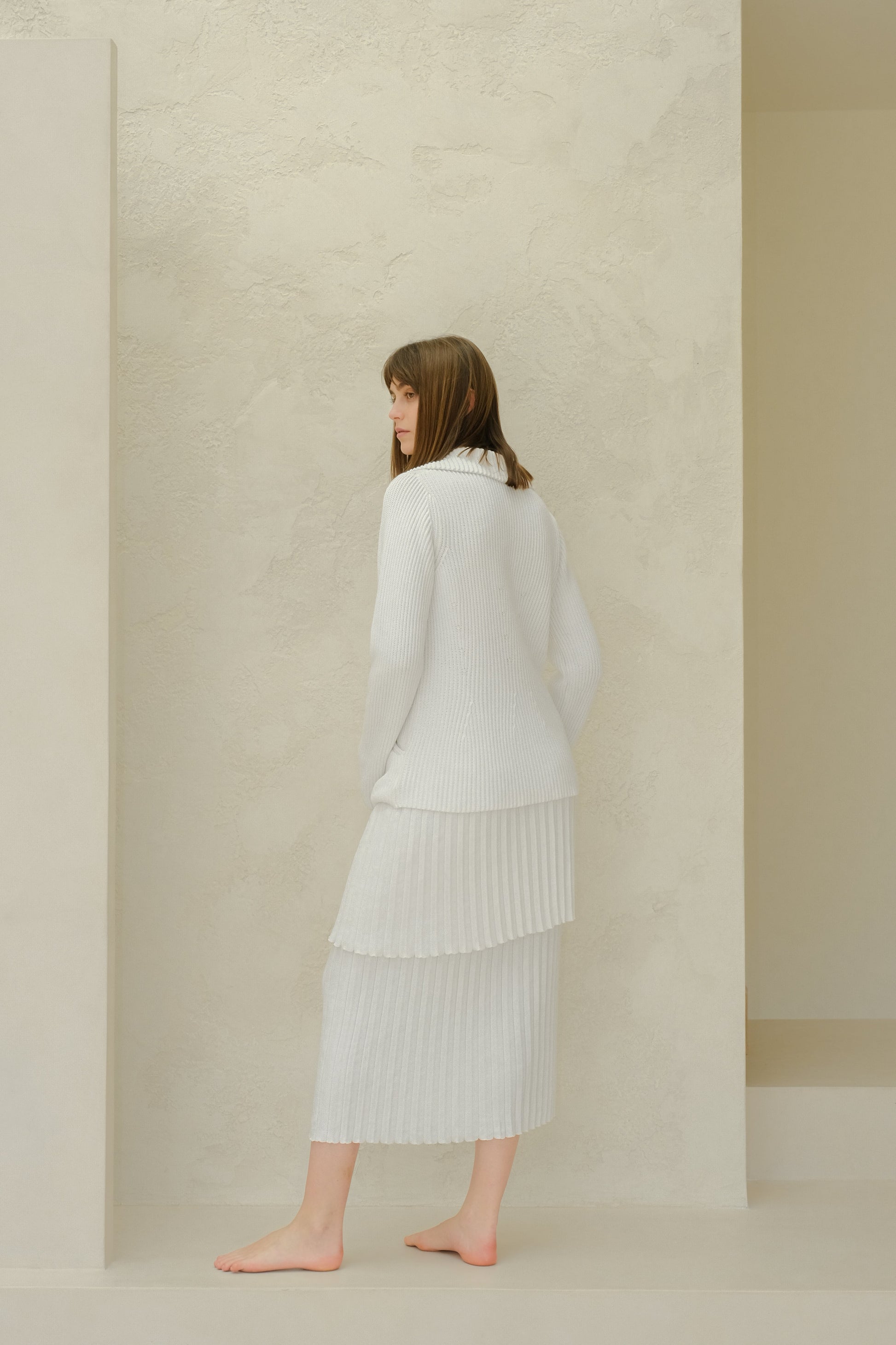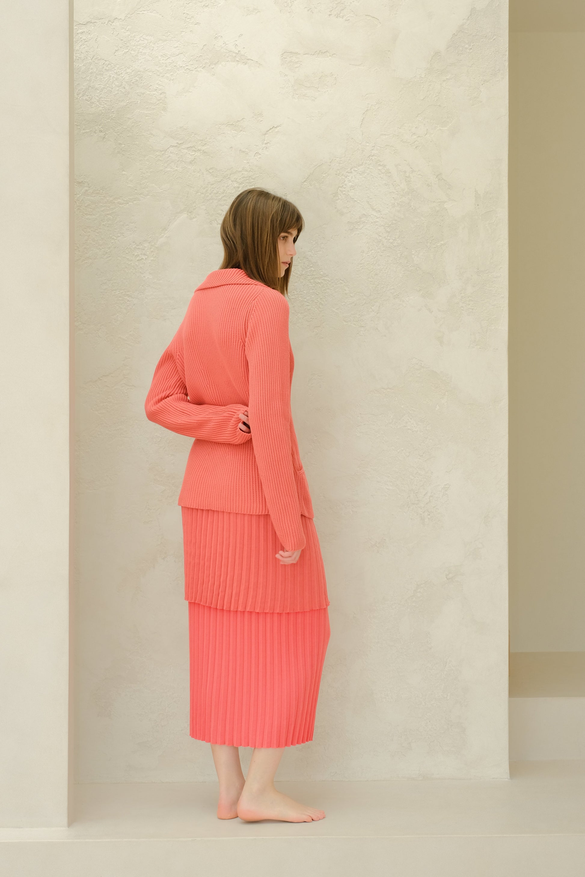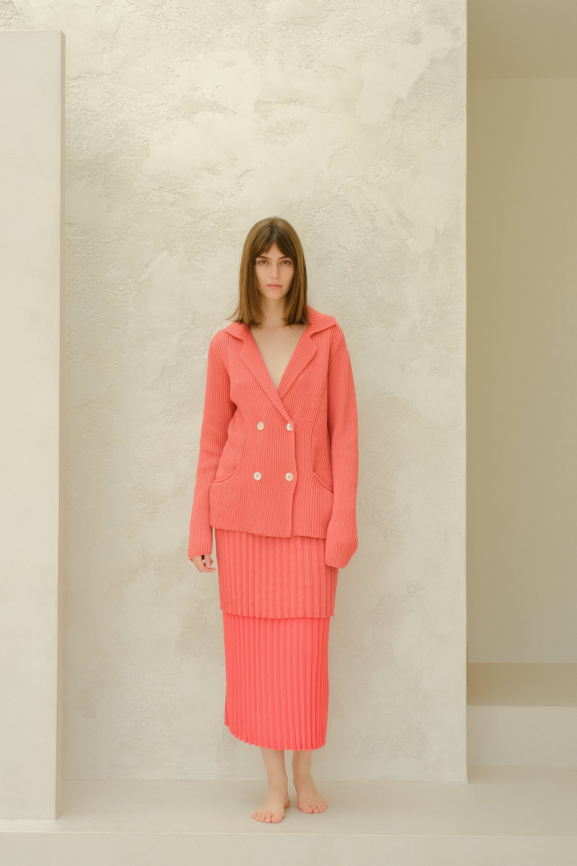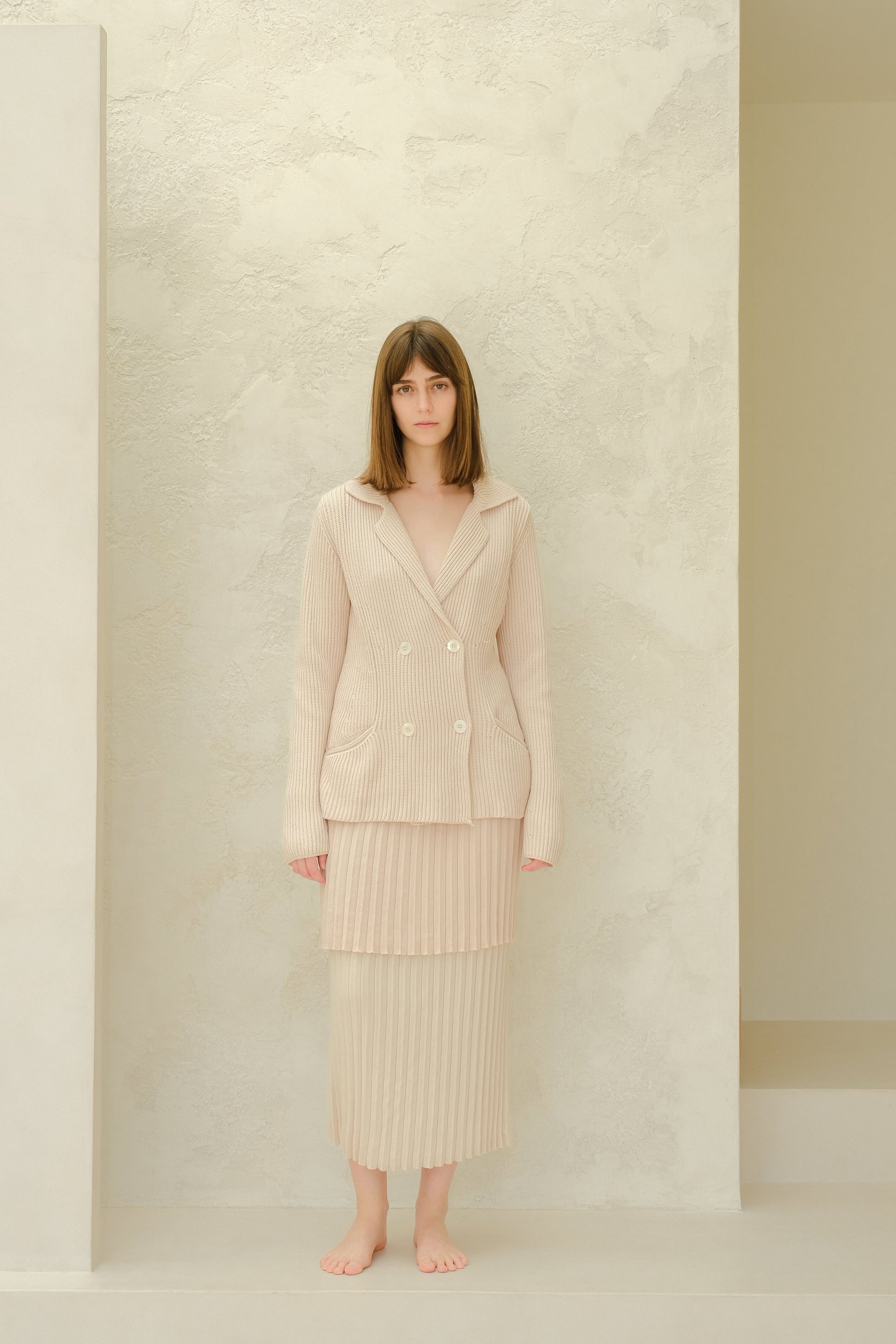 The savoir-faire of the double breasted jacket in a new knit version. This style combines elegance and comfort, freedom and movement, with a casual style that elevates allure. This must-have trascends fashions and generations, affirming its iconic status.