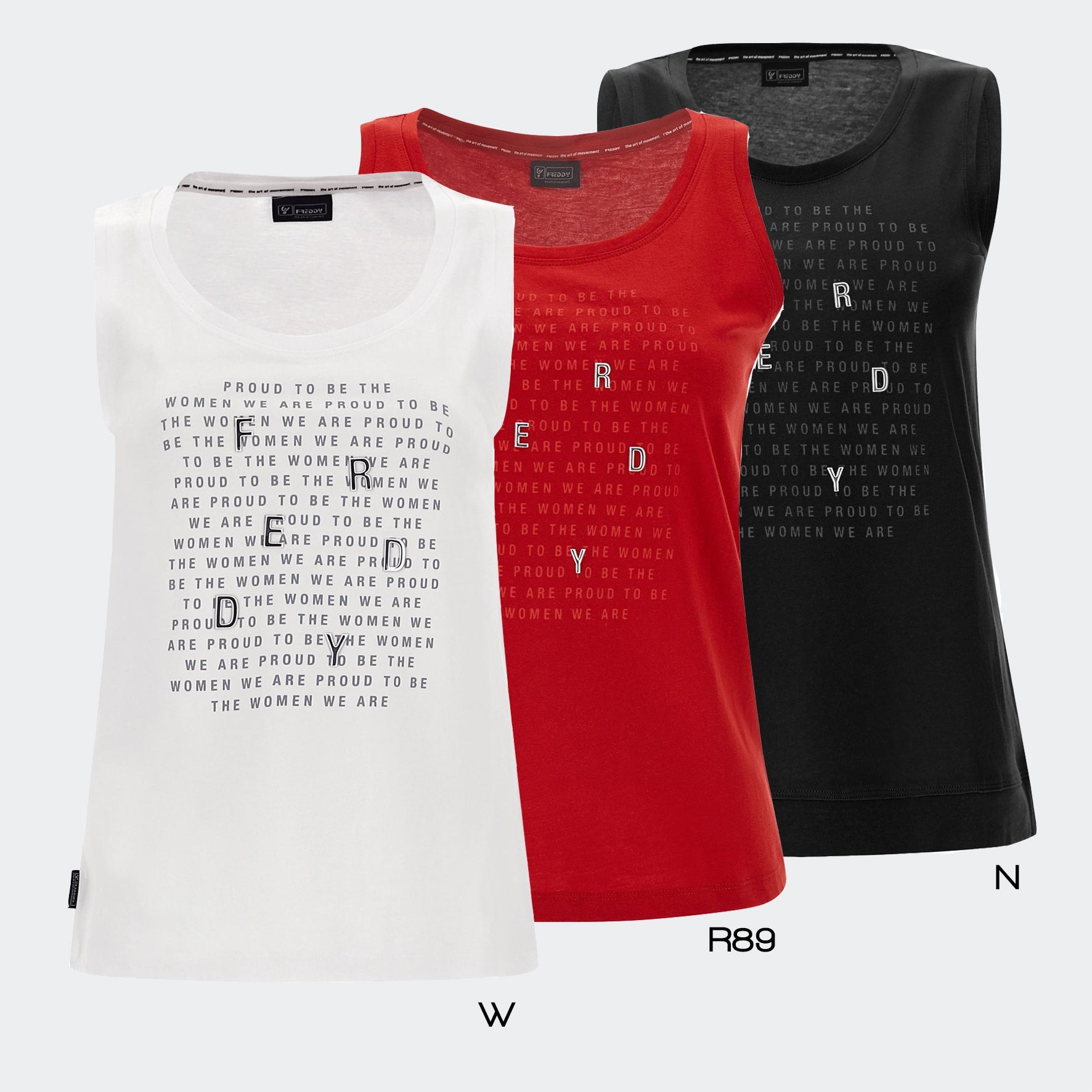 Canotta con vestibilità regular leggermente ampia decorata frontalmente dalla stampa composita con scritta PROUD TO BE THE WOMEN WE ARE ripetuta a loop e il logo Freddy destrutturato spessorato in colore argento sovrapposto. Ha scollo ampio rotondo, girospalla ampio e fondo dritto. La naturale morbidezza del tessuto sottolinea il piacere per la comodità e la libertà di movimento di questo capo dalla personalità decisa perfetto per completare outfit dinamici.