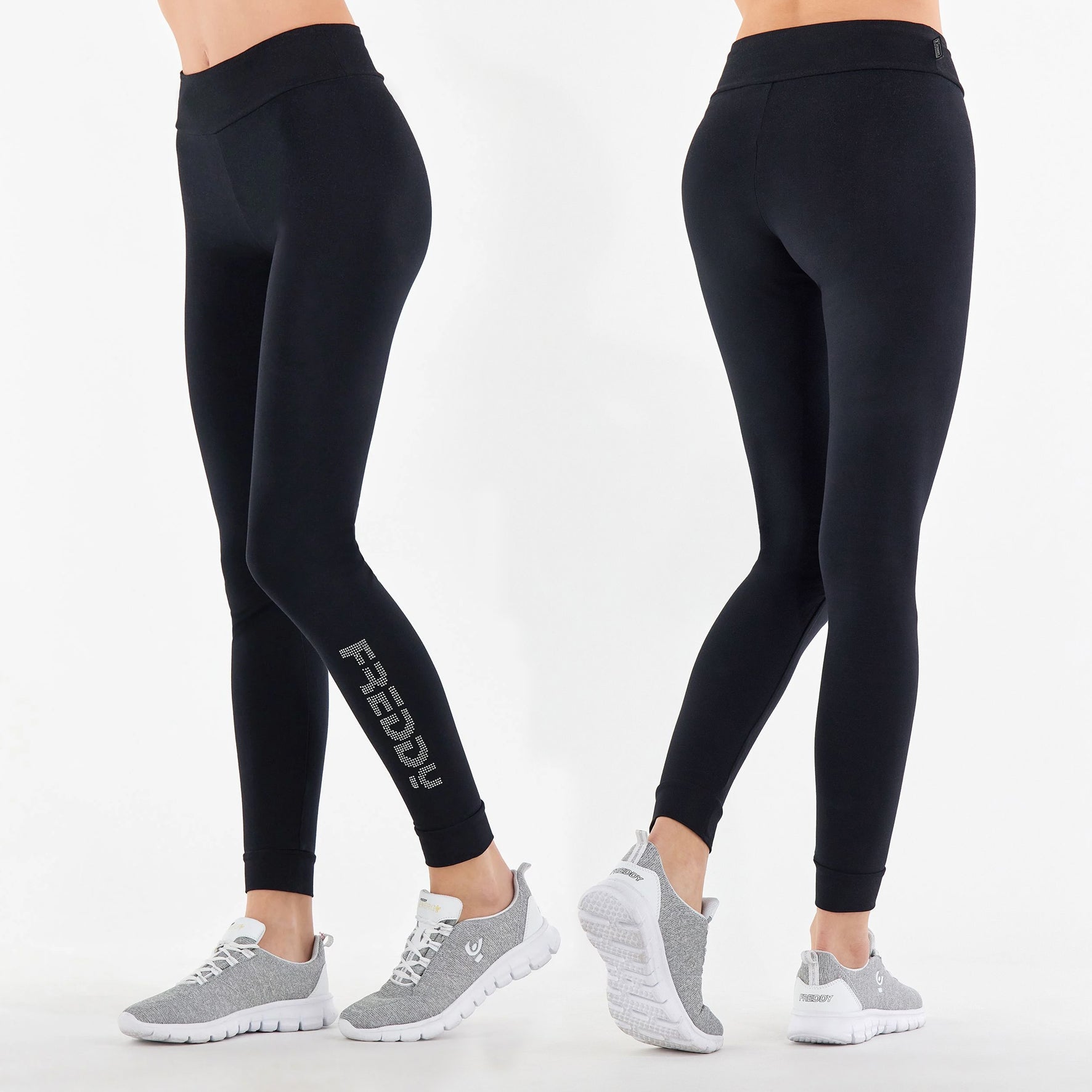 Leggings a vita alta con fondo a polsino decorati sul fondo della gamba sinistra dal logo Freddy in strass in colore argento. Il design che favorisce la tenuta si unisce alla flessibilità del tessuto in jersey pesante elasticizzato nel seguire le linee del corpo senza costrizioni donando ampiezza di movimento. Capo ideale per il fitness e lo sport in generale ma anche per il tempo libero dinamico che apprezza la comodità con stile.