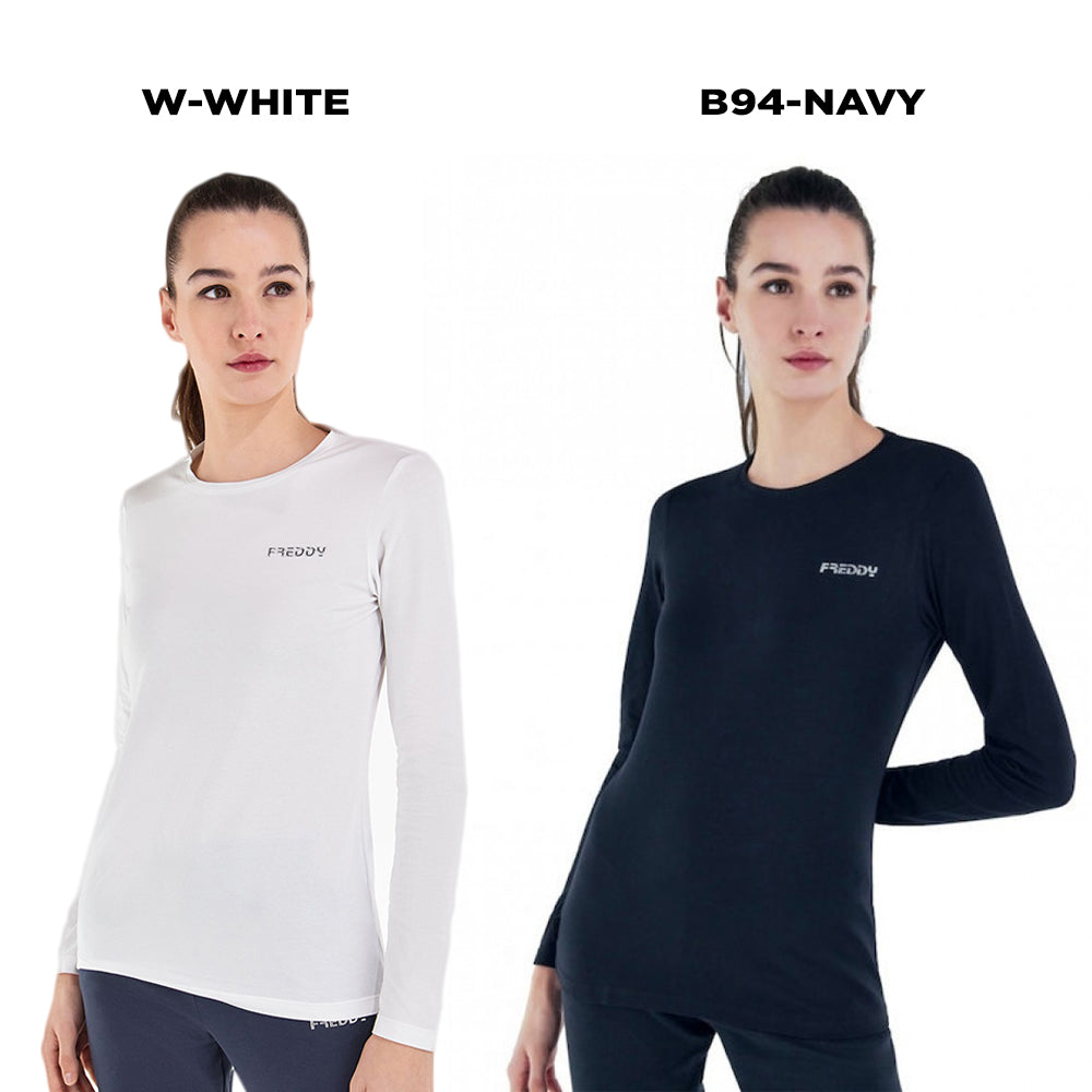 T-shirt a manica lunga in jersey di cotone elasticizzato che segue morbidamente le linee del corpo e dona una piacevole ampiezza di movimento. Ha scollo a girocollo, fondo dritto e vestibilità regular. Il piccolo logo spessorato Freddy in colore argento sul fronte completa i dettagli in linea con lo stile minimal ed essenziale di questo capo versatile, perfetto per completare outfit sportivi e per il tempo libero all’insegna della comodità.