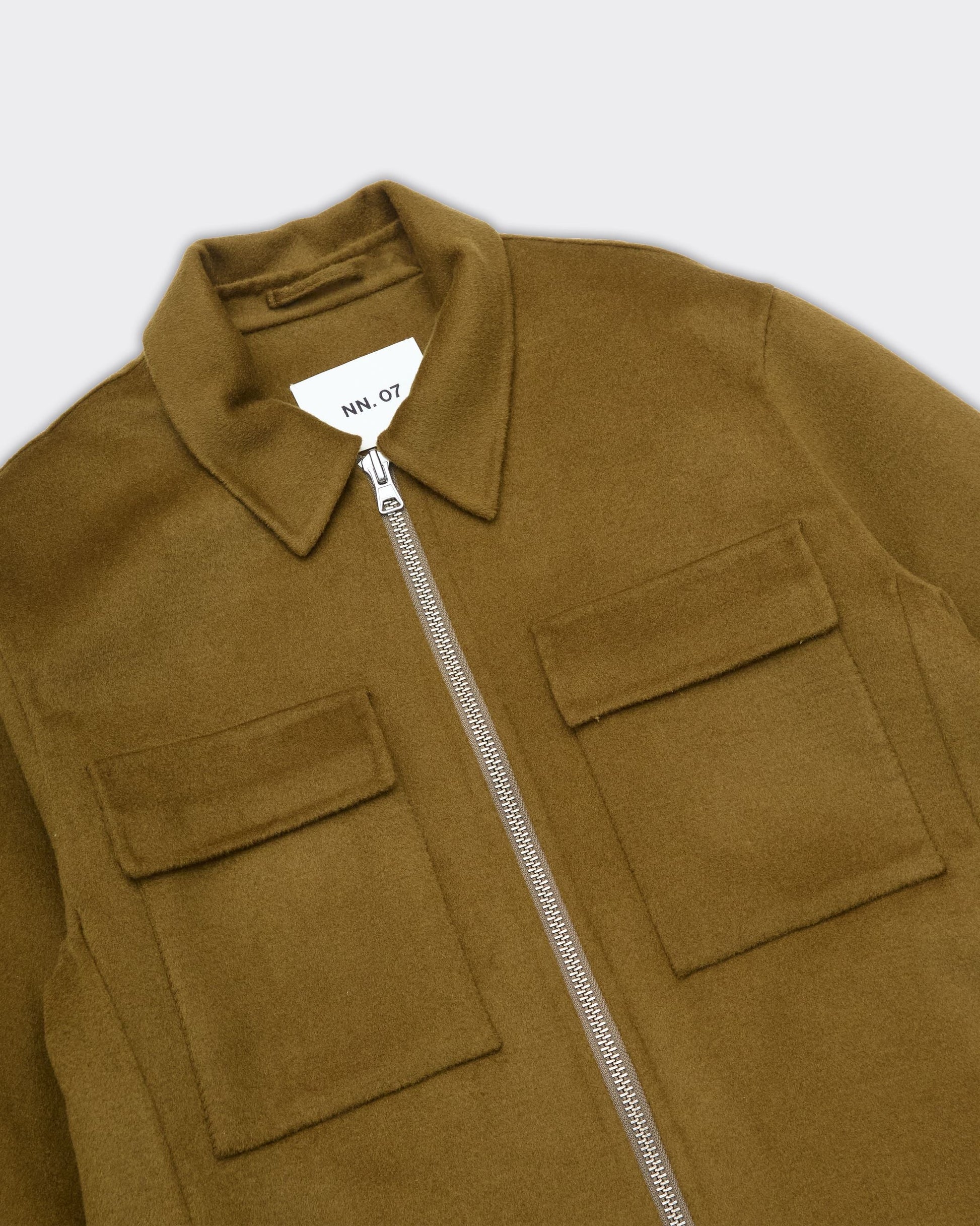 Giacca lunga fino ai fianchi, realizzata in misto lana double-face spazzolata con trama semplice. Presenta due tasche oblique sul petto, bottoni in finto corno e cerniera con logo.