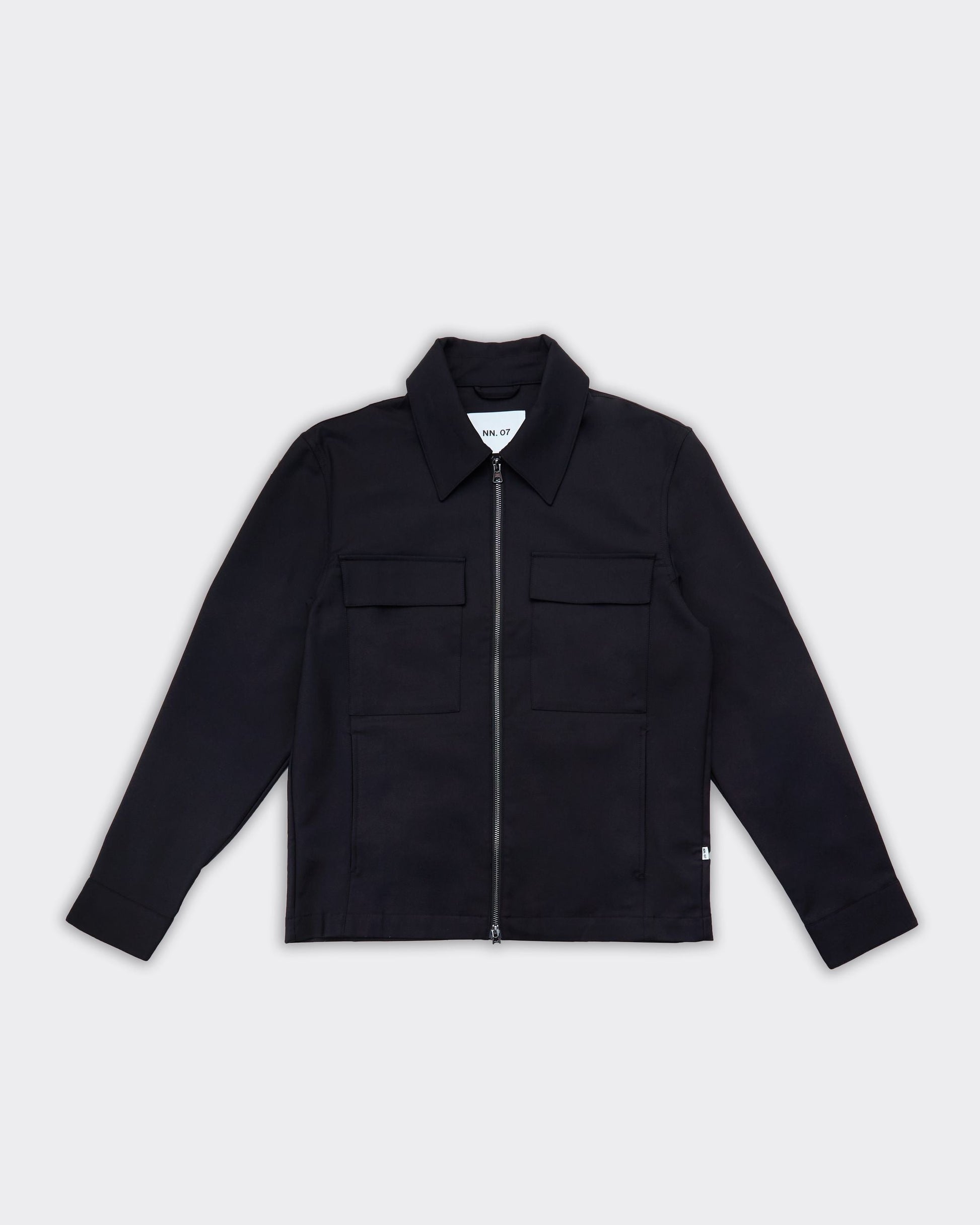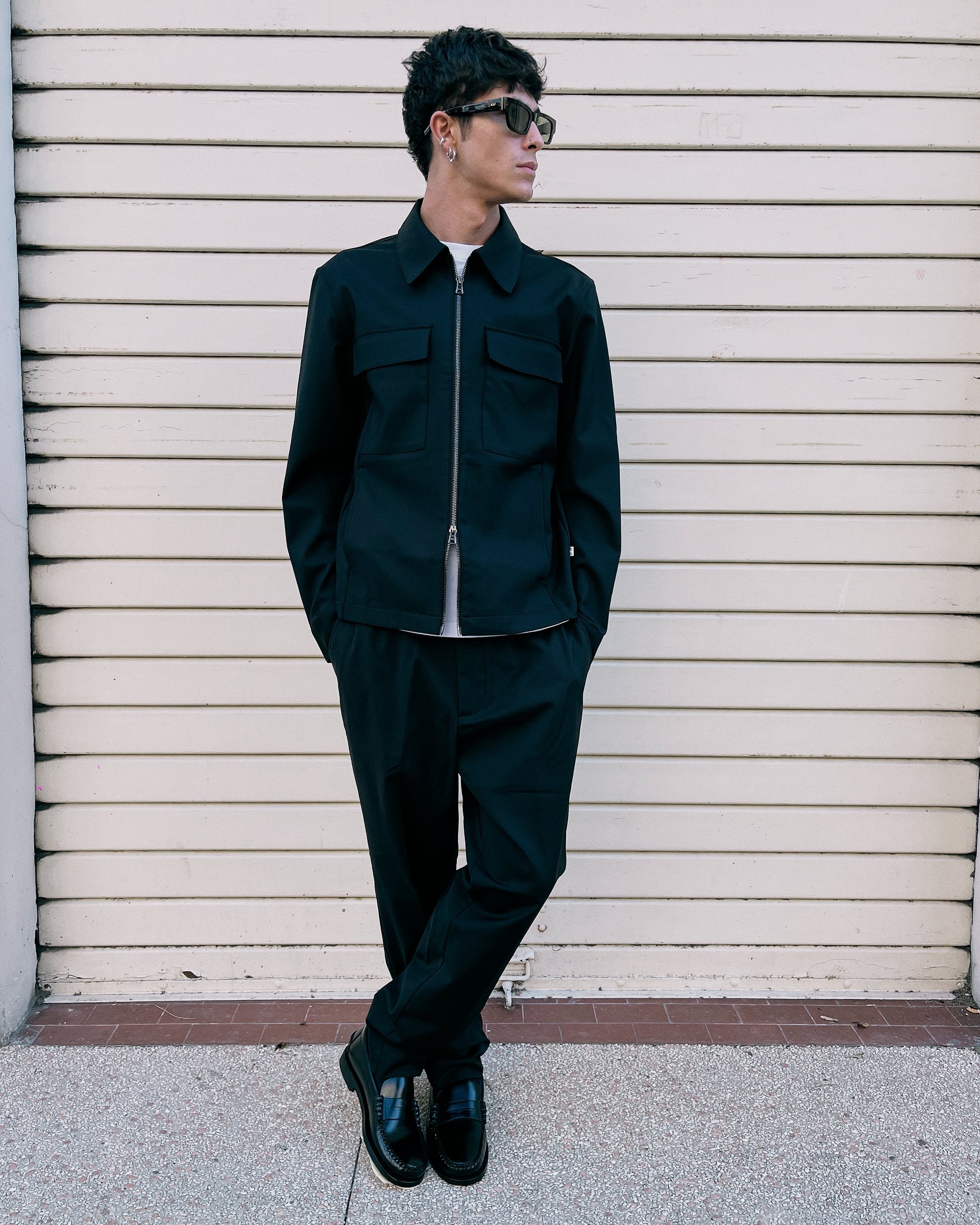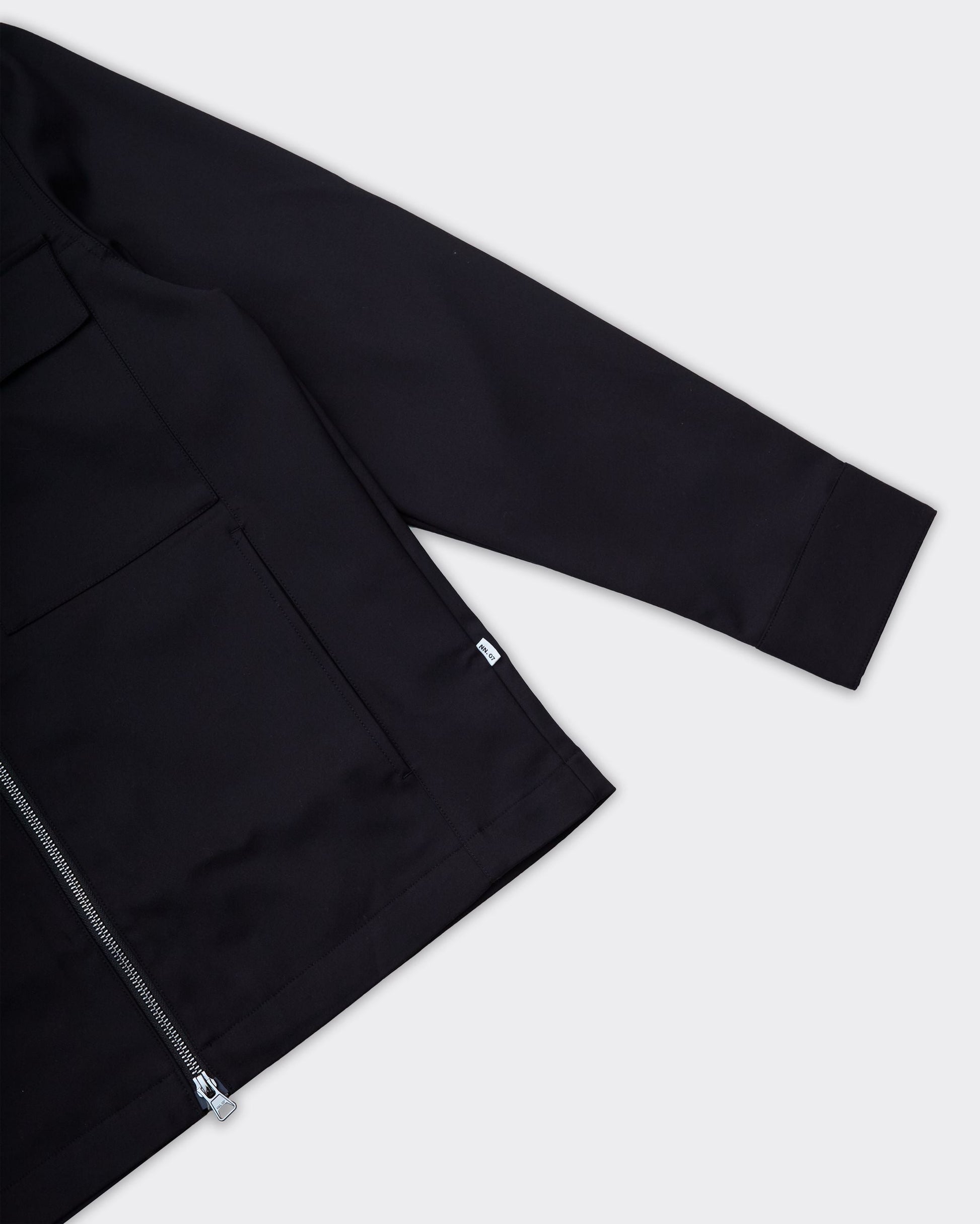 Giacca nera con due tasche frontali a pattina, chiusura a cerniera centrale. Collo classico e maniche lunghe.