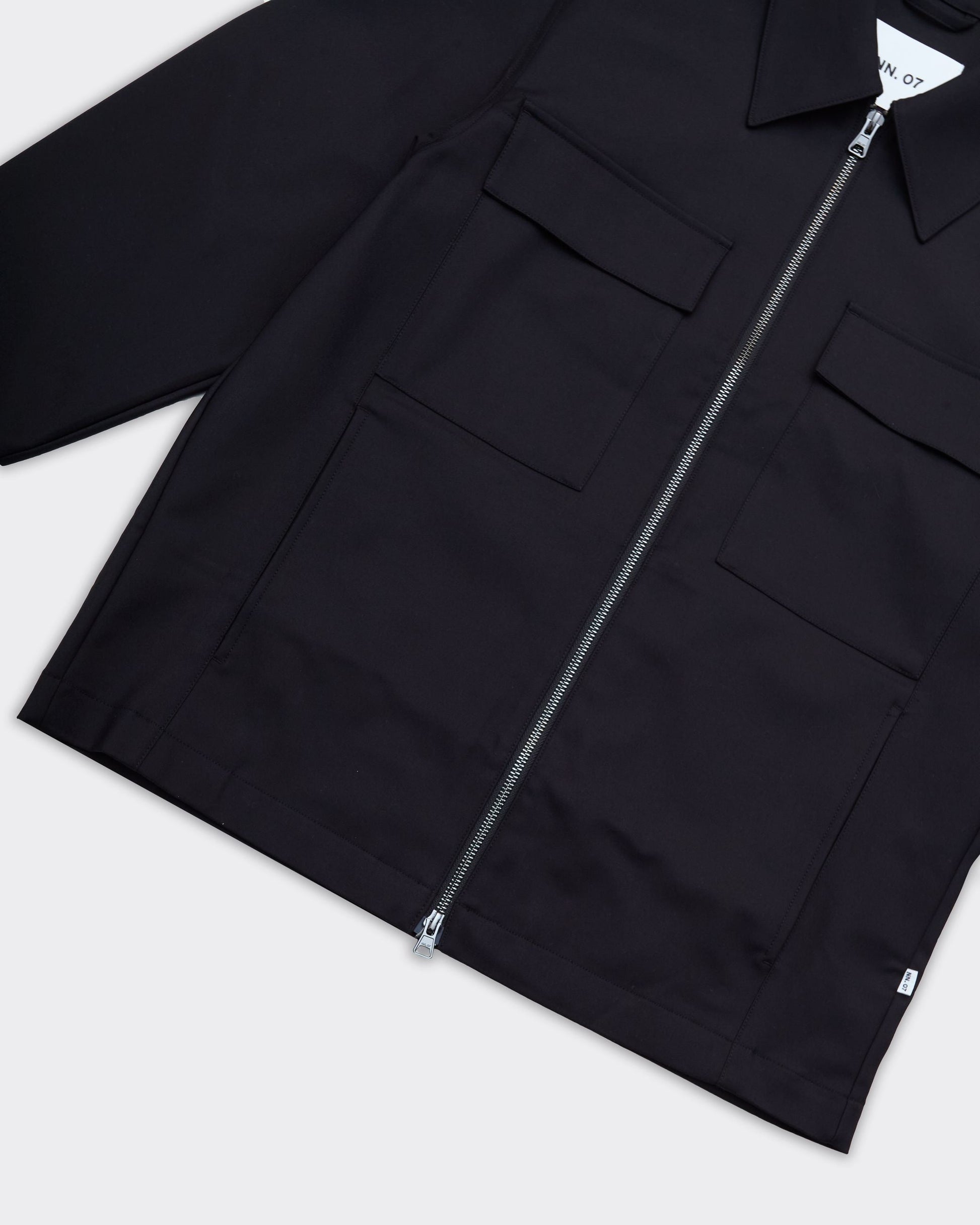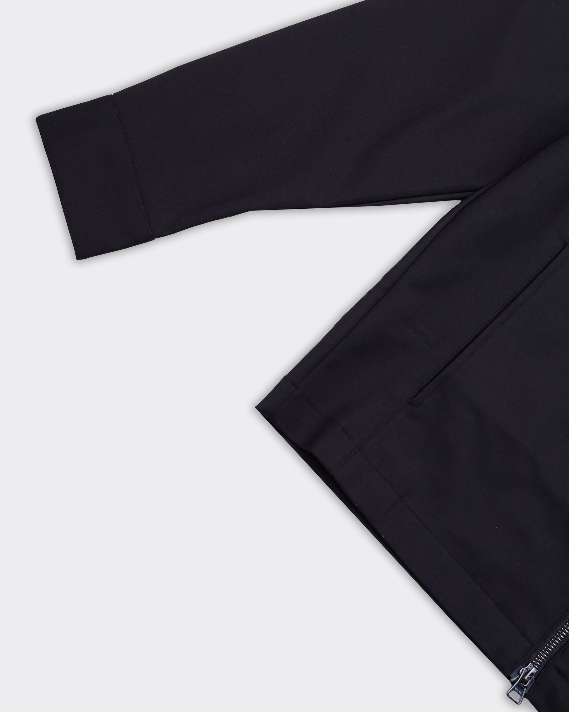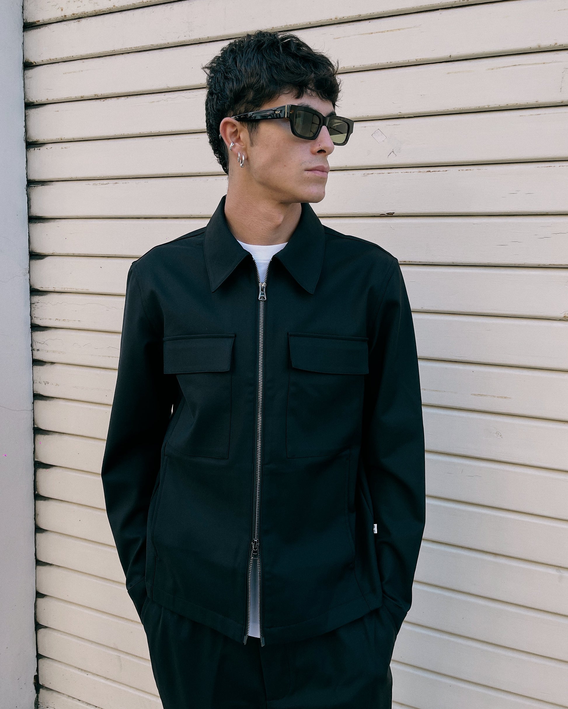 Giacca nera con due tasche frontali a pattina, chiusura a cerniera centrale. Collo classico e maniche lunghe.