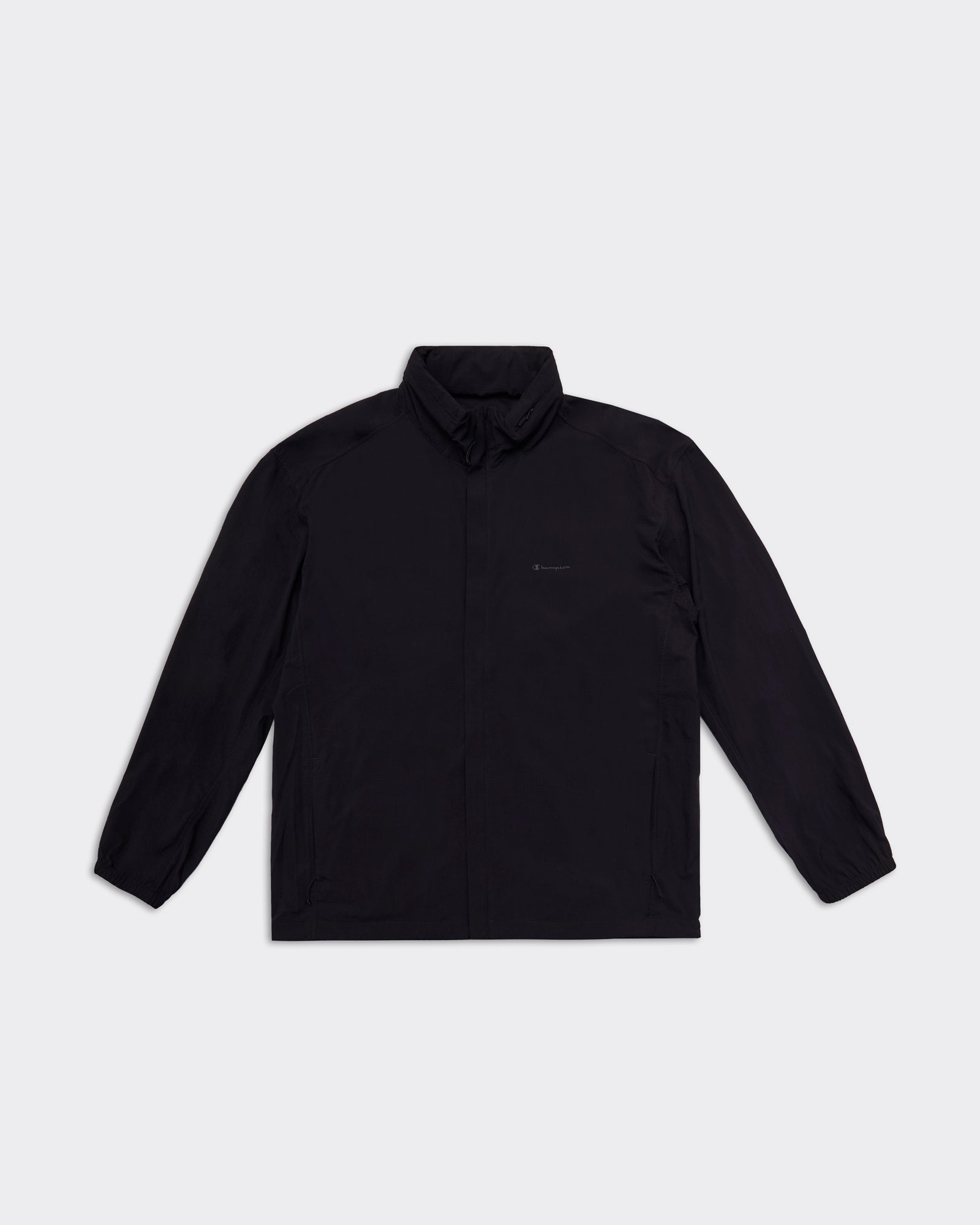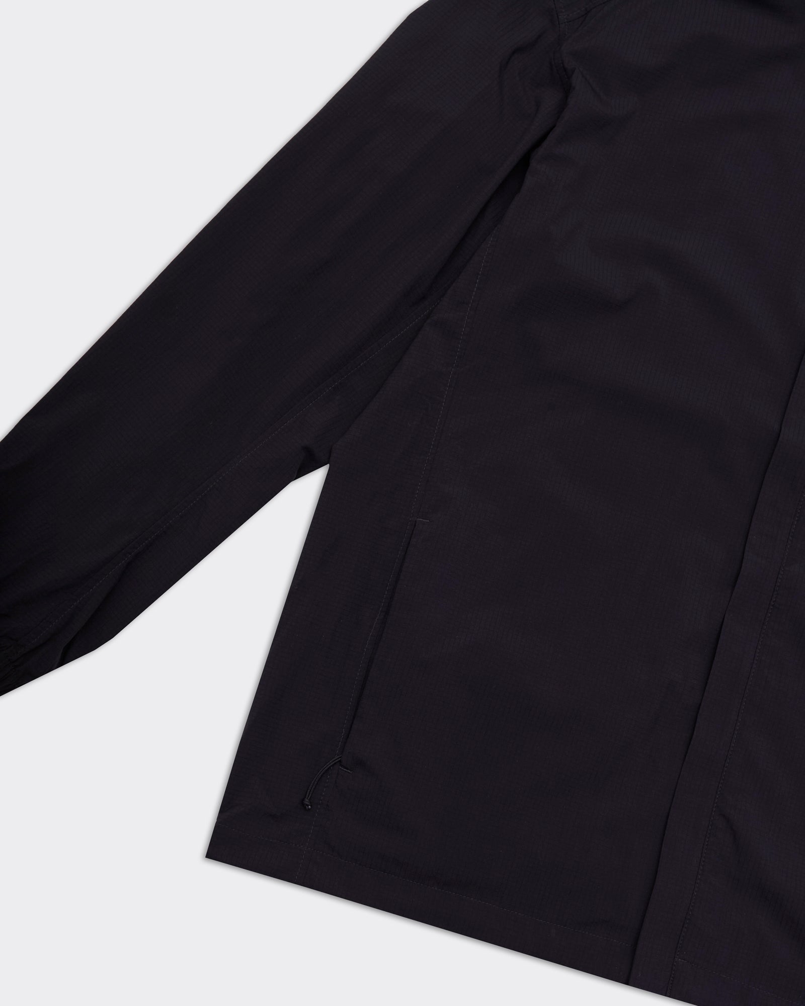 Giacca nera in tessuto ripstop con cappuccio. Logo ricamato sul petto.