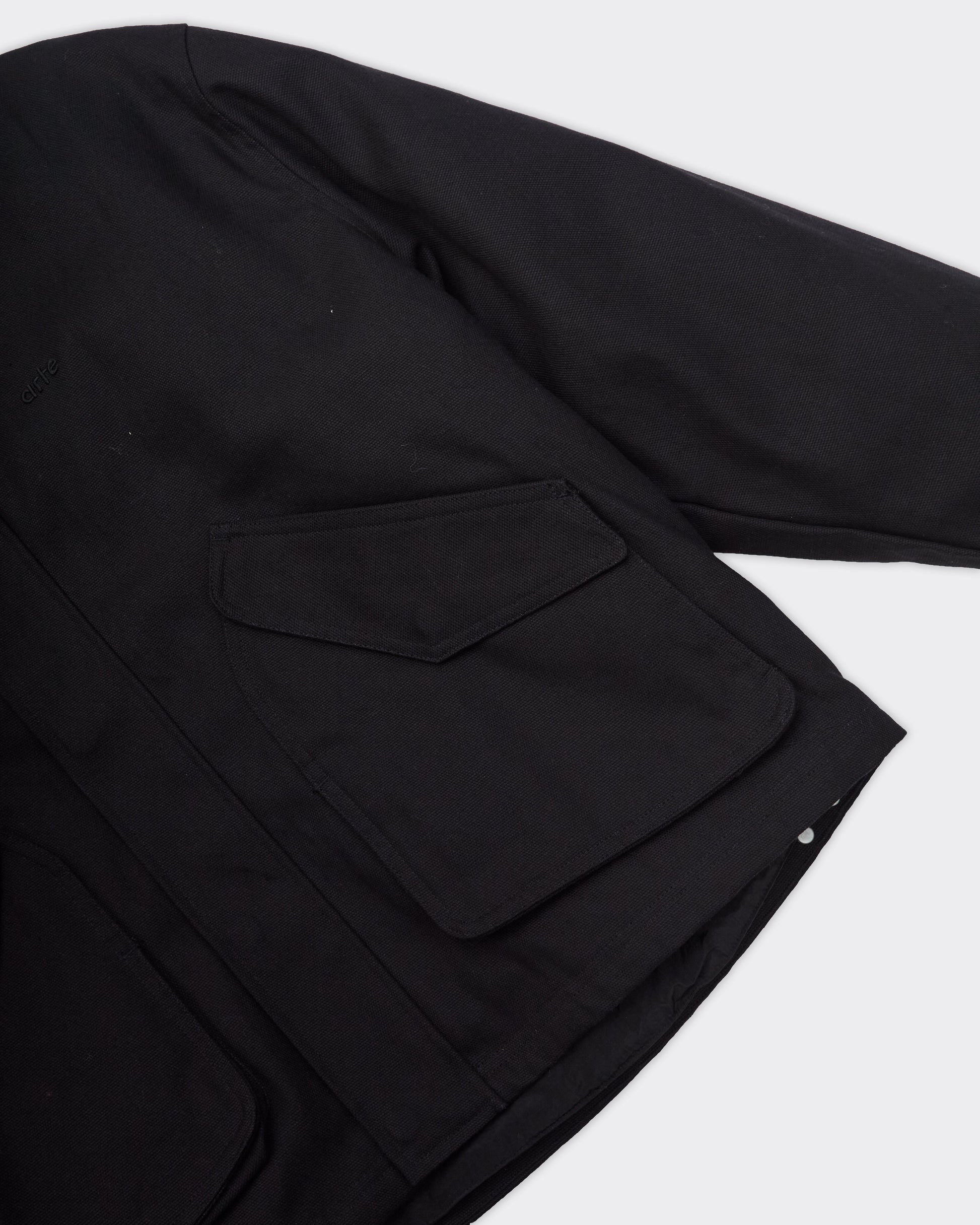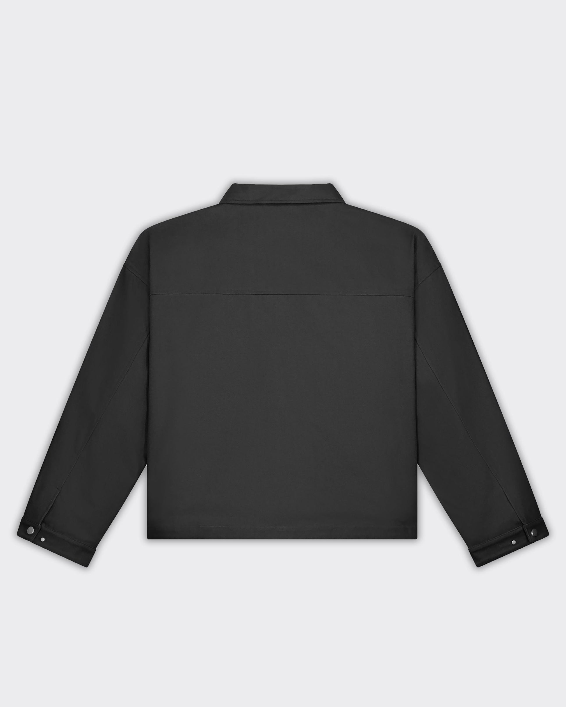 Giacca nera con tasche inclinate sul fronte e chiusura a bottoni. Logo ricamato sul petto. Tessuto liscio e resistente.