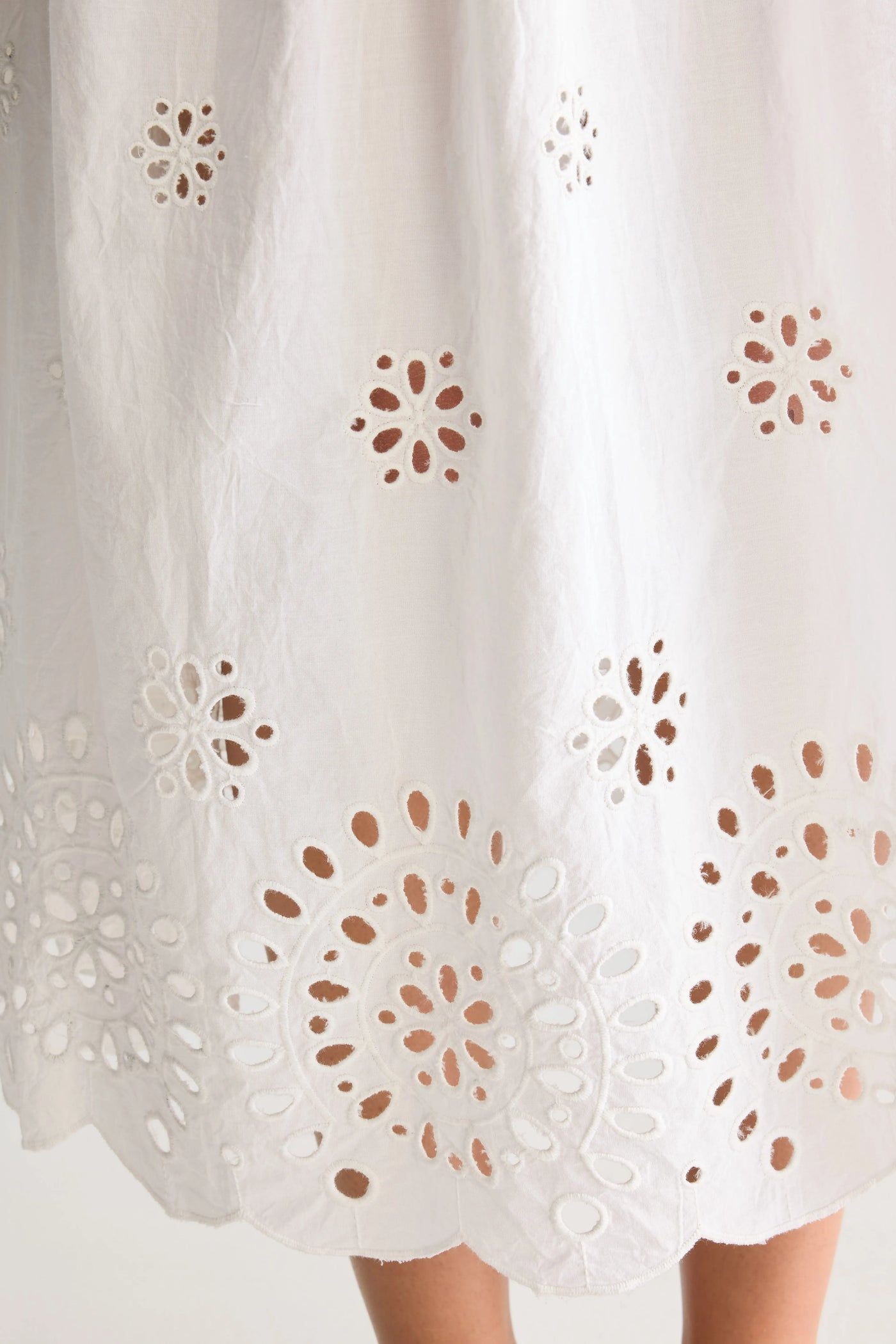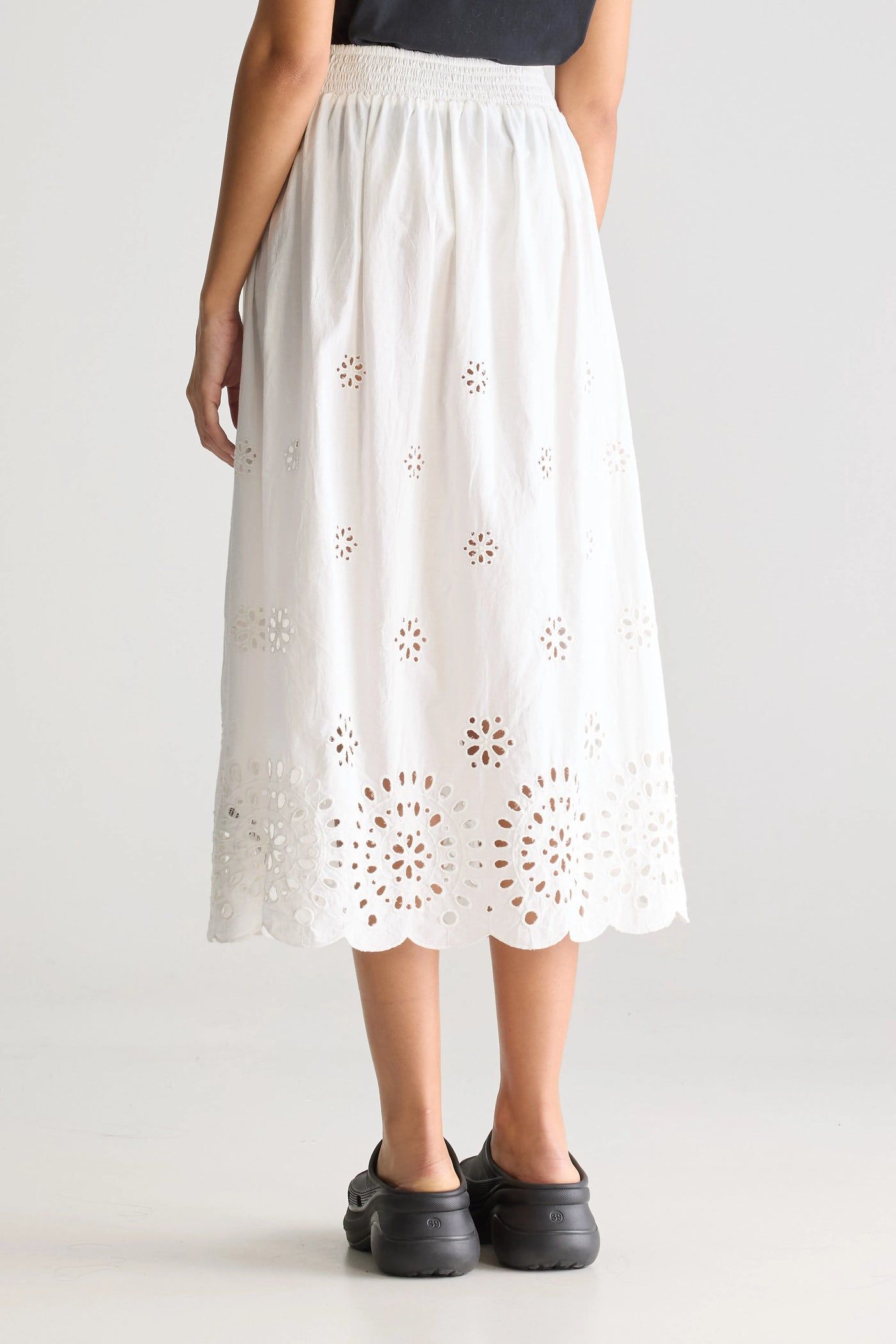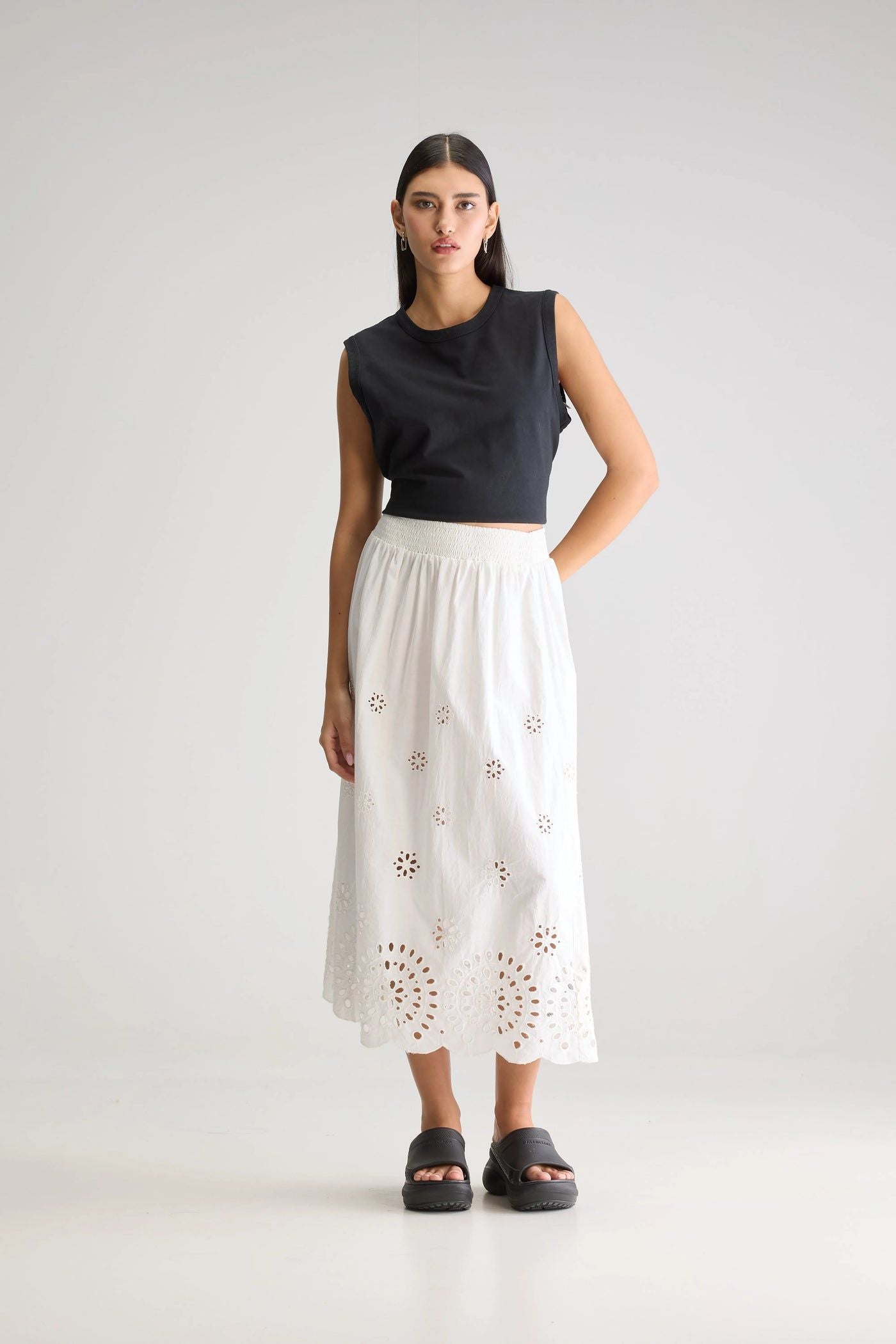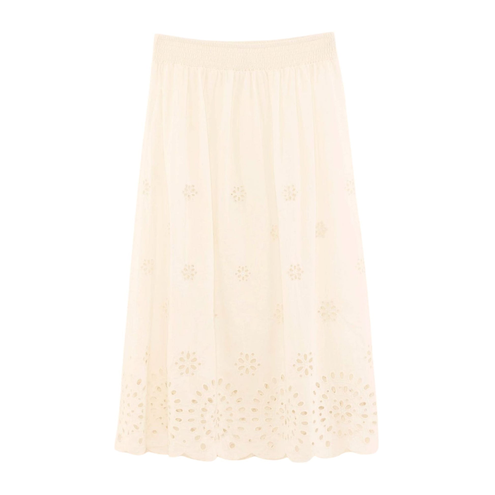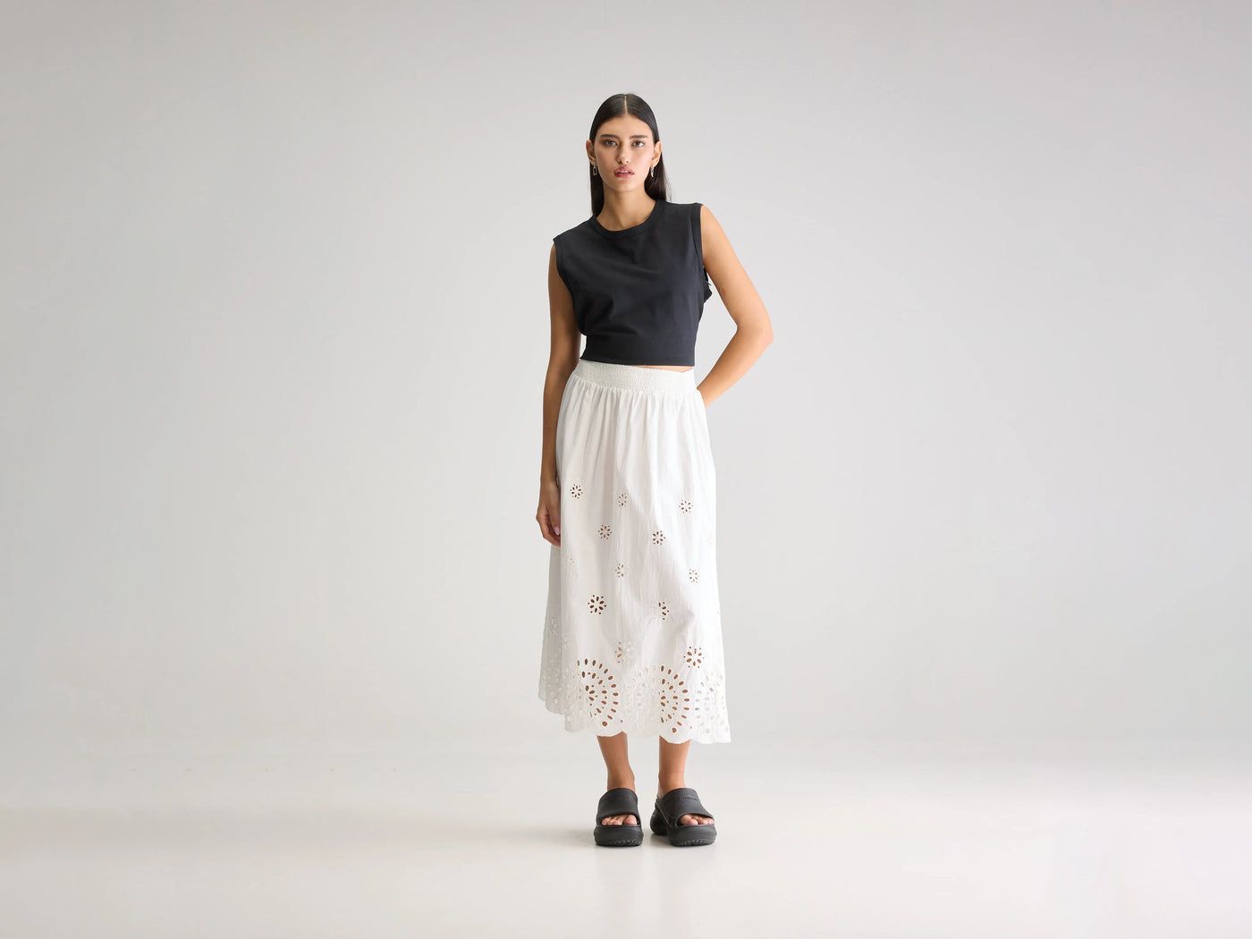 Tra questi capi spicca una gonna bianca in cotone, che incarna l'impegno del marchio verso la qualità e il design raffinato, offrendo un'opzione versatile e chic per diverse occasioni.