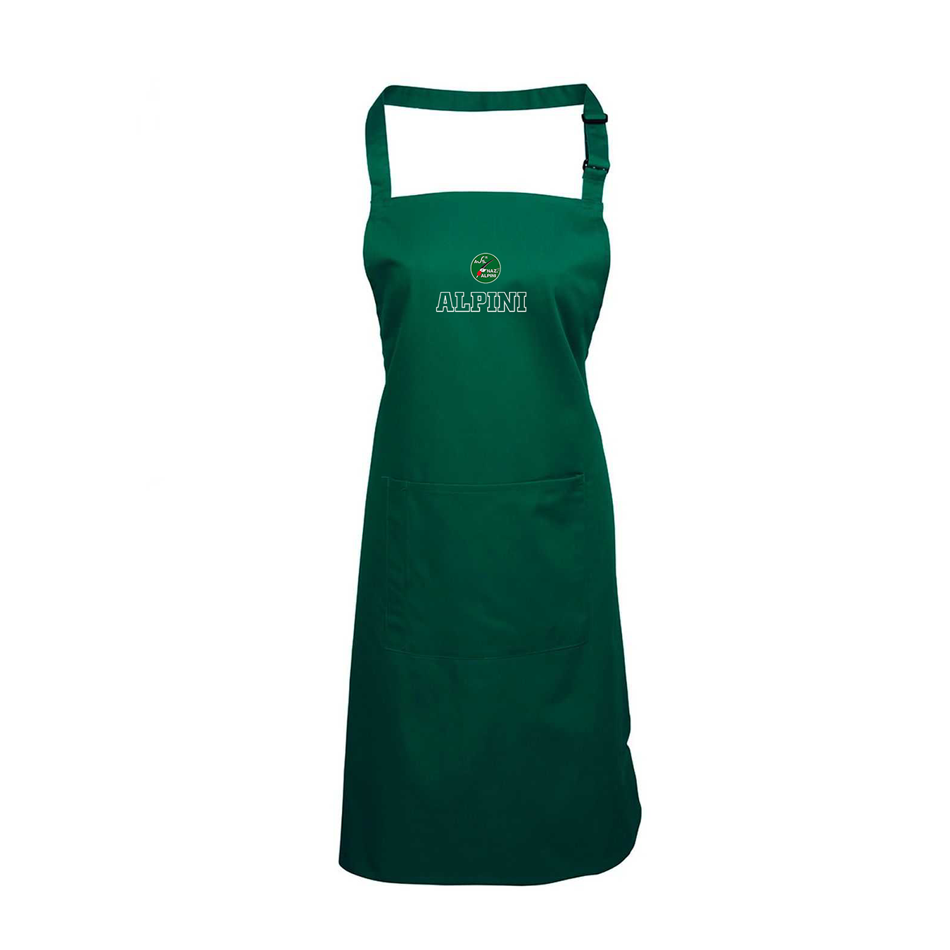 Grembiule con pettorina, tasca centrale, laccio al collo regolabile con fibbia. Personalizzato con ricamo del logo ANA e scritta ALPINI