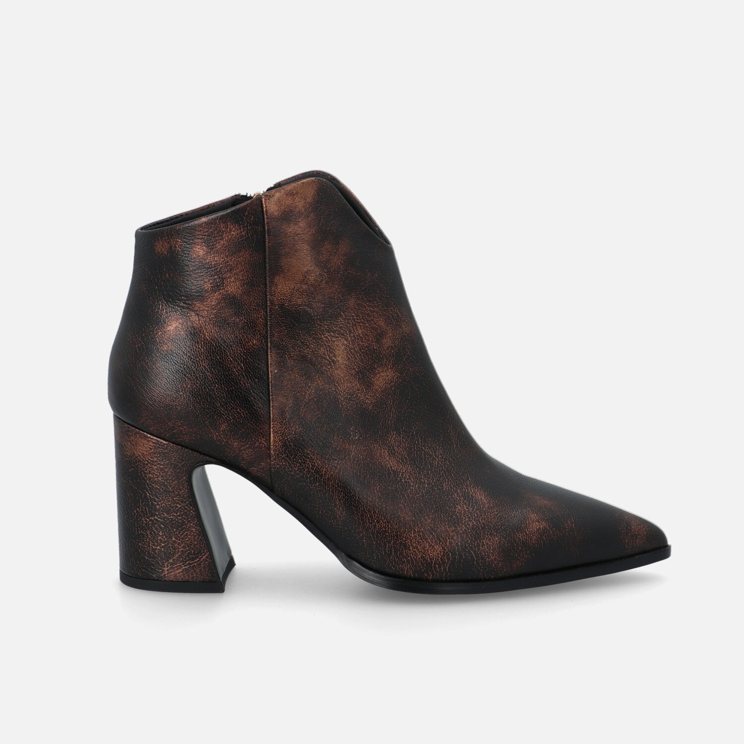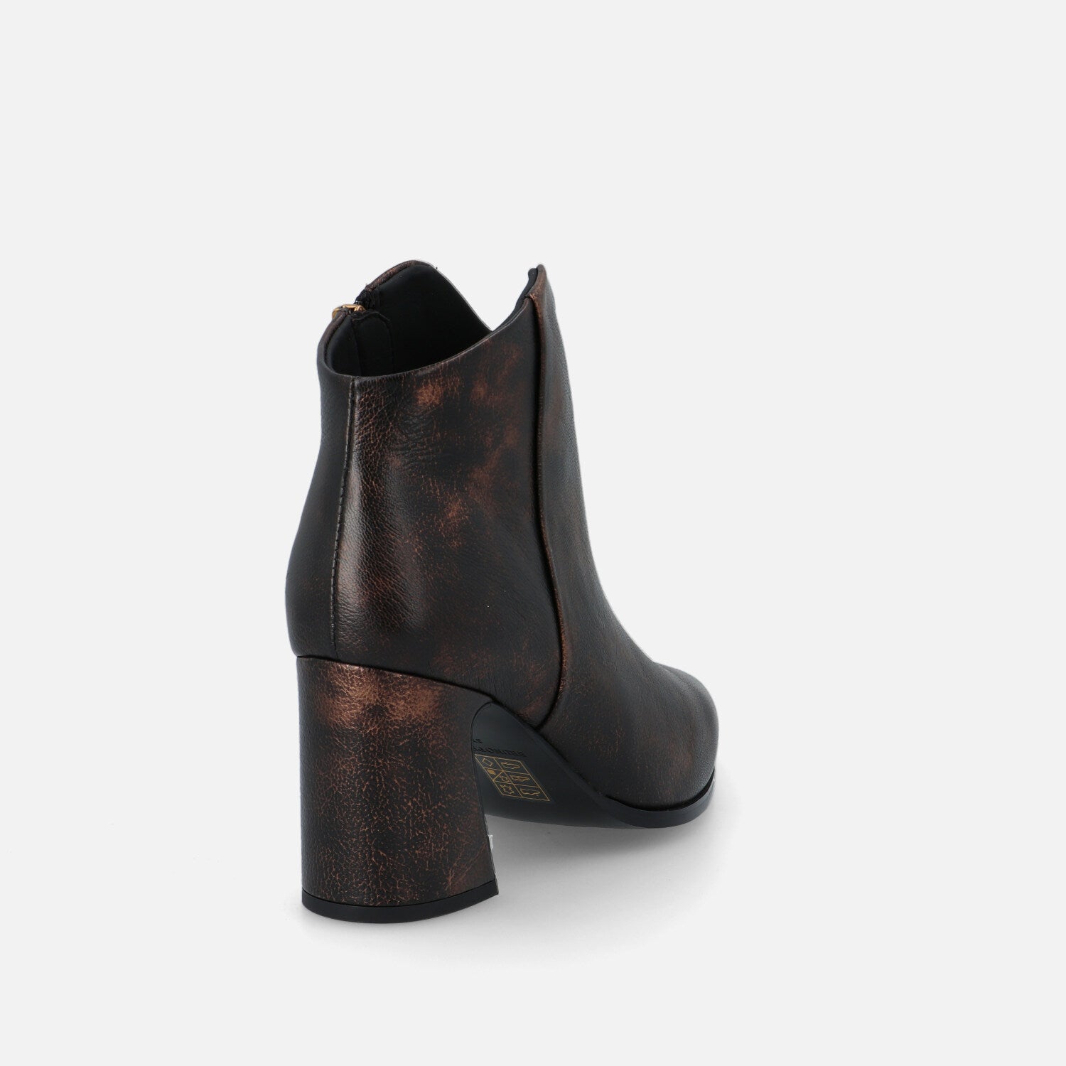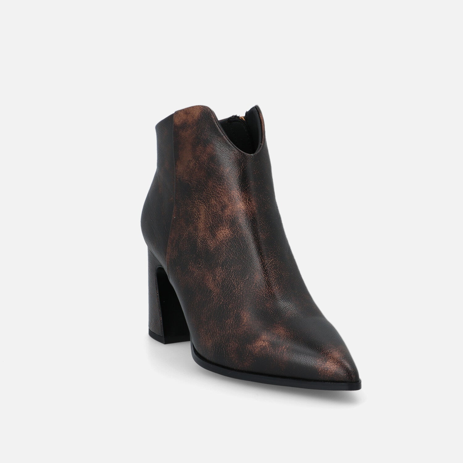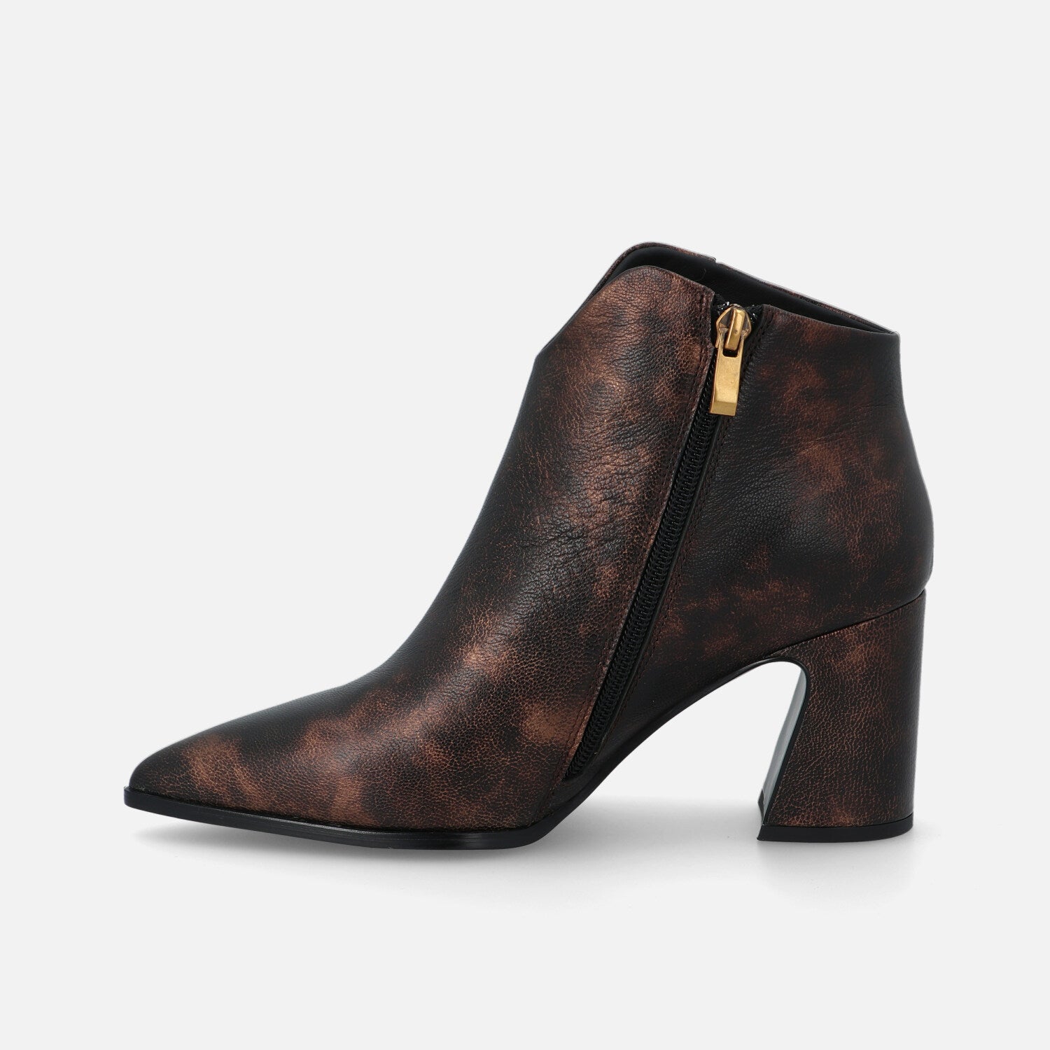 Ilo Pan è un tronchetto in pelle che esprime un’eleganza sofisticata e grintosa. La silhouette è affusolata, con punta sfilata e una linea asciutta che slancia la figura. Il design è essenziale ma d’impatto, privo di cuciture o accessori visibili, lasciando che sia la finitura metallizzata realizzata a mano a catturare l’attenzione. Il tacco largo e svasato aggiunge un tocco contemporaneo e assicura stabilità, rendendo il modello perfetto per l’uso quotidiano o per completare outfit eleganti con un accento audace e moderno.