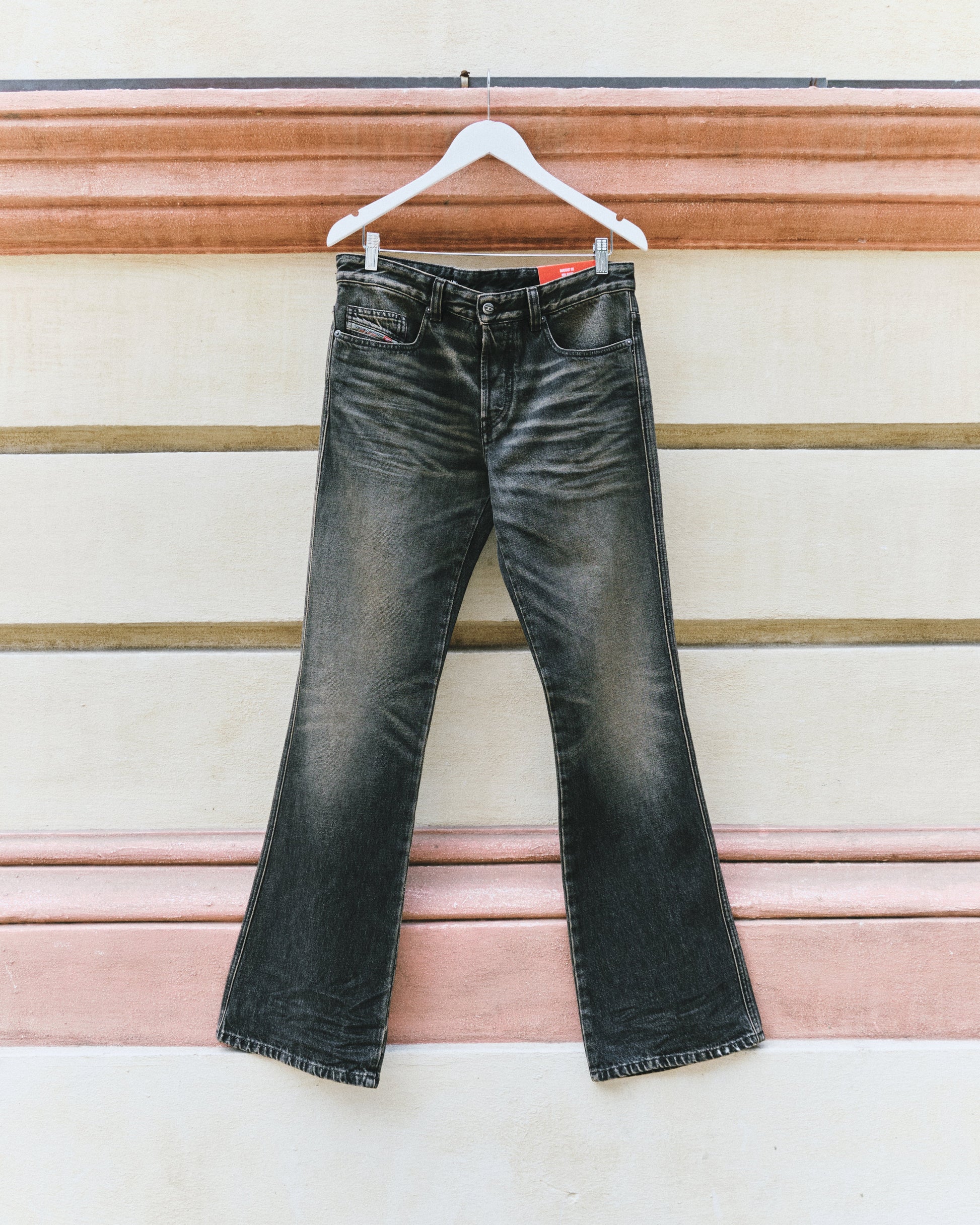 Bootcut fit con vita media, cavallo basso e gamba regular. Il modello si distingue per l'orlo ampio extra lungo, ed è arricchito da una "D" ricamata. Chiusura con bottoni.