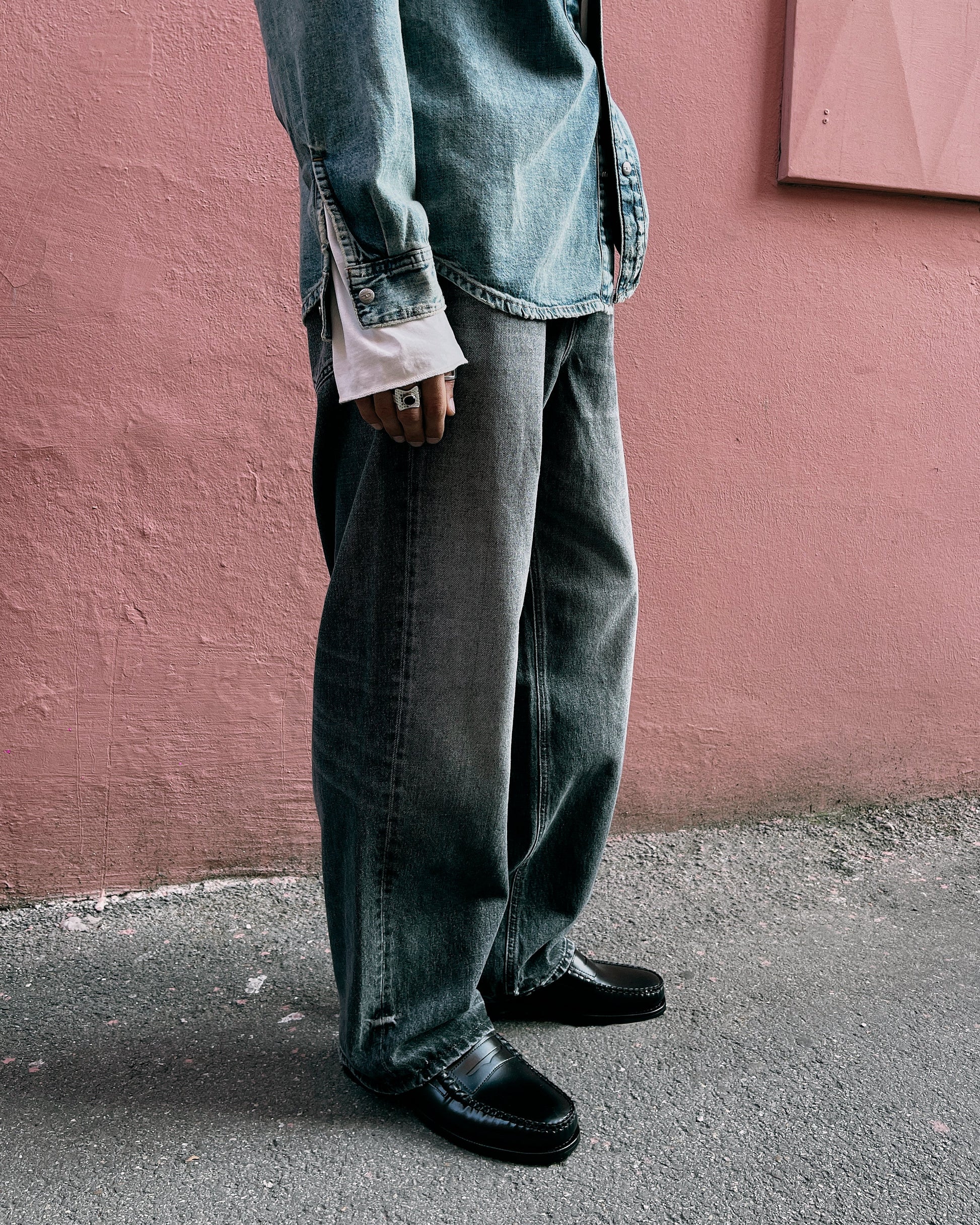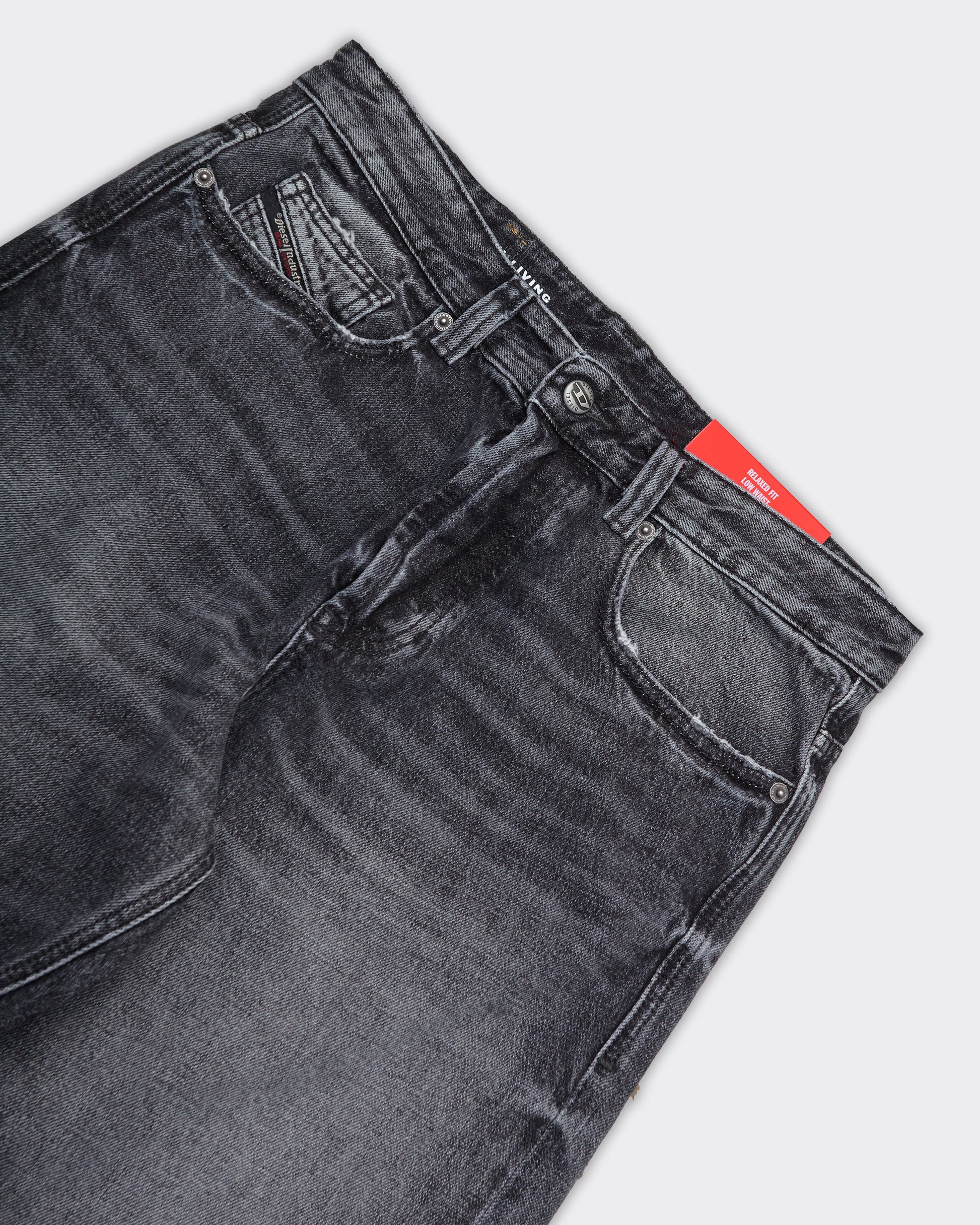 Jeans neri in denim con un lavaggio sfumato. Presentano cuciture decorative sui fianchi e un'etichetta sul retro.