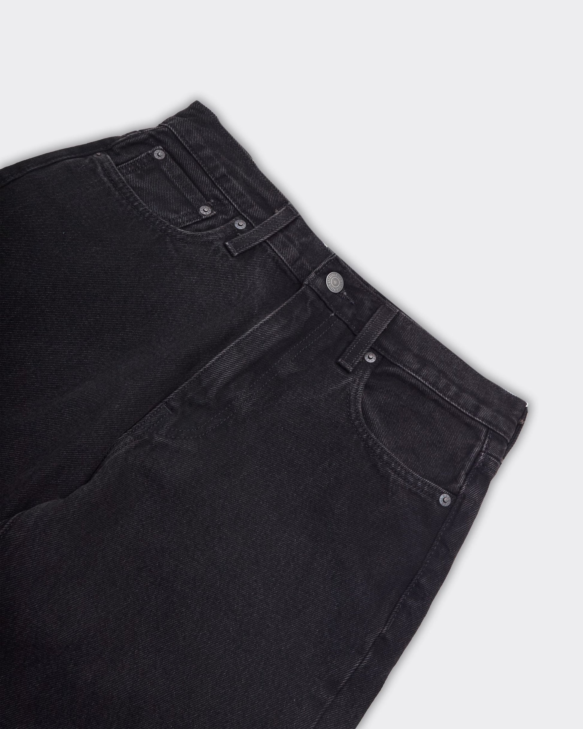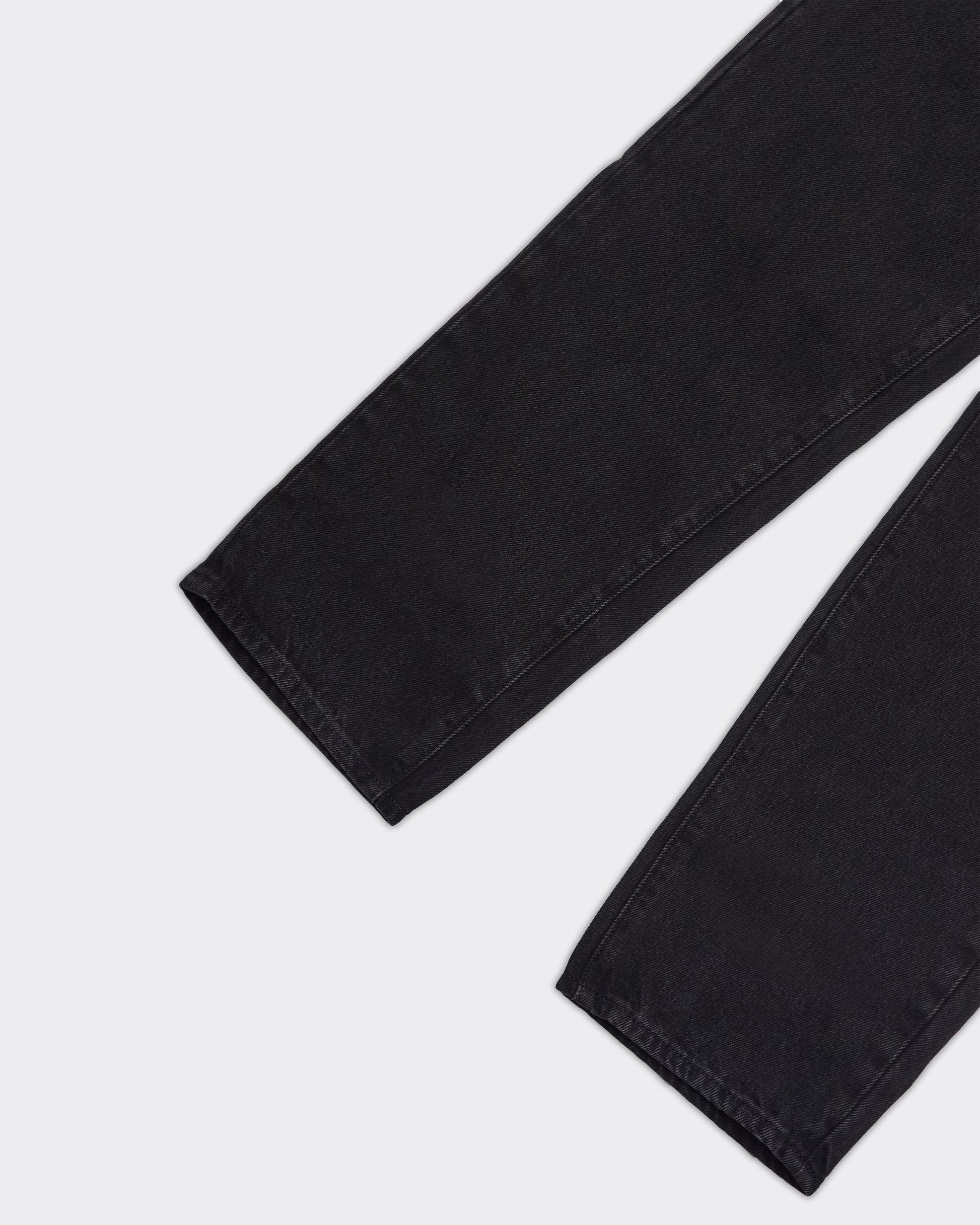 Jeans nero in denim, etichetta sul retro, cuciture tono su tono.