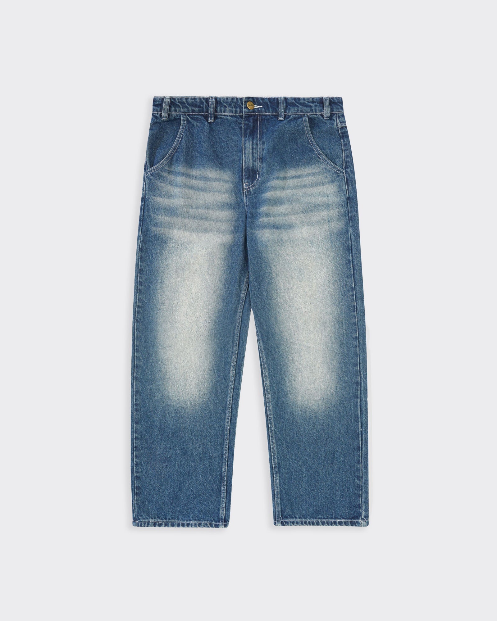 Jeans in denim blu sbiadito con effetto consumato, etichetta in pelle sul retro, ricamo giallo sopra la tasca posteriore.