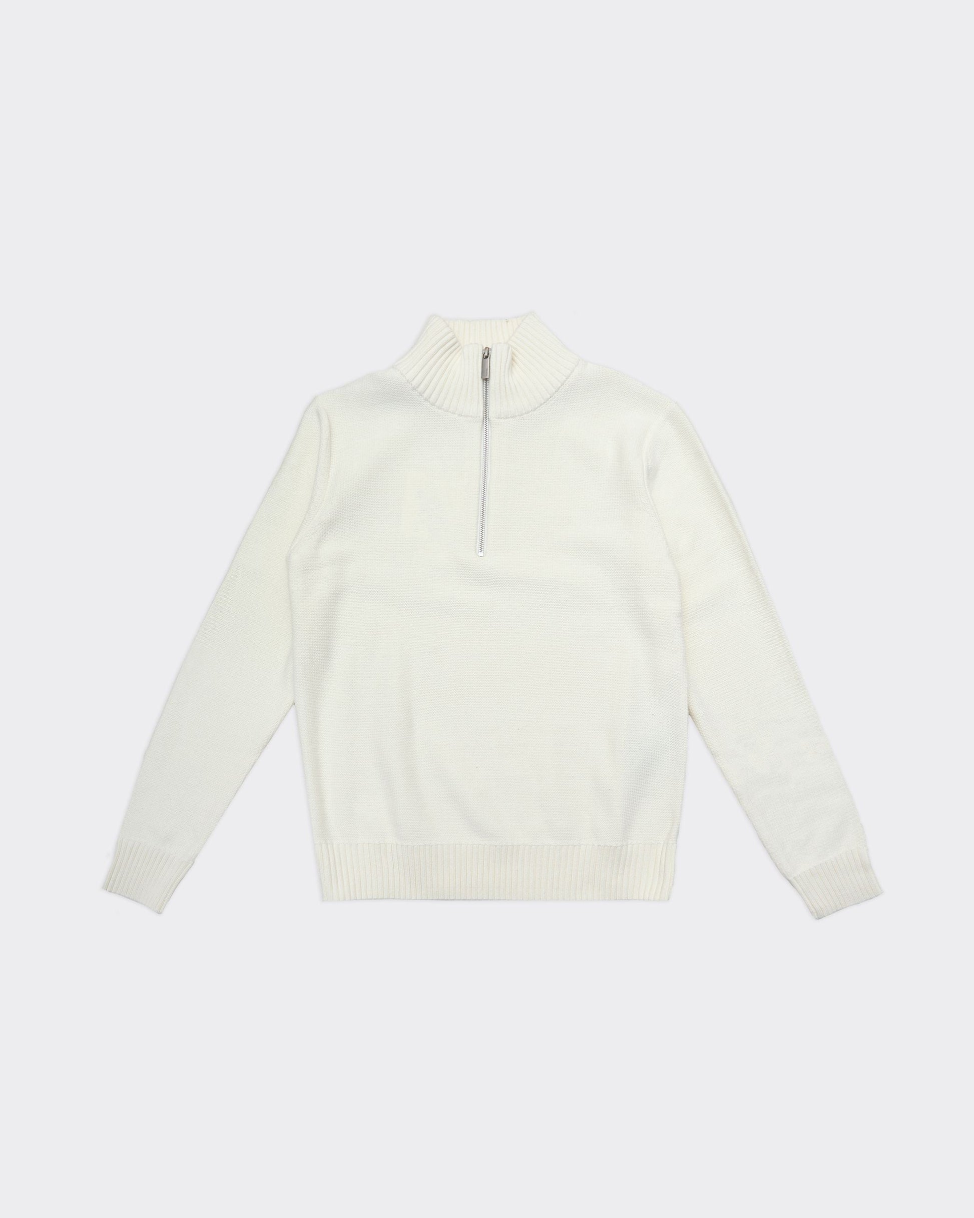 Colore bianco egret, tessuto a maglia visibile, zip sul collo, polsini e bordo inferiore a coste.