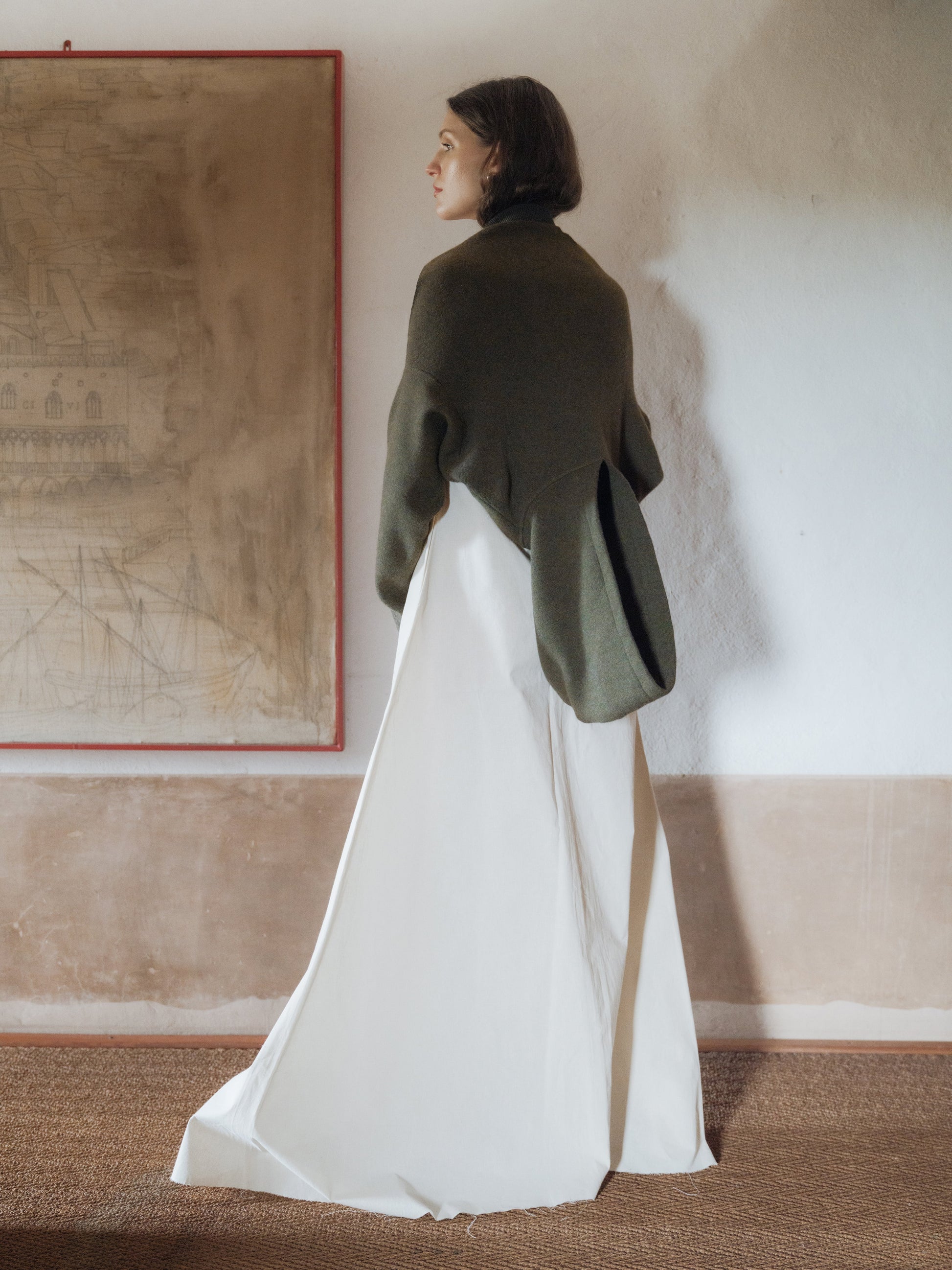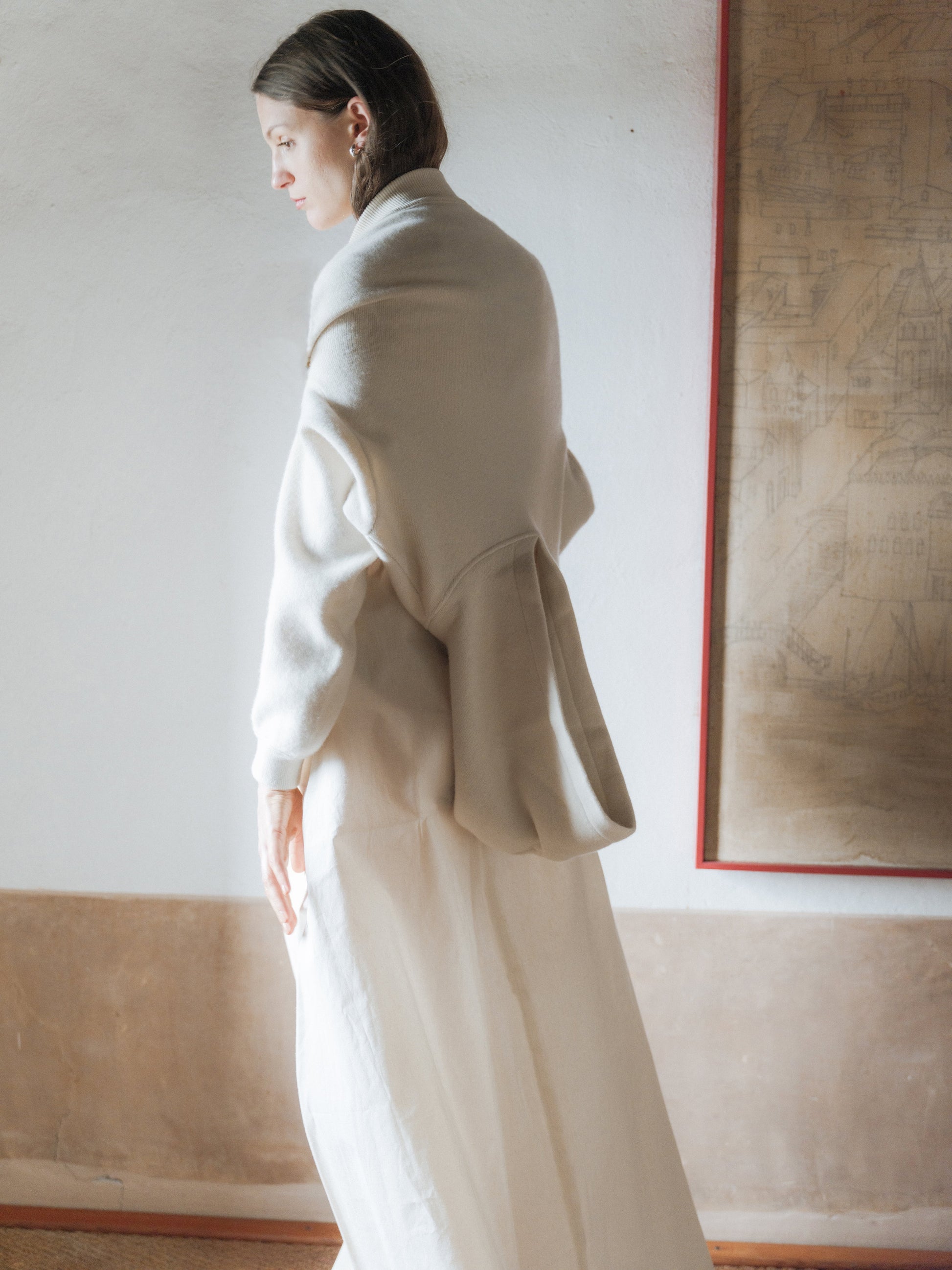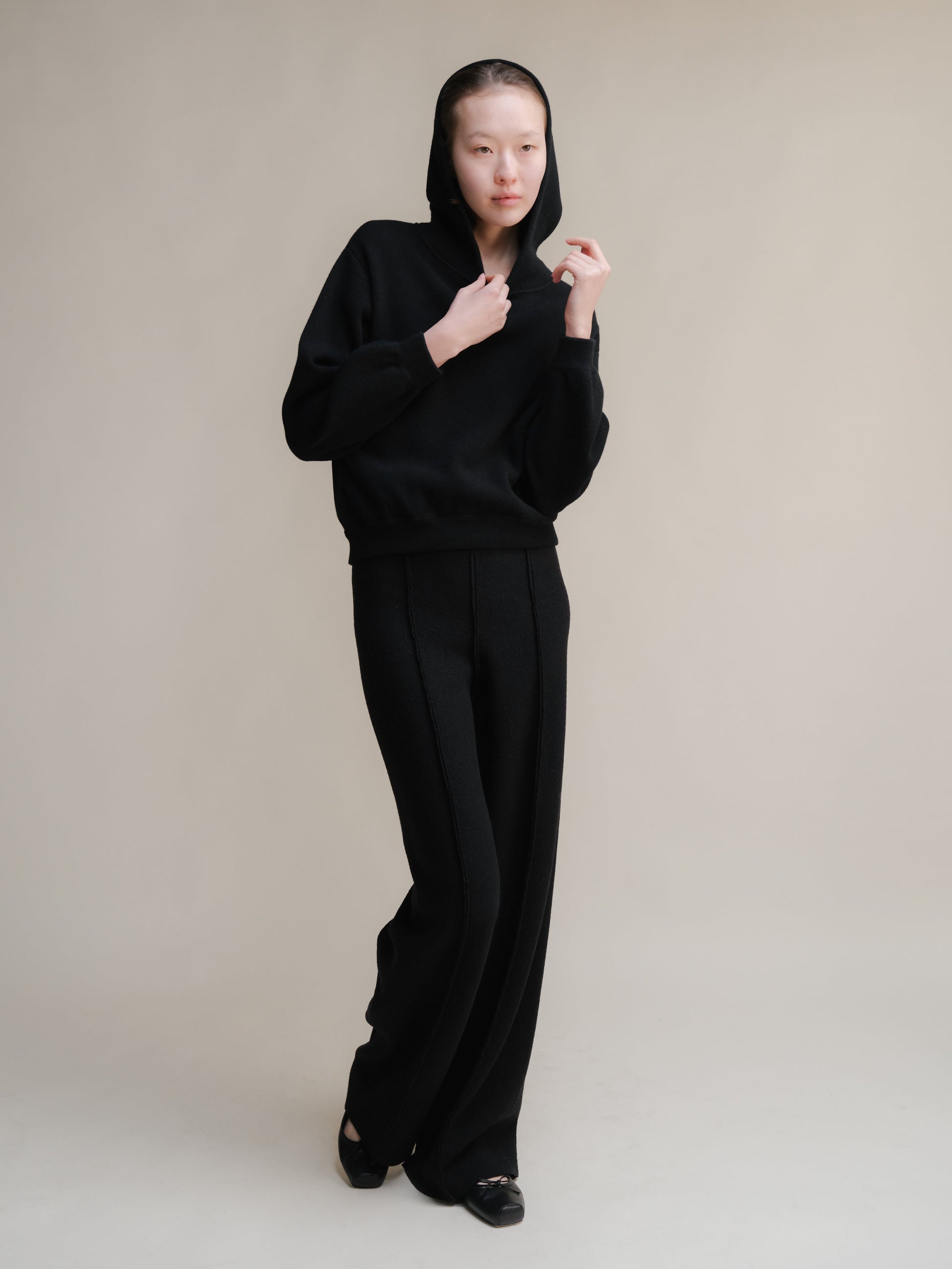 Cropped hooded sweater in pure lambswool, crafted with the maglia stoffa technique for a compact and structured feel. The cropped cut and side pocket add a contemporary and sporty touch.