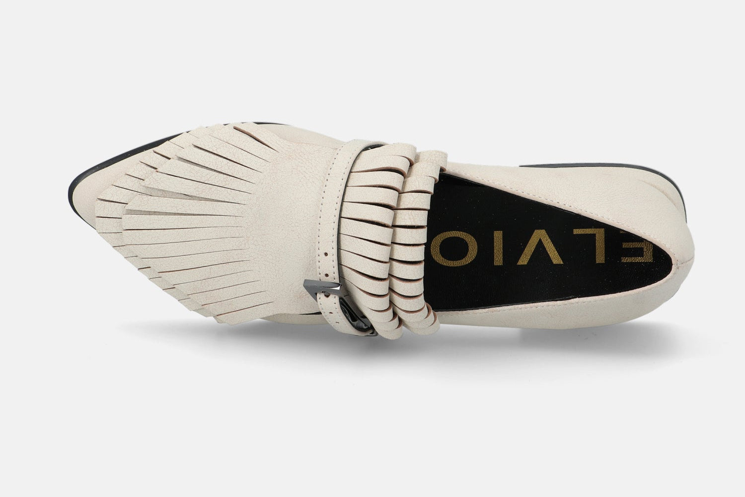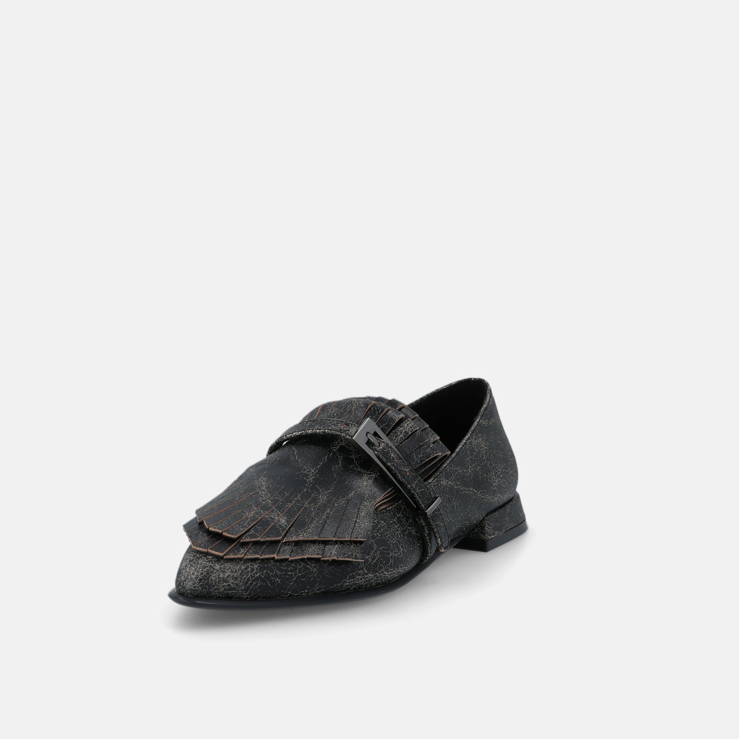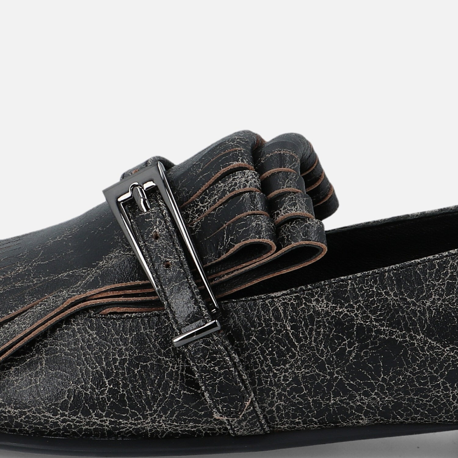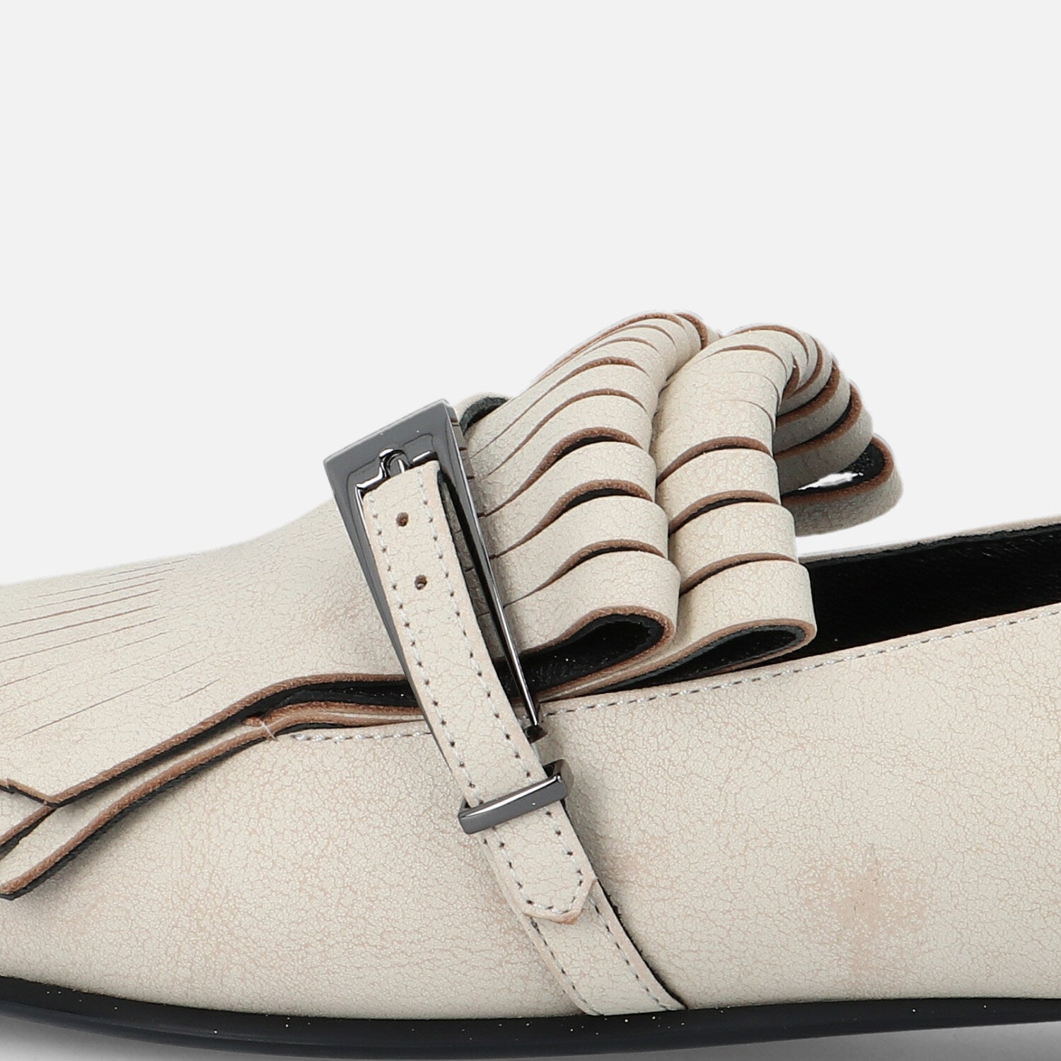 Le ballerine Lim Argot con frangia reinterpretano un grande classico con un tocco deciso e contemporaneo. Realizzate in pelle con effetto cracklé, disponibili nelle varianti bianco avorio o nero intenso, conquistano per il loro fascino vissuto e sofisticato. La punta affusolata è arricchita da una frangia multilivello con cinturino laterale e fibbia, dettagli che donano carattere e personalità al modello, rendendolo unico e riconoscibile.