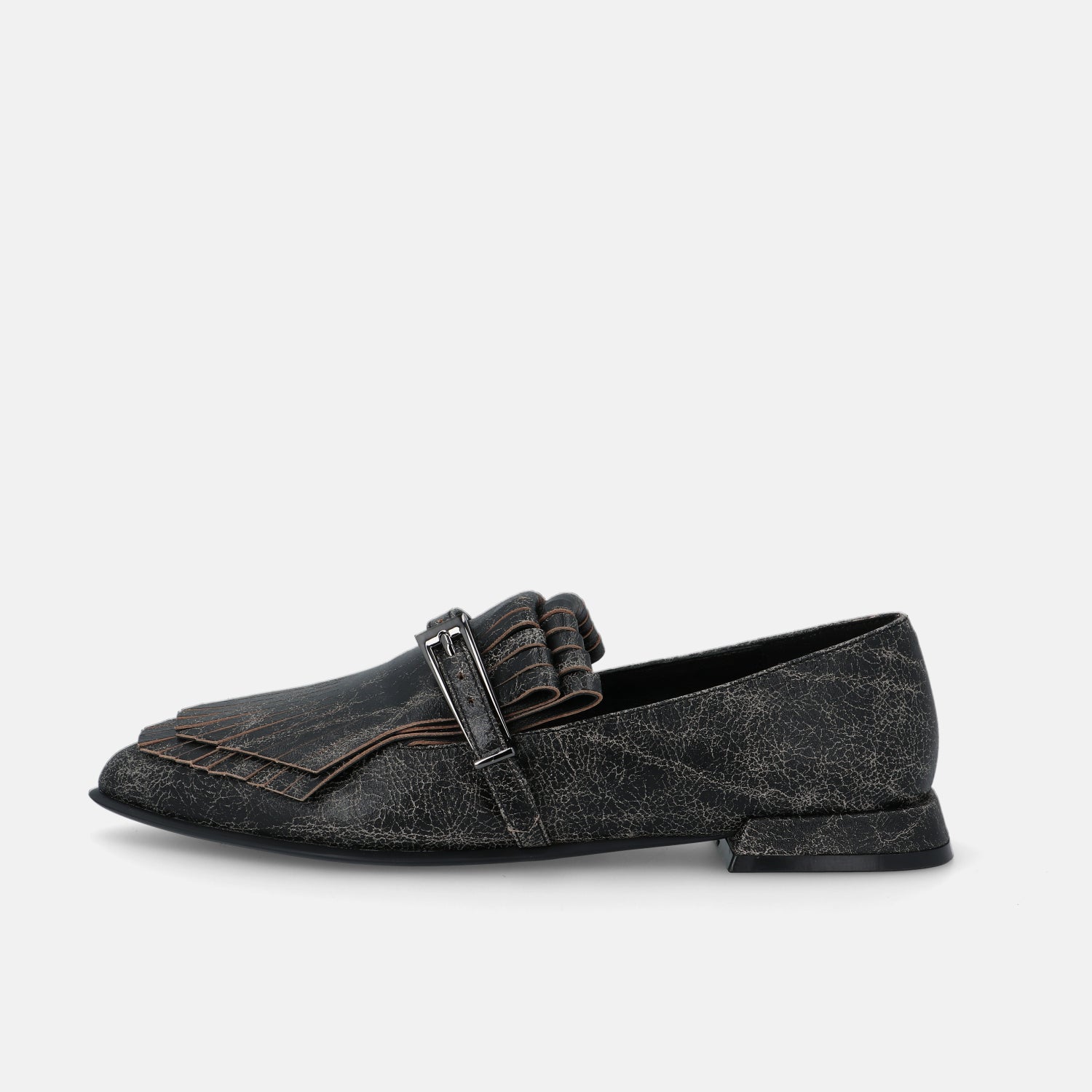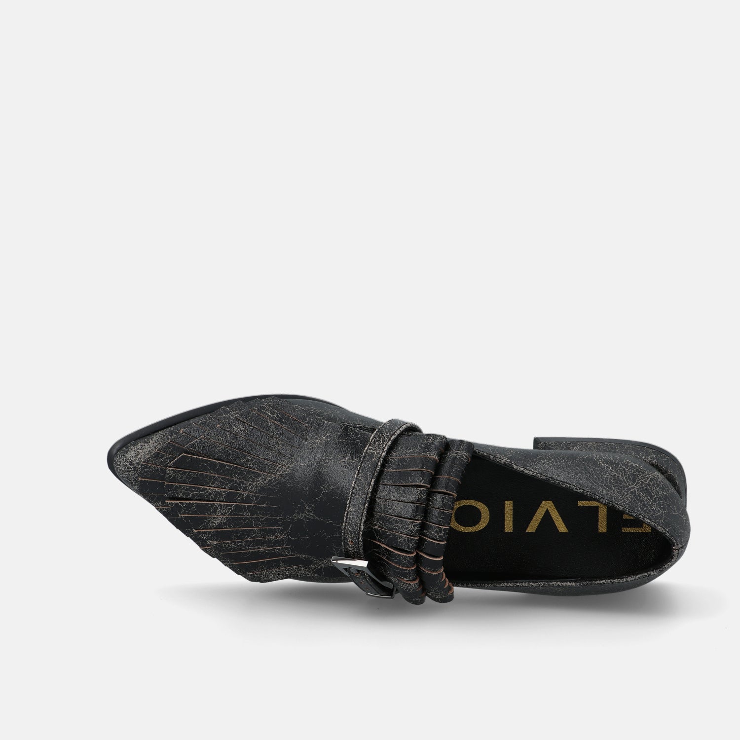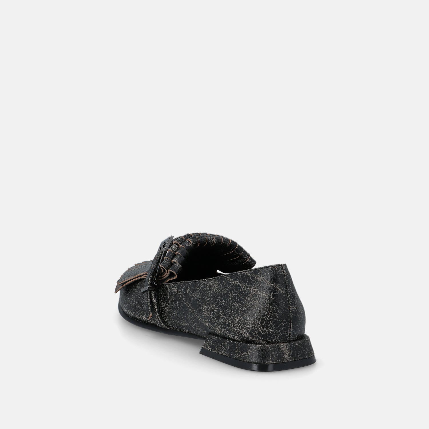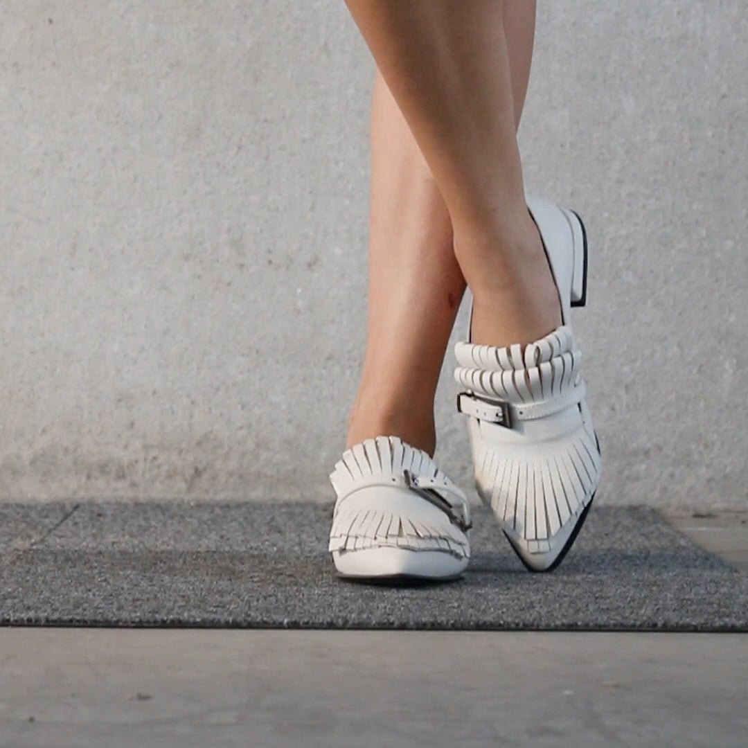 Le ballerine Lim Argot con frangia reinterpretano un grande classico con un tocco deciso e contemporaneo. Realizzate in pelle con effetto cracklé, disponibili nelle varianti bianco avorio o nero intenso, conquistano per il loro fascino vissuto e sofisticato. La punta affusolata è arricchita da una frangia multilivello con cinturino laterale e fibbia, dettagli che donano carattere e personalità al modello, rendendolo unico e riconoscibile.