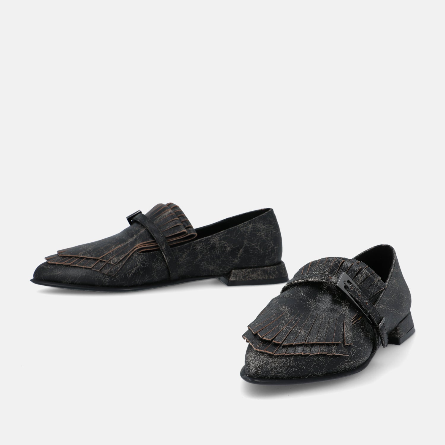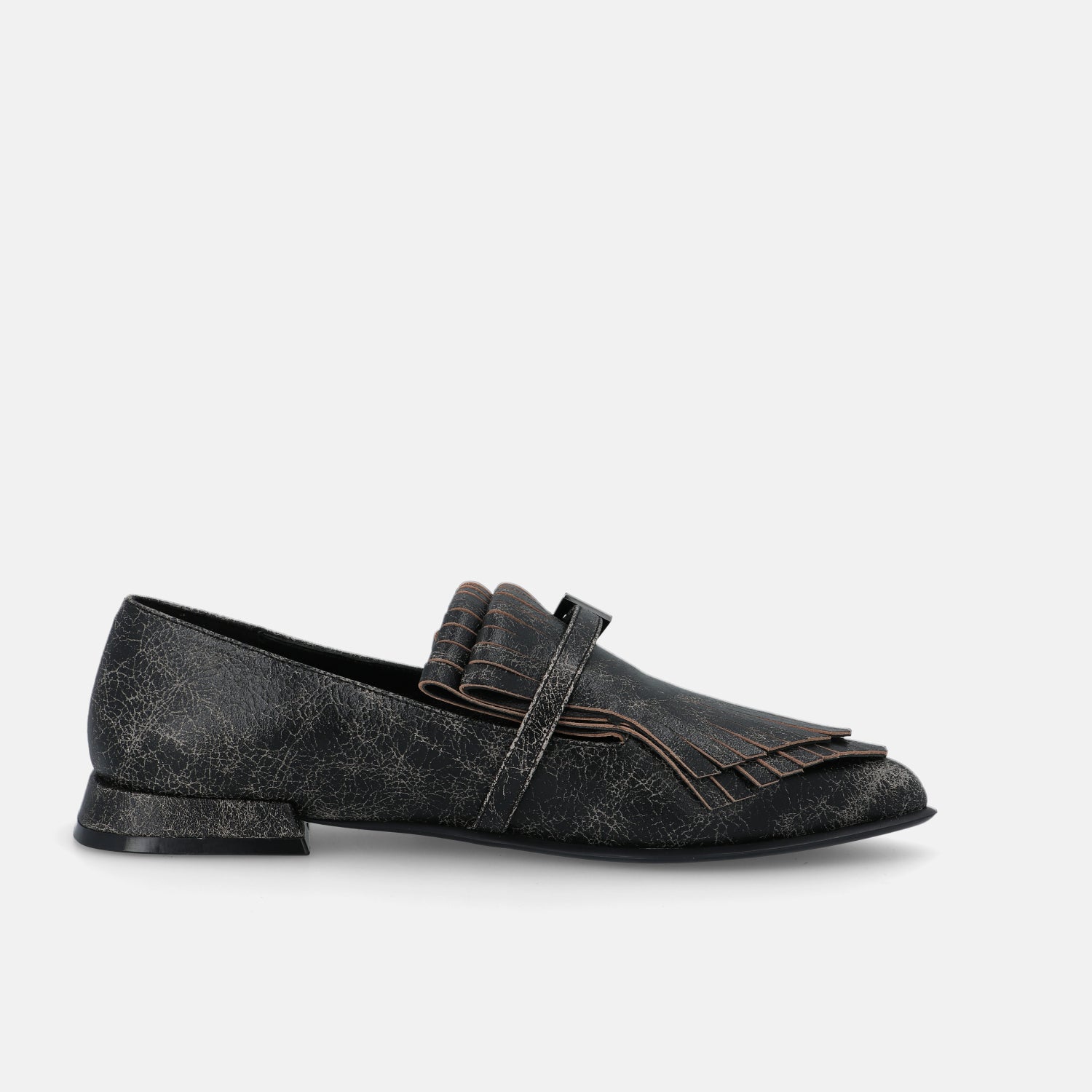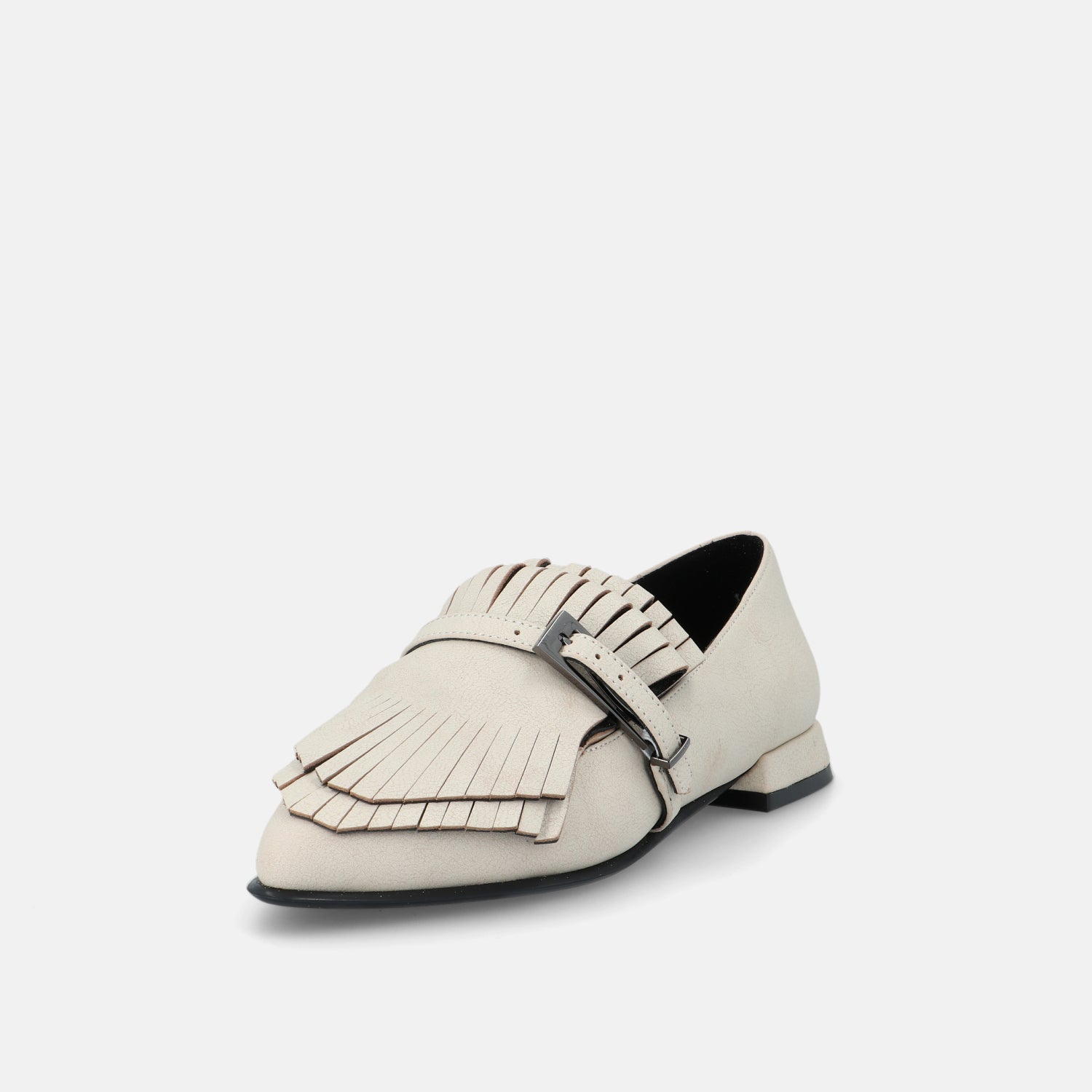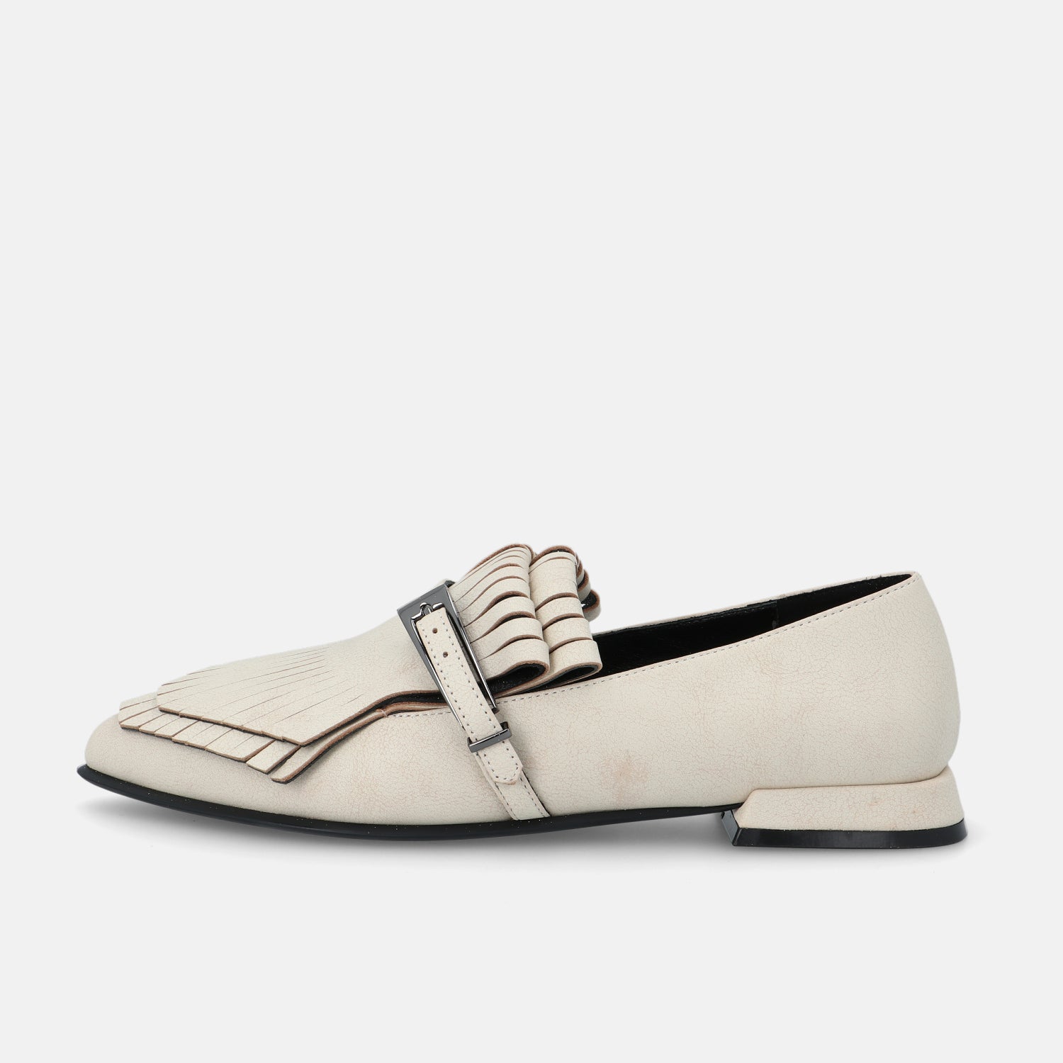 Le ballerine Lim Argot con frangia reinterpretano un grande classico con un tocco deciso e contemporaneo. Realizzate in pelle con effetto cracklé, disponibili nelle varianti bianco avorio o nero intenso, conquistano per il loro fascino vissuto e sofisticato. La punta affusolata è arricchita da una frangia multilivello con cinturino laterale e fibbia, dettagli che donano carattere e personalità al modello, rendendolo unico e riconoscibile.