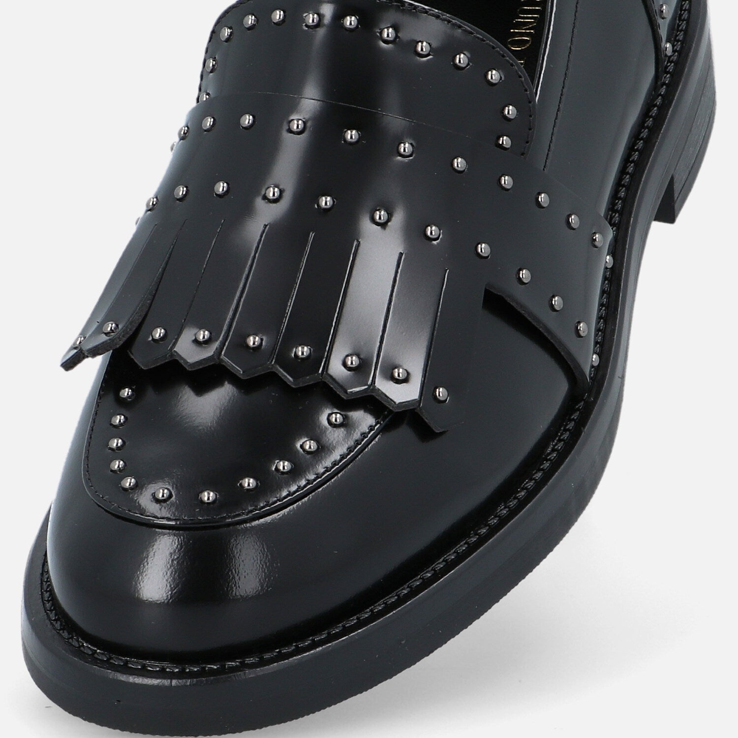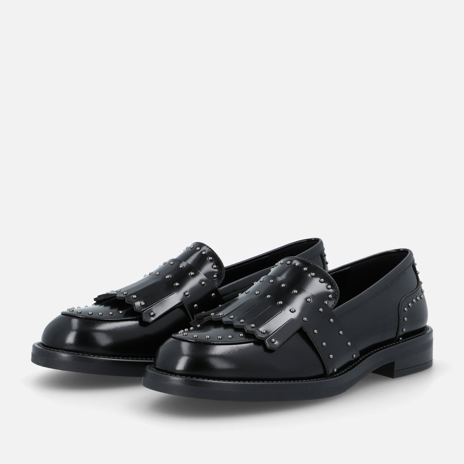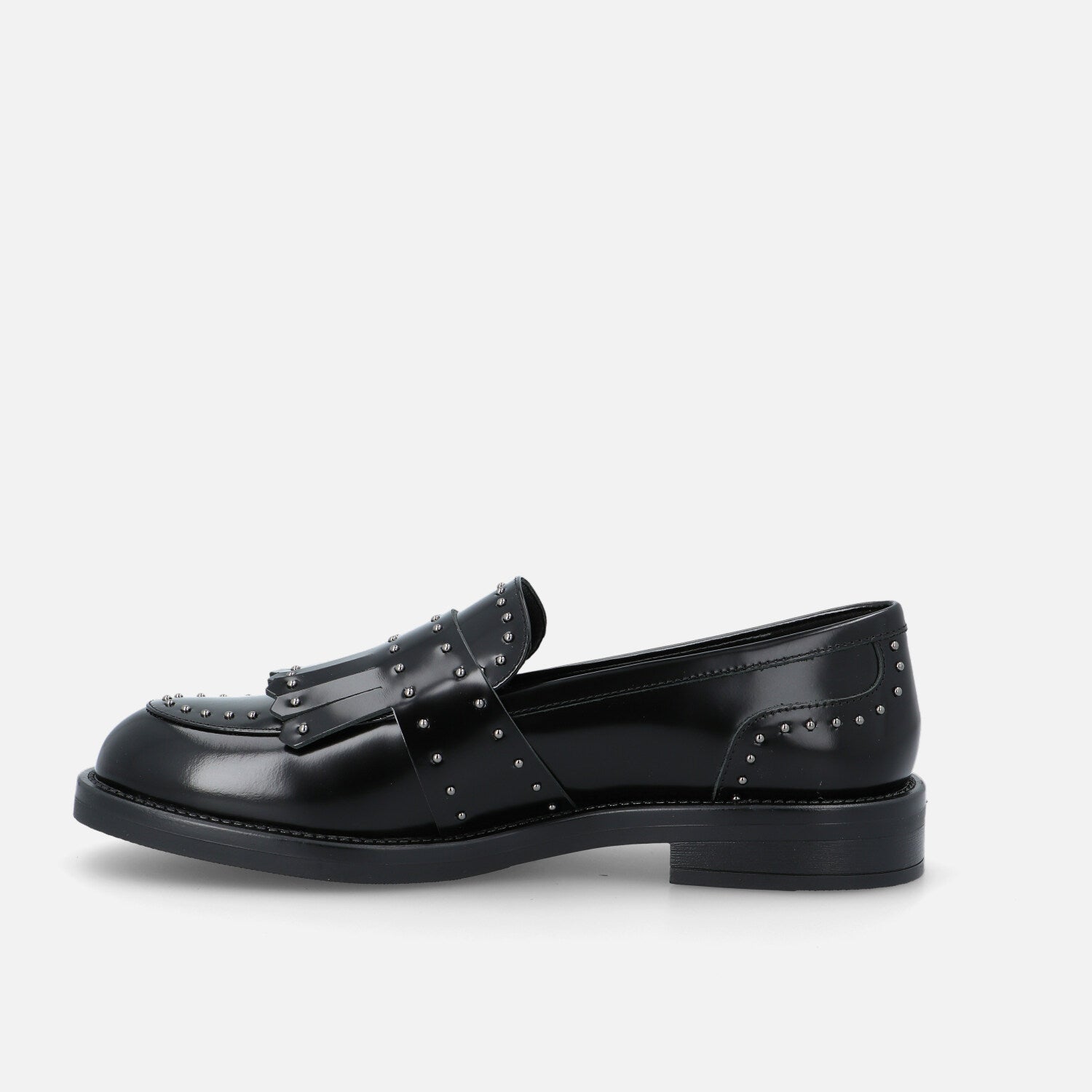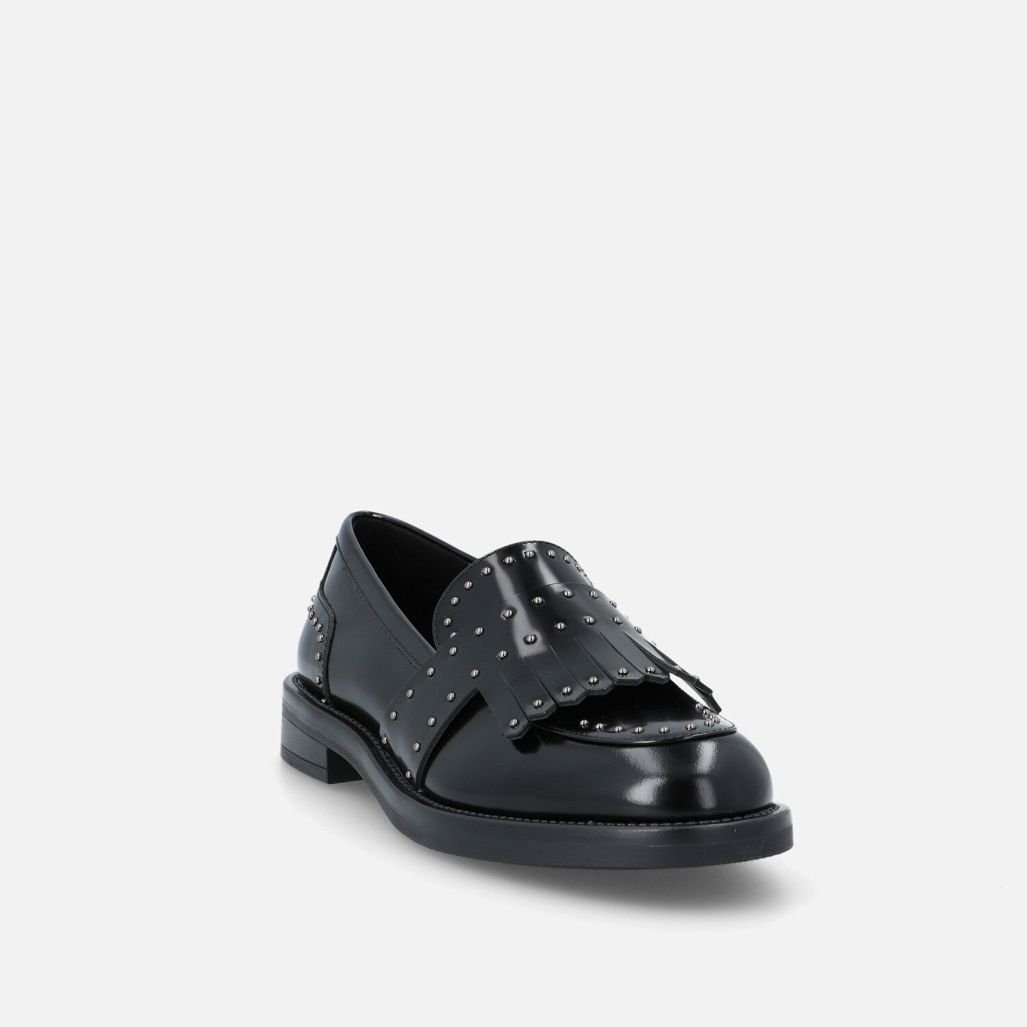 I mocassini Liv Engla in pelle abrasivata coniugano eleganza formale e dettagli rock. La tomaia lucida è arricchita da una frangia frontale decorativa e da una mascherina ampia, entrambe impreziosite da micro borchie metalliche che donano ritmo e carattere al design. Il profilo classico con punta arrotondata si abbina a una suola in gomma con tacco basso, per un comfort duraturo e un look deciso. Un modello che reinterpreta lo stile college in chiave contemporanea, ideale per aggiungere un twist grintoso a outfit da giorno e da ufficio.