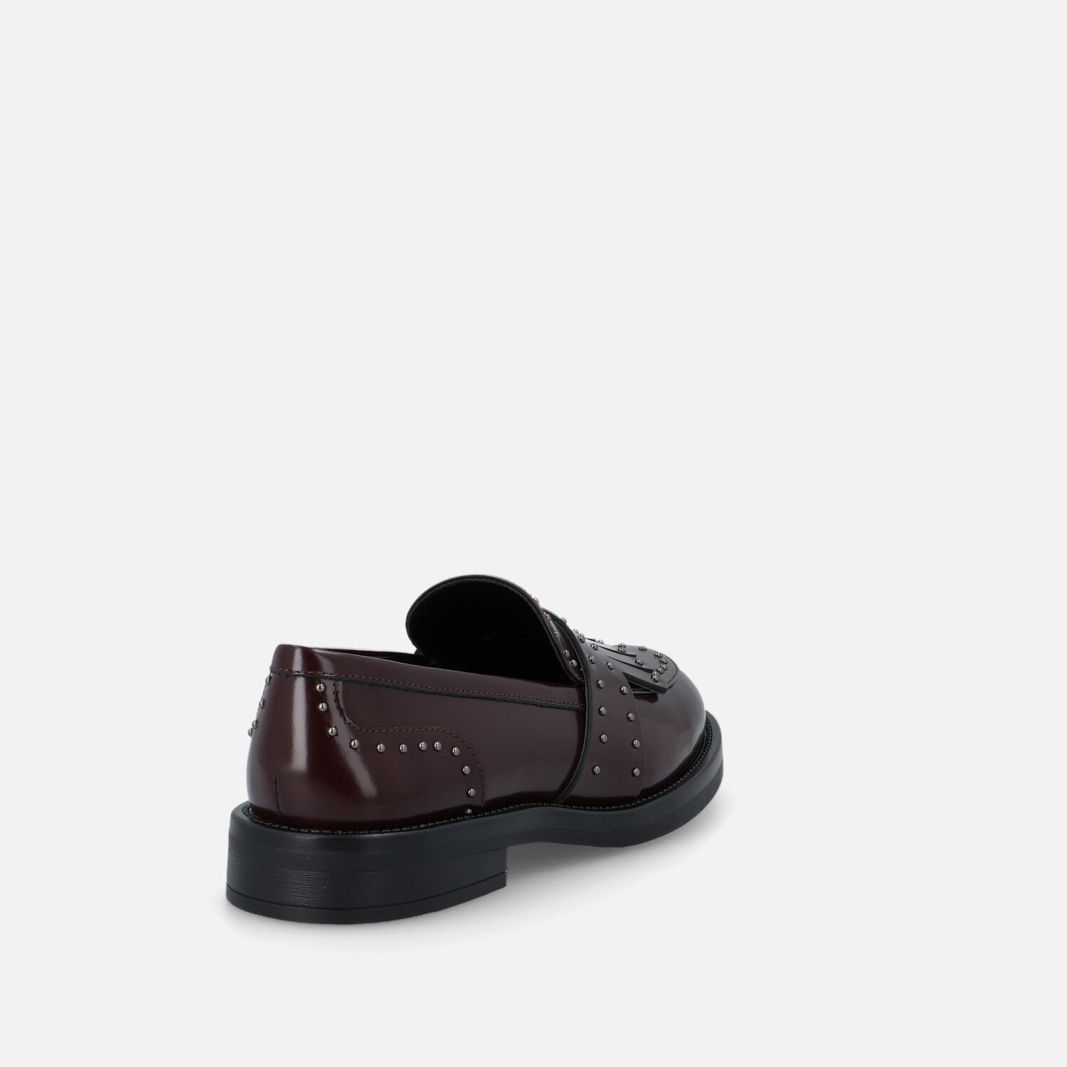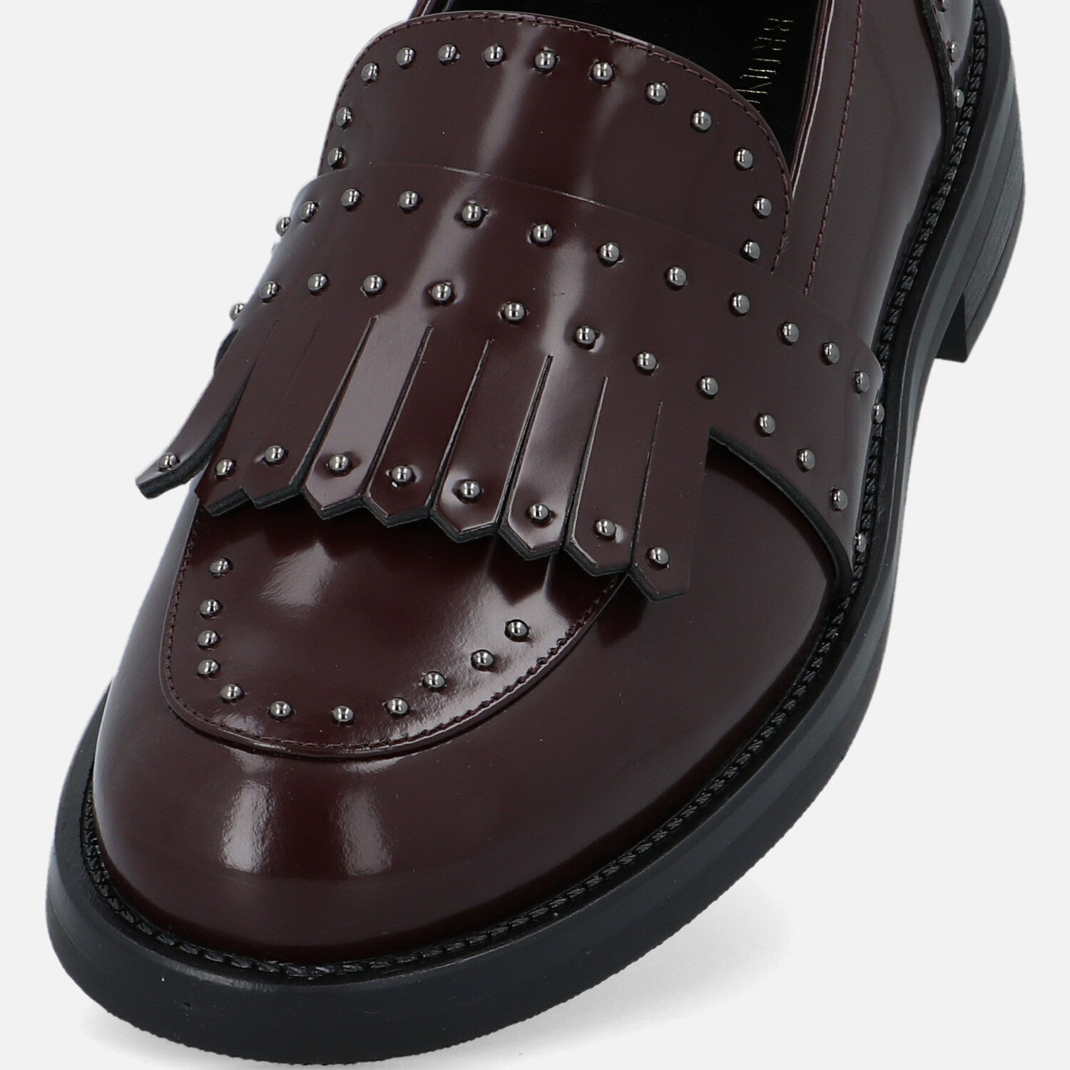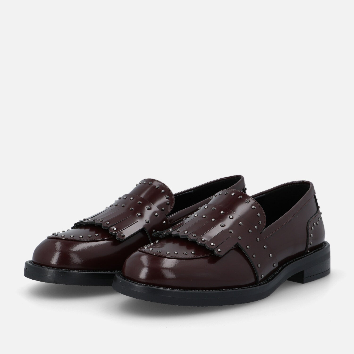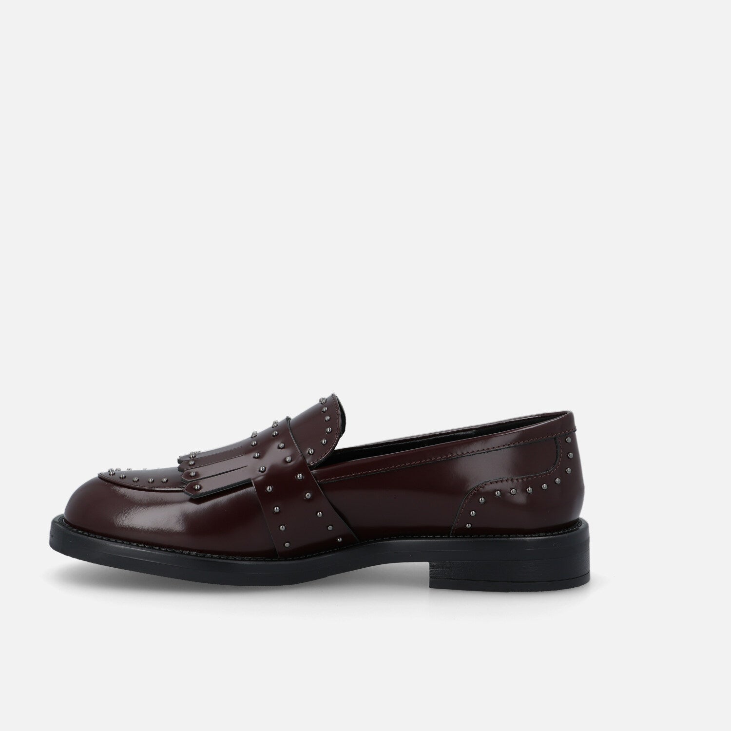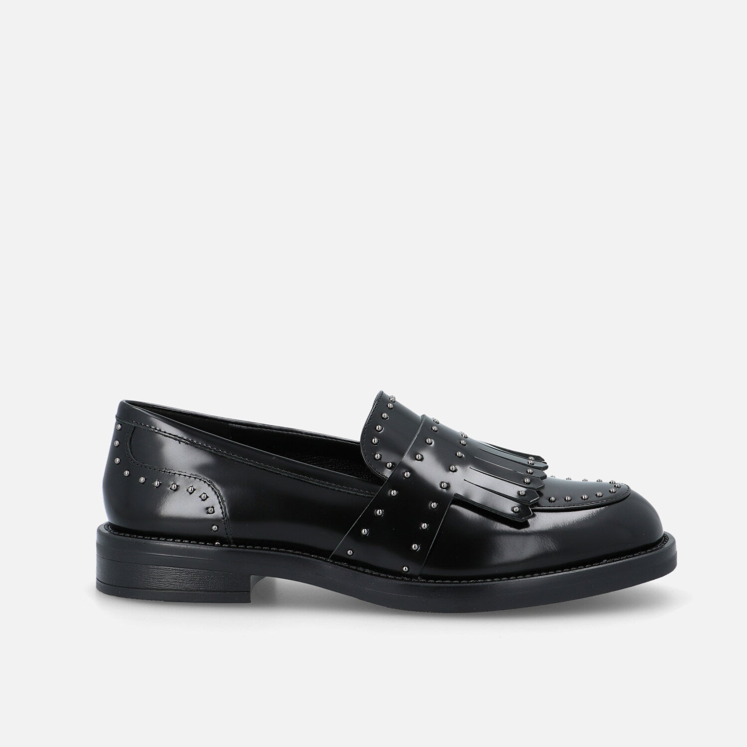 I mocassini Liv Engla in pelle abrasivata coniugano eleganza formale e dettagli rock. La tomaia lucida è arricchita da una frangia frontale decorativa e da una mascherina ampia, entrambe impreziosite da micro borchie metalliche che donano ritmo e carattere al design. Il profilo classico con punta arrotondata si abbina a una suola in gomma con tacco basso, per un comfort duraturo e un look deciso. Un modello che reinterpreta lo stile college in chiave contemporanea, ideale per aggiungere un twist grintoso a outfit da giorno e da ufficio.