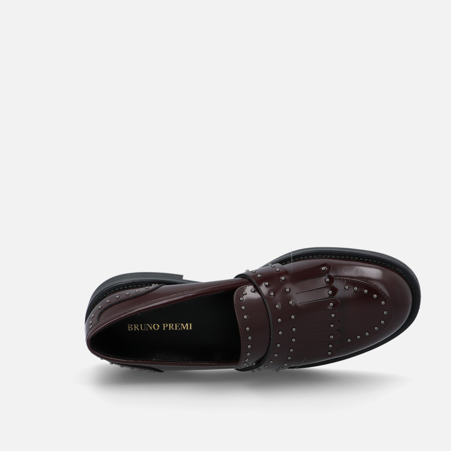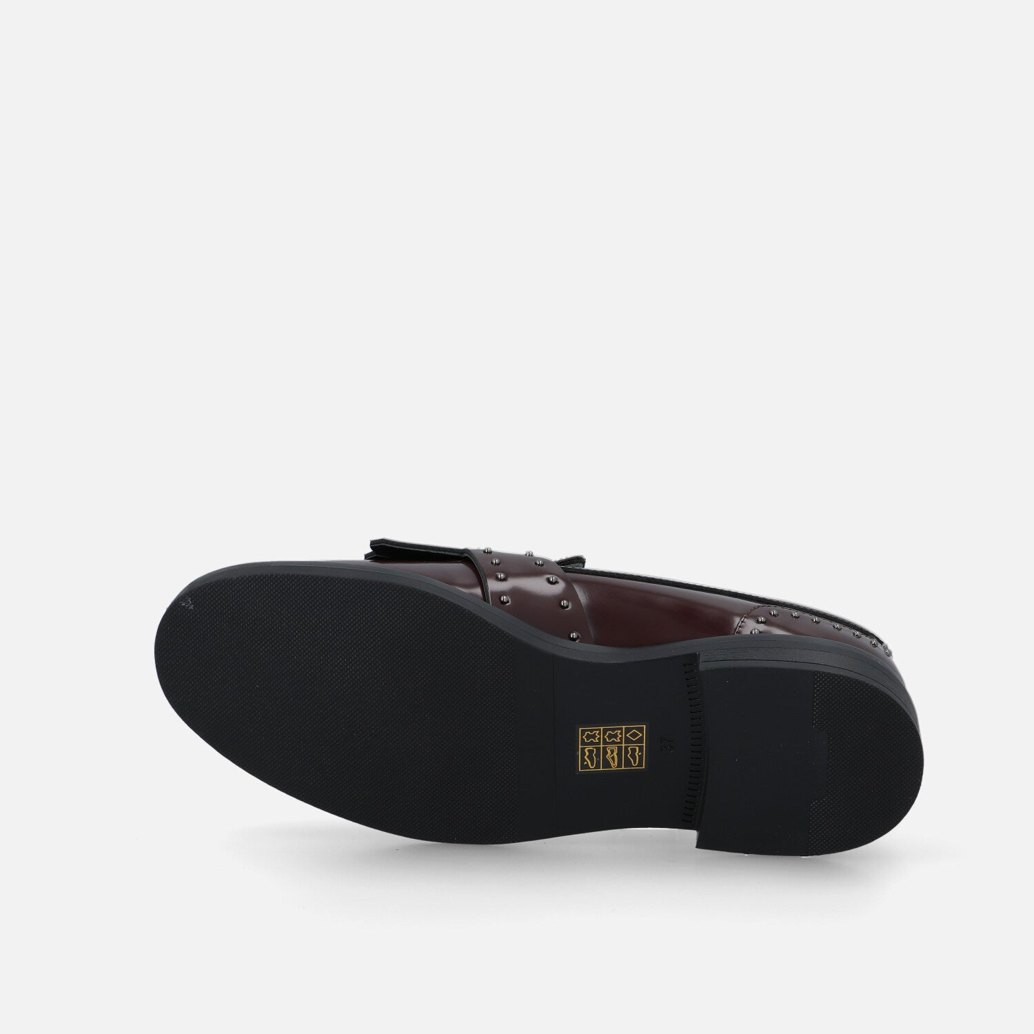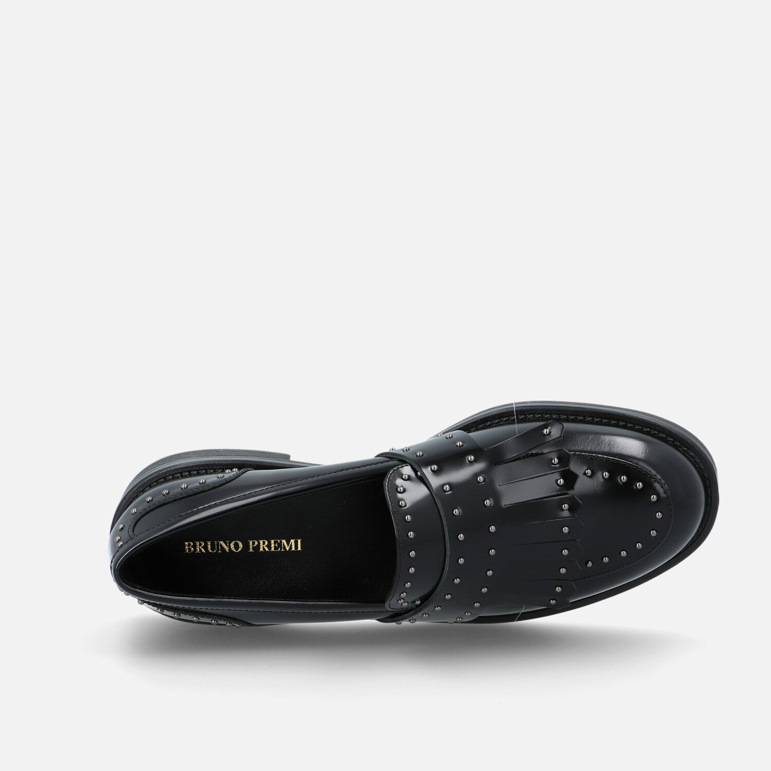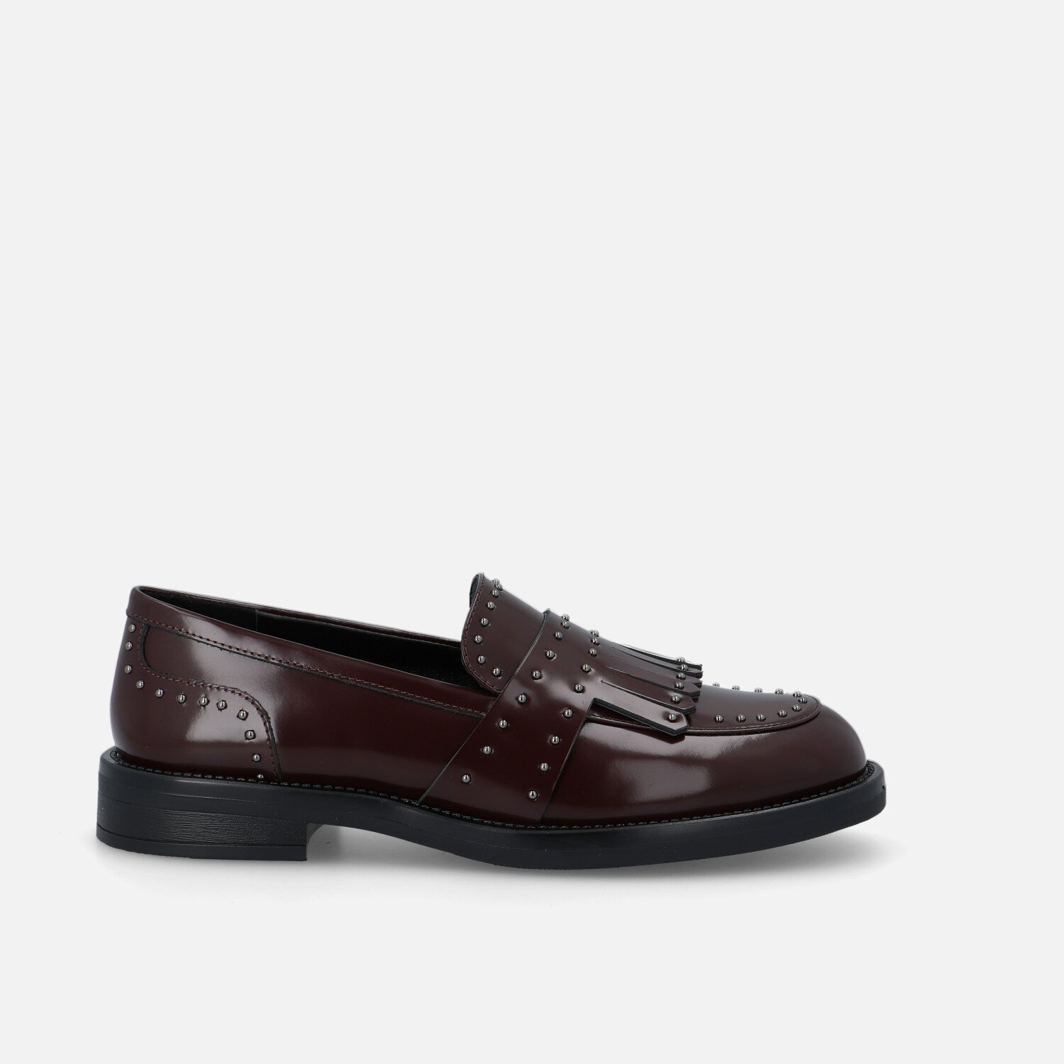 I mocassini Liv Engla in pelle abrasivata coniugano eleganza formale e dettagli rock. La tomaia lucida è arricchita da una frangia frontale decorativa e da una mascherina ampia, entrambe impreziosite da micro borchie metalliche che donano ritmo e carattere al design. Il profilo classico con punta arrotondata si abbina a una suola in gomma con tacco basso, per un comfort duraturo e un look deciso. Un modello che reinterpreta lo stile college in chiave contemporanea, ideale per aggiungere un twist grintoso a outfit da giorno e da ufficio.