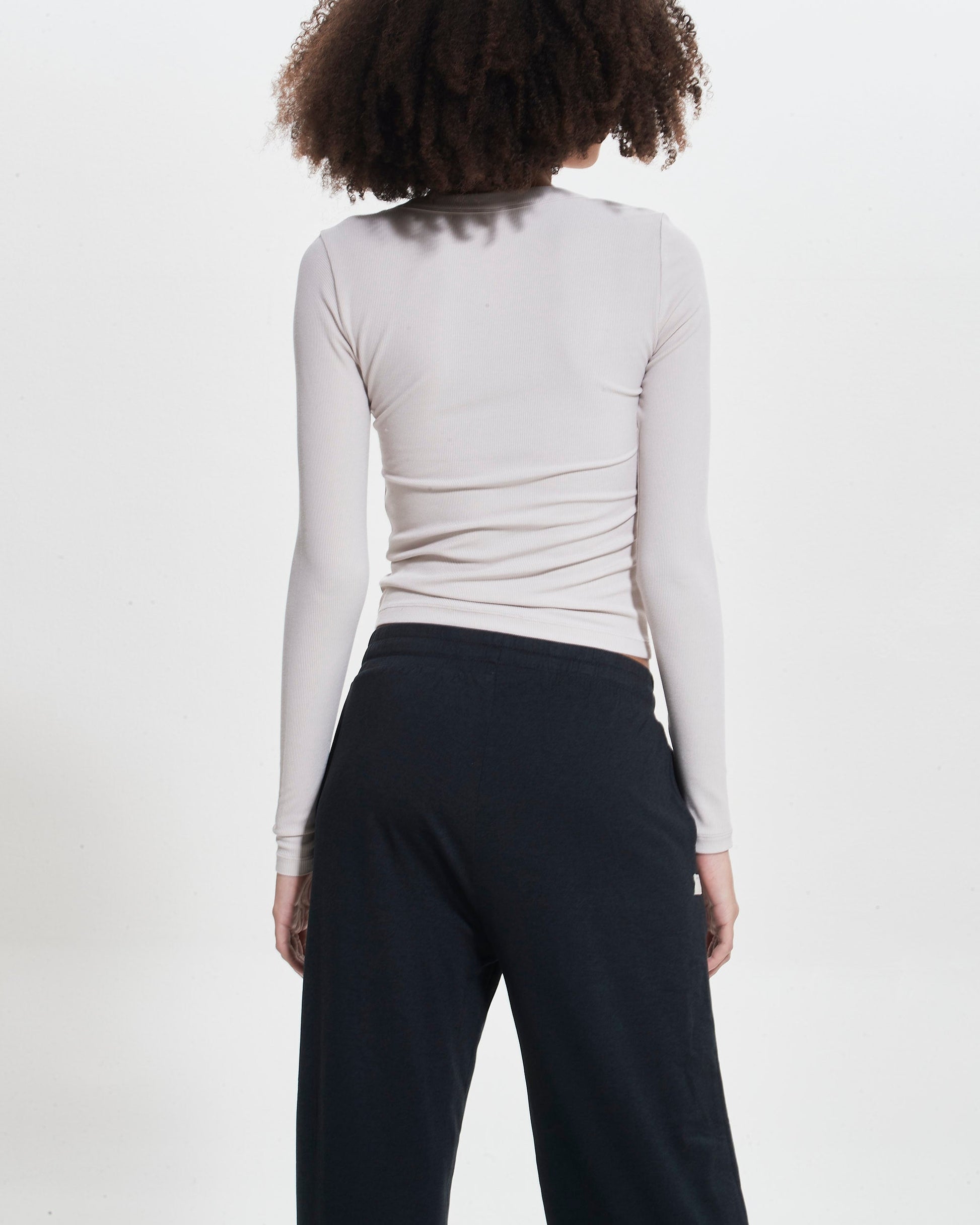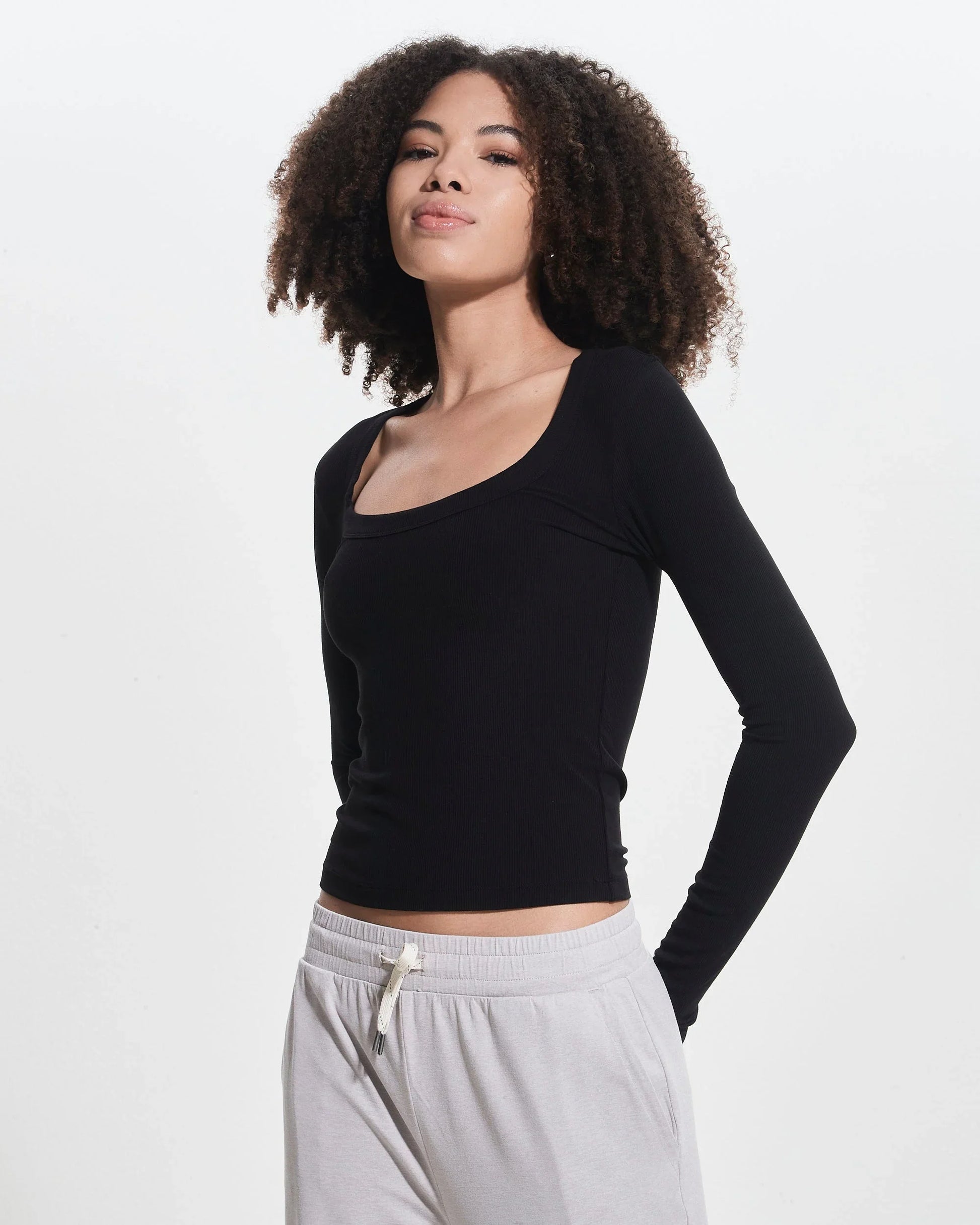 Elevate your wardrobe with this sleek Long Sleeve Studio Rib Tee, designed with a flattering stretch rib knit and inspired by dancewear. Its moisture-wicking fabric ensures comfort, while effortlessly pairing with your favorite leggings for a stylish, versatile look. Perfect for training, traveling, hiking and yoga, this piece brings together elegance and practicality.