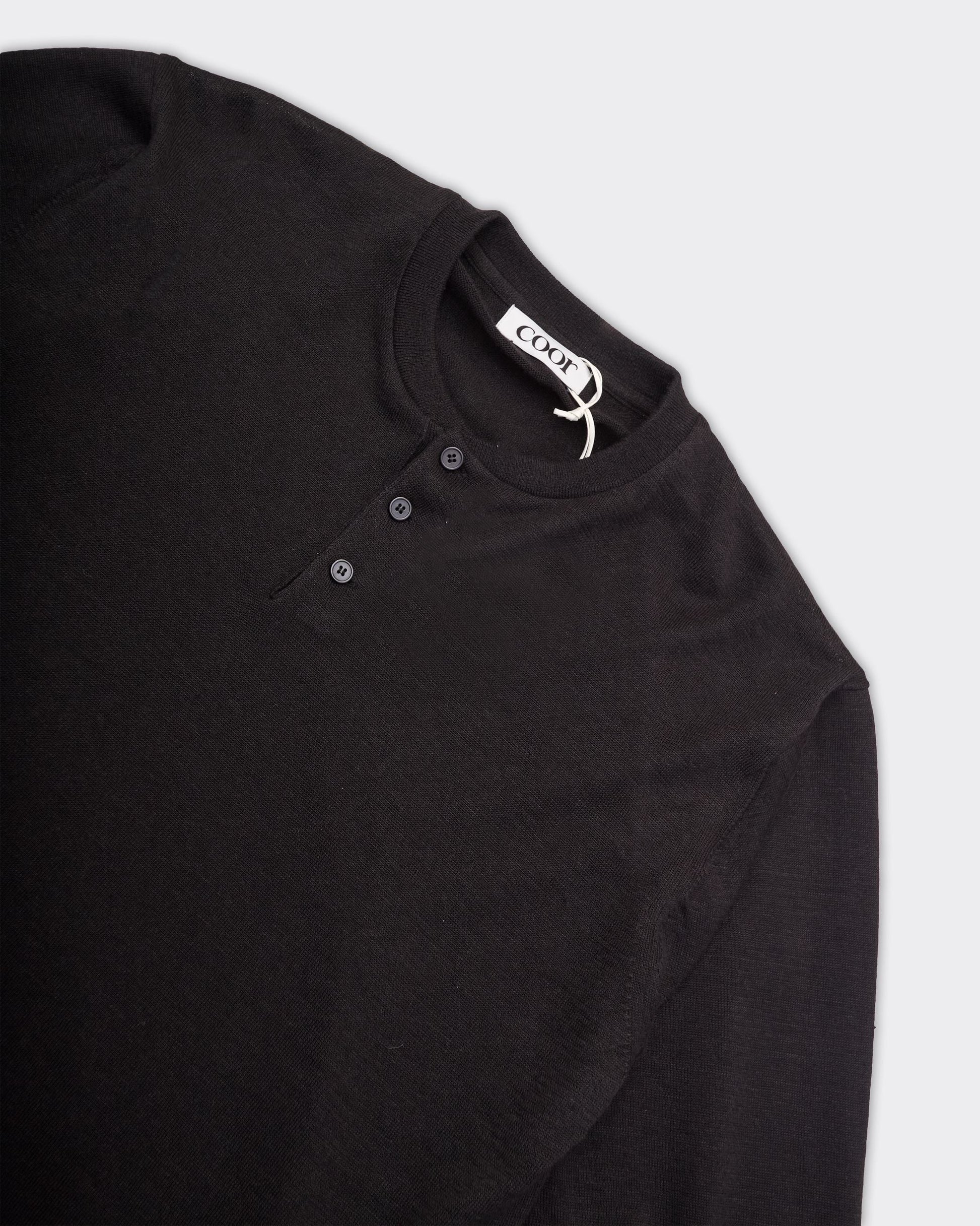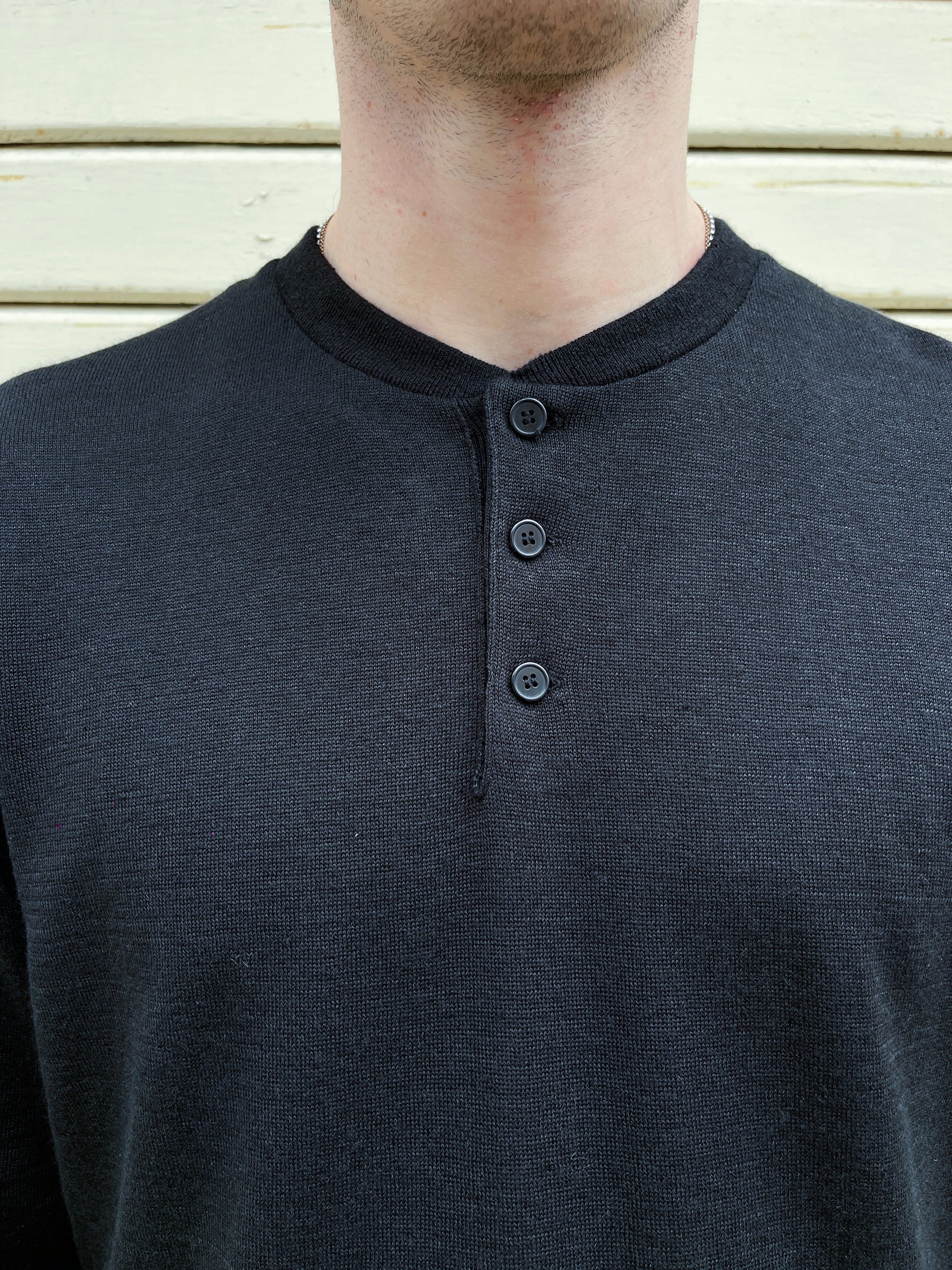 Maglia nera in lino e lana con bottoni sul collo e colletto rotondo.