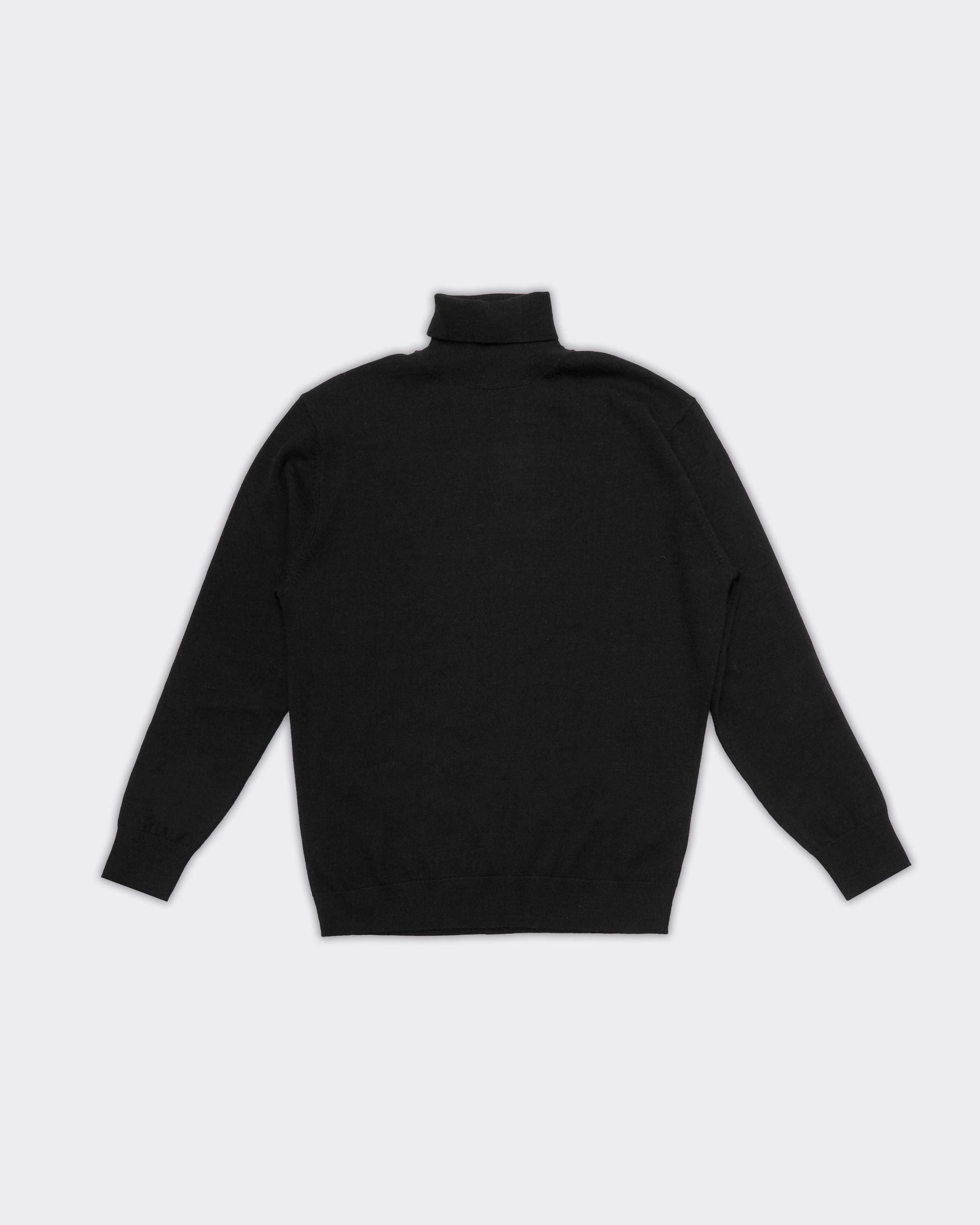 Maglia nera a collo alto con tessuto liscio. Polsini e orlo a coste.