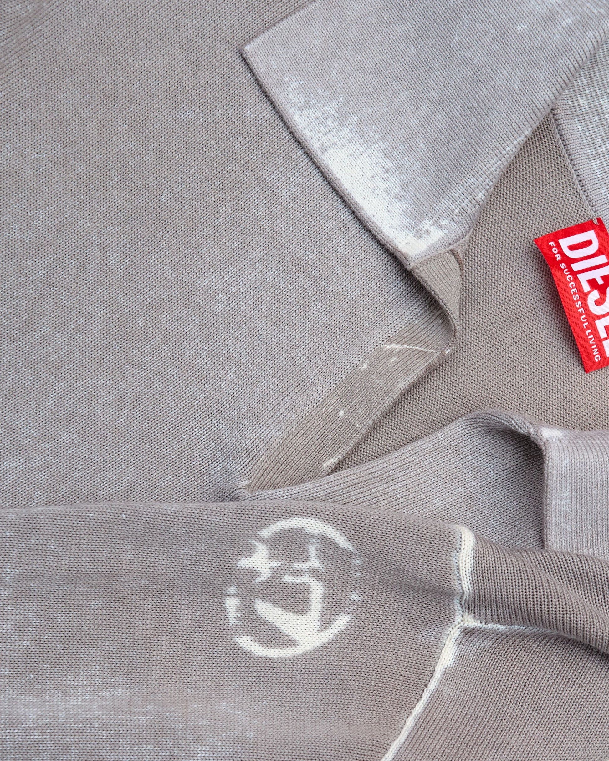 Maglione polo da uomo con vestibilità regular e colletto aperto che dona al capo un aspetto rilassato. Realizzato in cotone biologico, è stato stampato dall'interno, creando una colorazione sfumata e non uniforme. L'effetto di questa tecnica è particolarmente visibile sui bordi a coste, dove la tonalità è decisamente più chiara. Completato con un logo Oval D sulla manica.