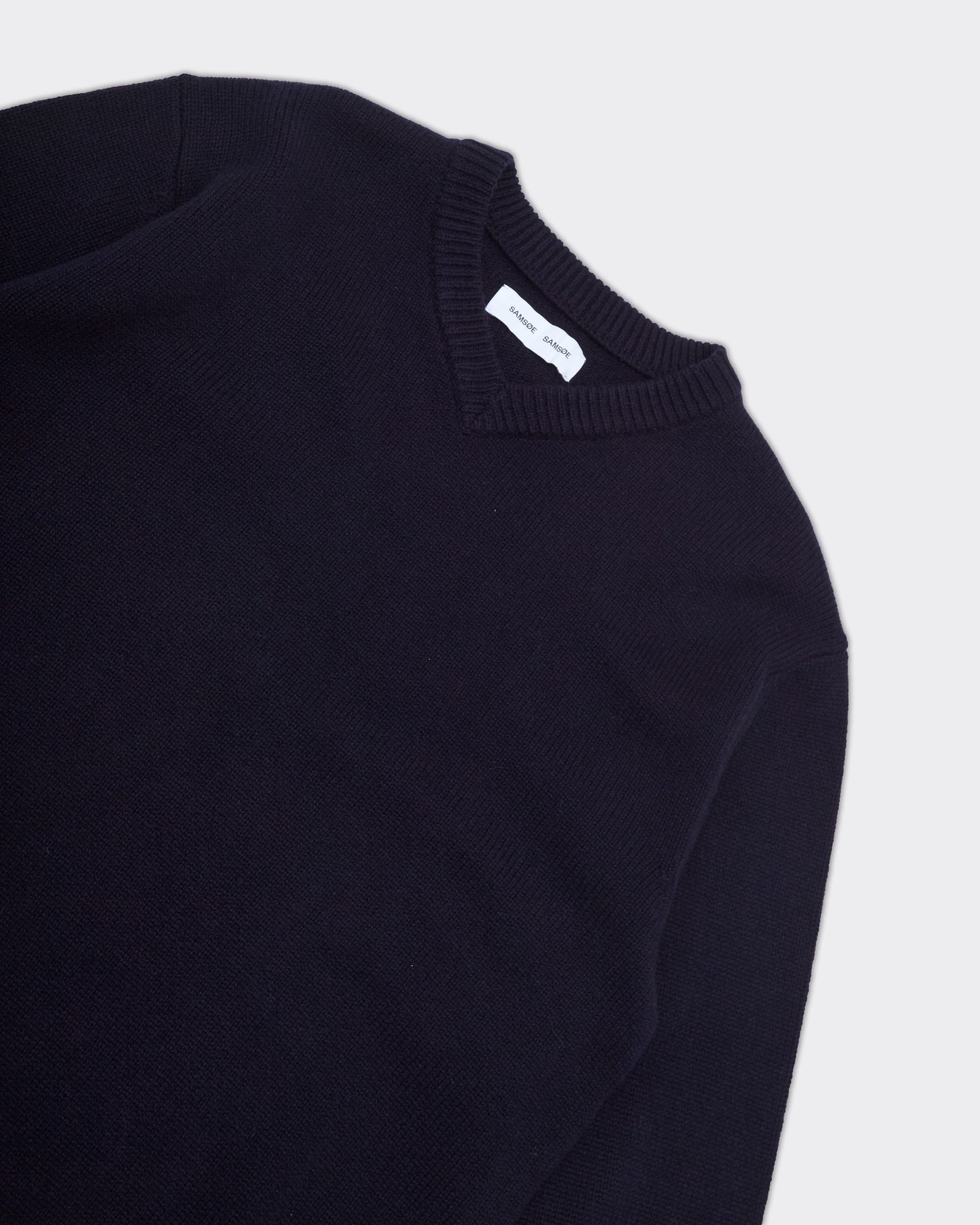 Maglione blu con collo a V, realizzato in tessuto a maglia. Presenta un bordo a coste su collo, polsini e orlo. Nessun logo visibile.