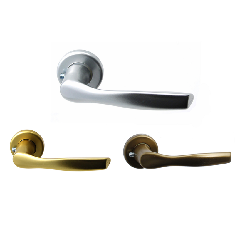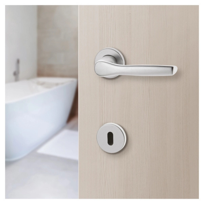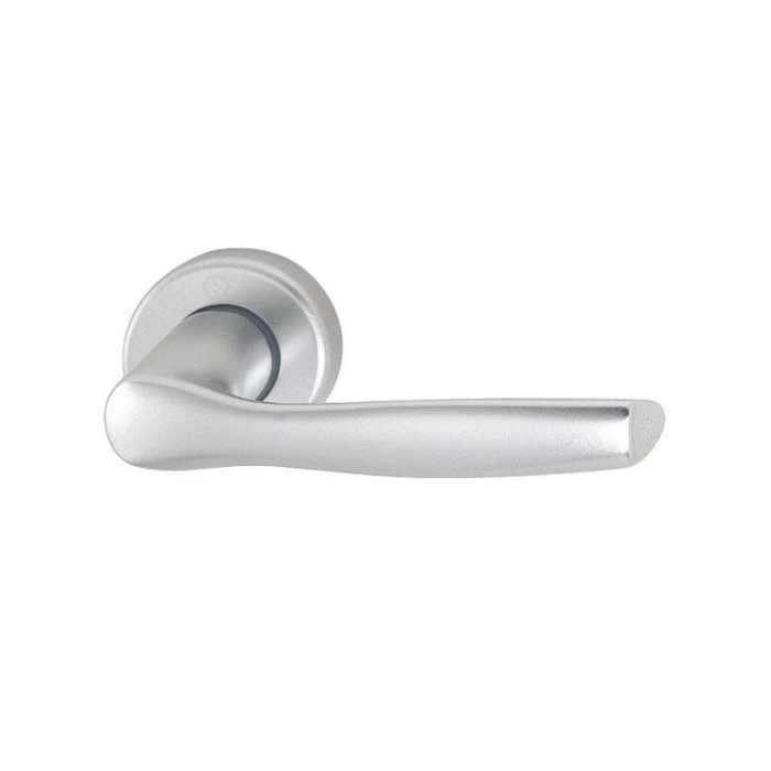 La Maniglia Ginevra si distingue per le sue linee morbide e sinuose che conferiscono un tocco di raffinatezza a qualsiasi ambiente. La finitura argento satinato la rende luminosa ma mai invadente, perfetta per valorizzare porte interne in contesti sia moderni che classici. La rosetta tonda completa un design che unisce comfort ed estetica.