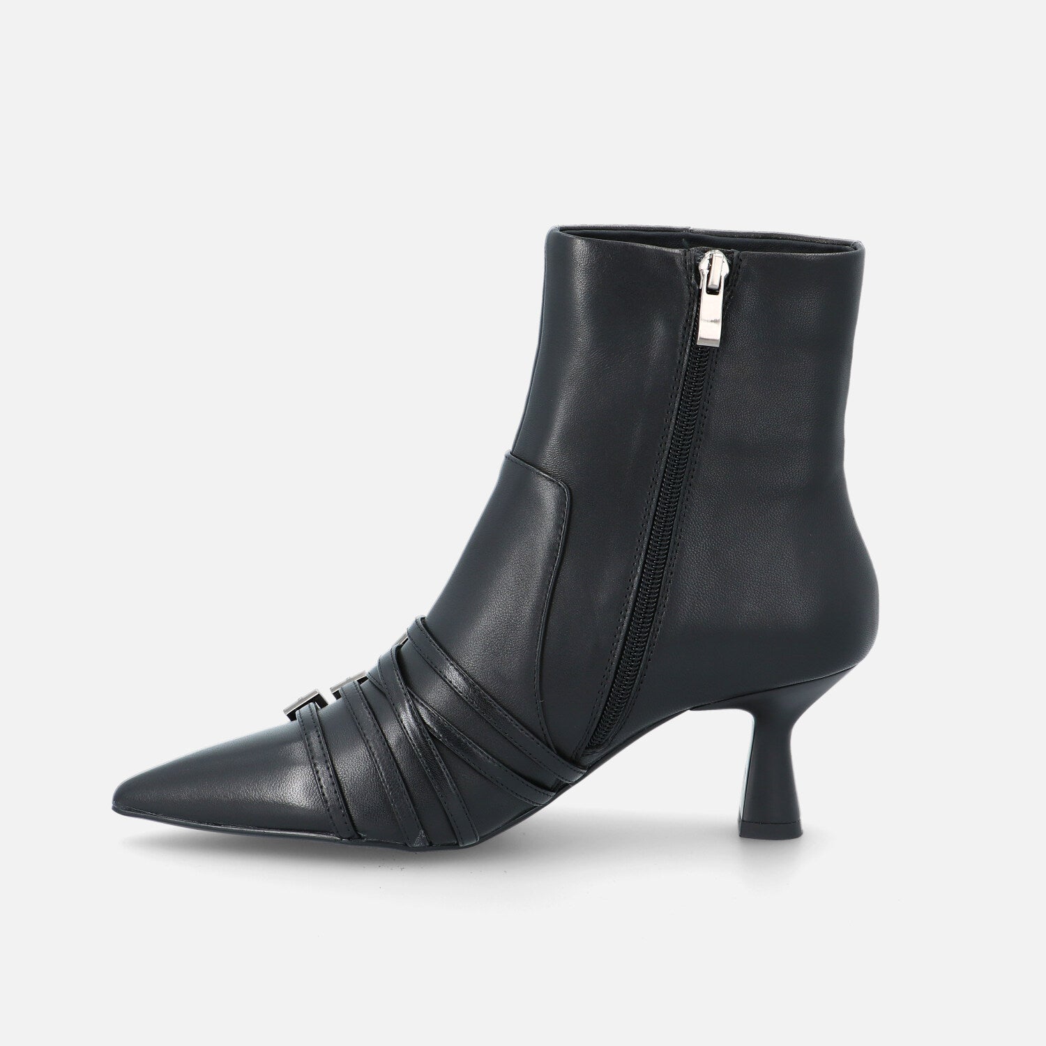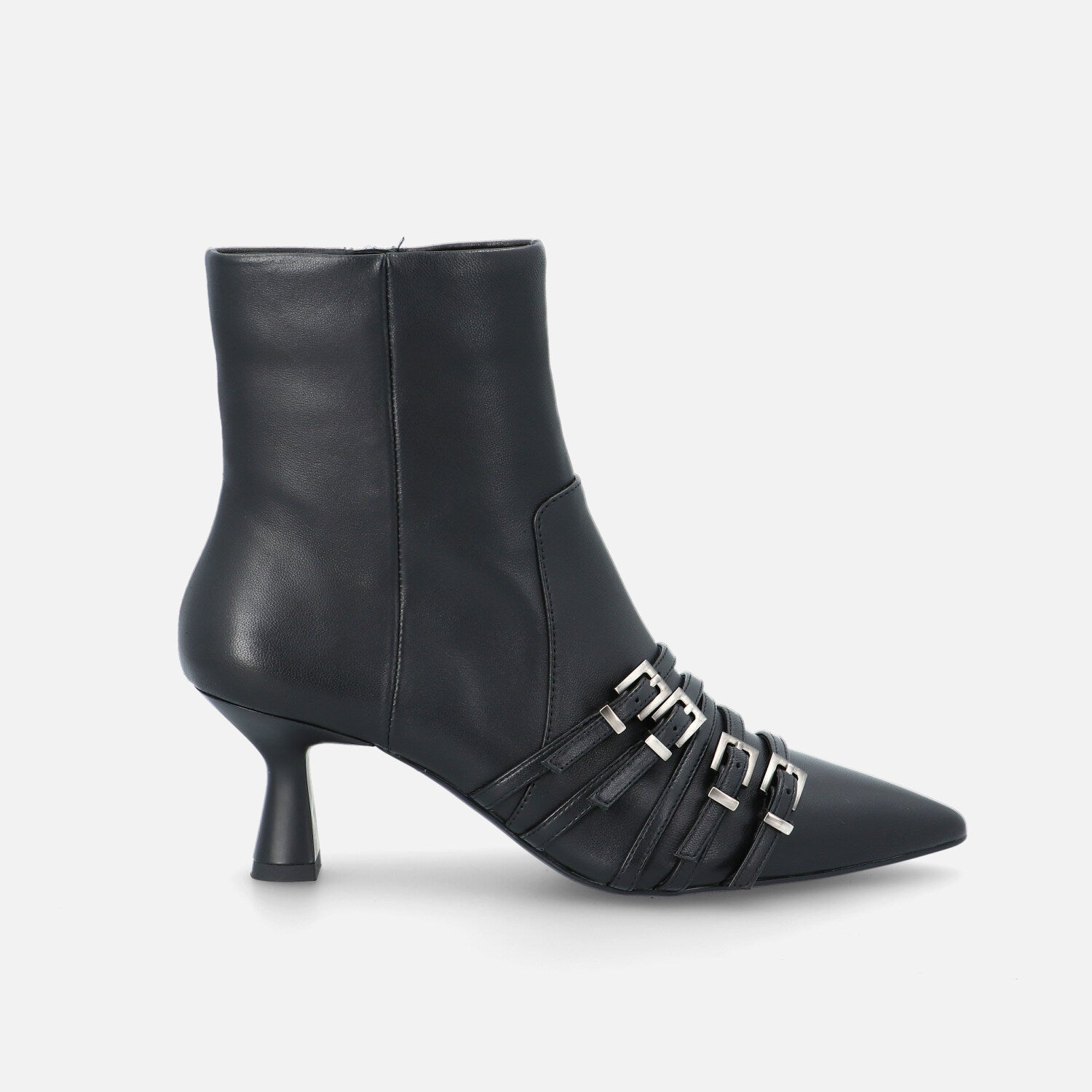 Questo tronchetto Oli Asur in pelle nappa è un modello di forte impatto visivo, che fonde eleganza rétro e dettagli rock. La linea affusolata con punta allungata slancia la figura, mentre la tomaia cattura la luce con una brillantezza decisa. Il design è arricchito da sottili cinturini con fibbie metalliche silver, che avvolgono il piede donando ritmo e carattere. Il tacco a rocchetto di media altezza, dalla forma svasata, aggiunge un tocco sofisticato senza rinunciare alla stabilità. Una calzatura ideale per chi cerca uno stile audace ma raffinato, perfetta per elevare con personalità qualsiasi outfit.