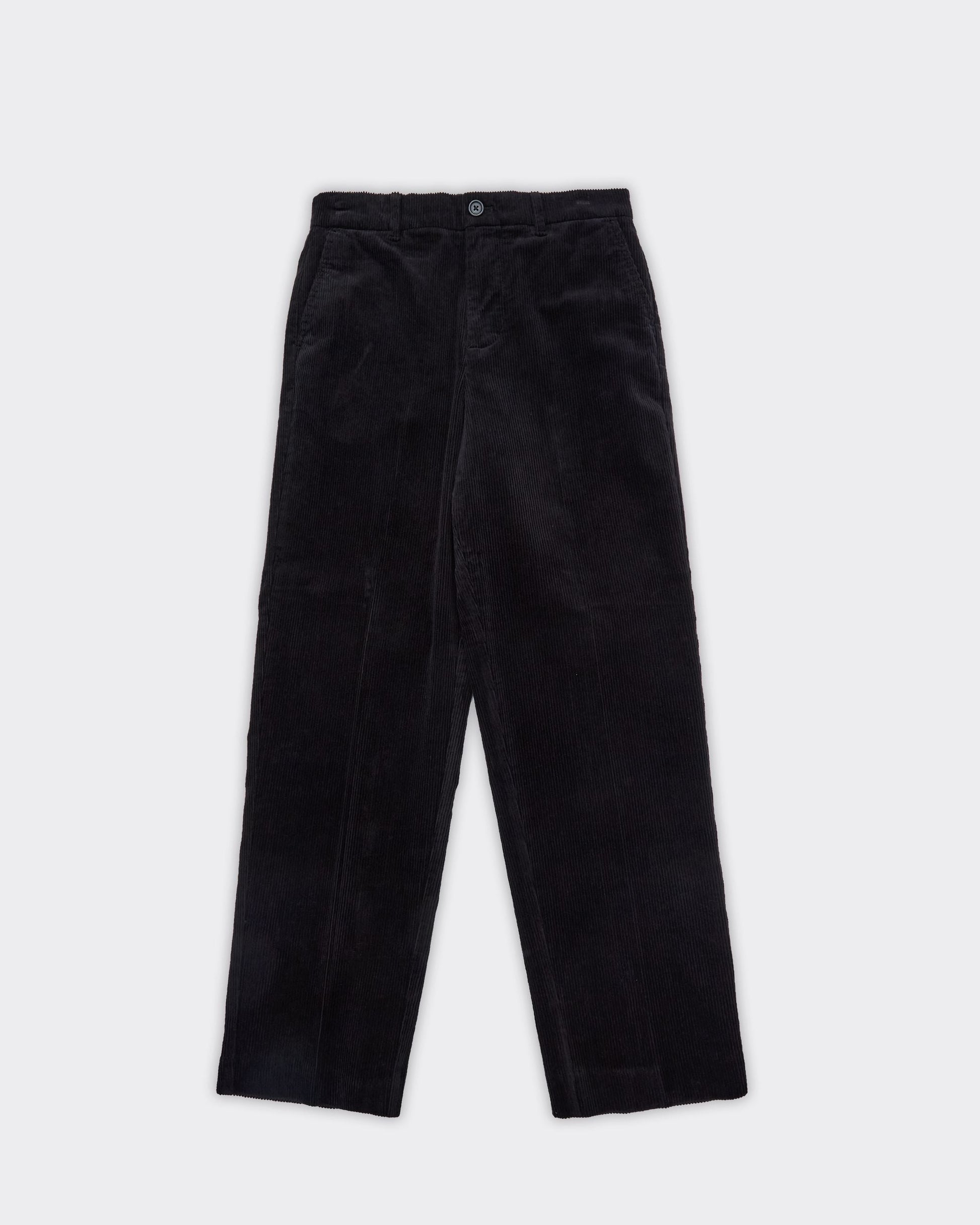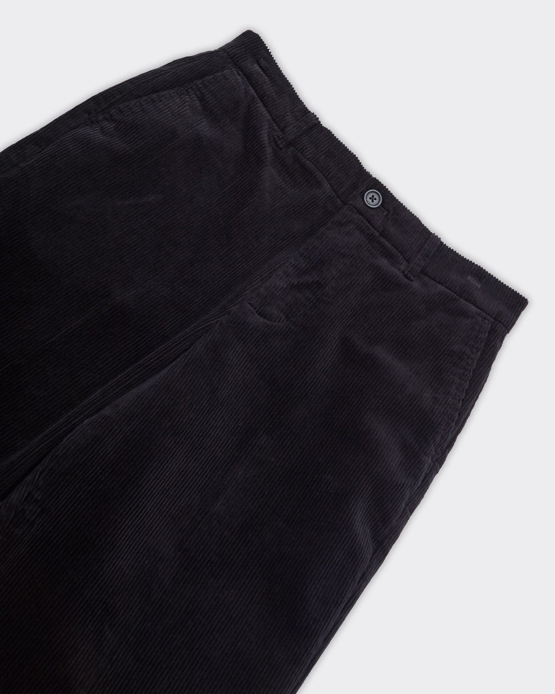 Pantalone nero in velluto a coste, design ampio. Bottone visibile in vita. Tasche anteriori e posteriori senza dettagli aggiuntivi.