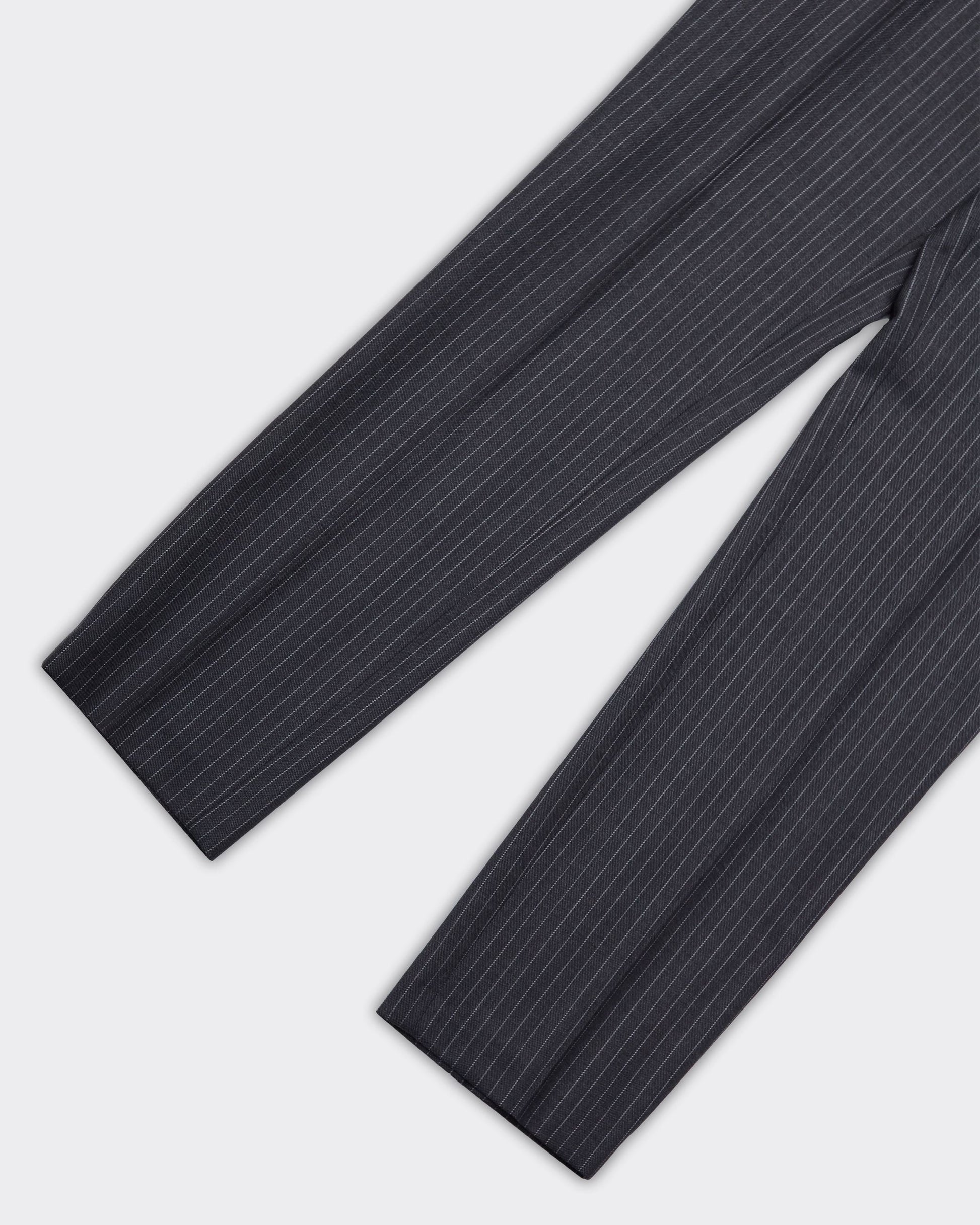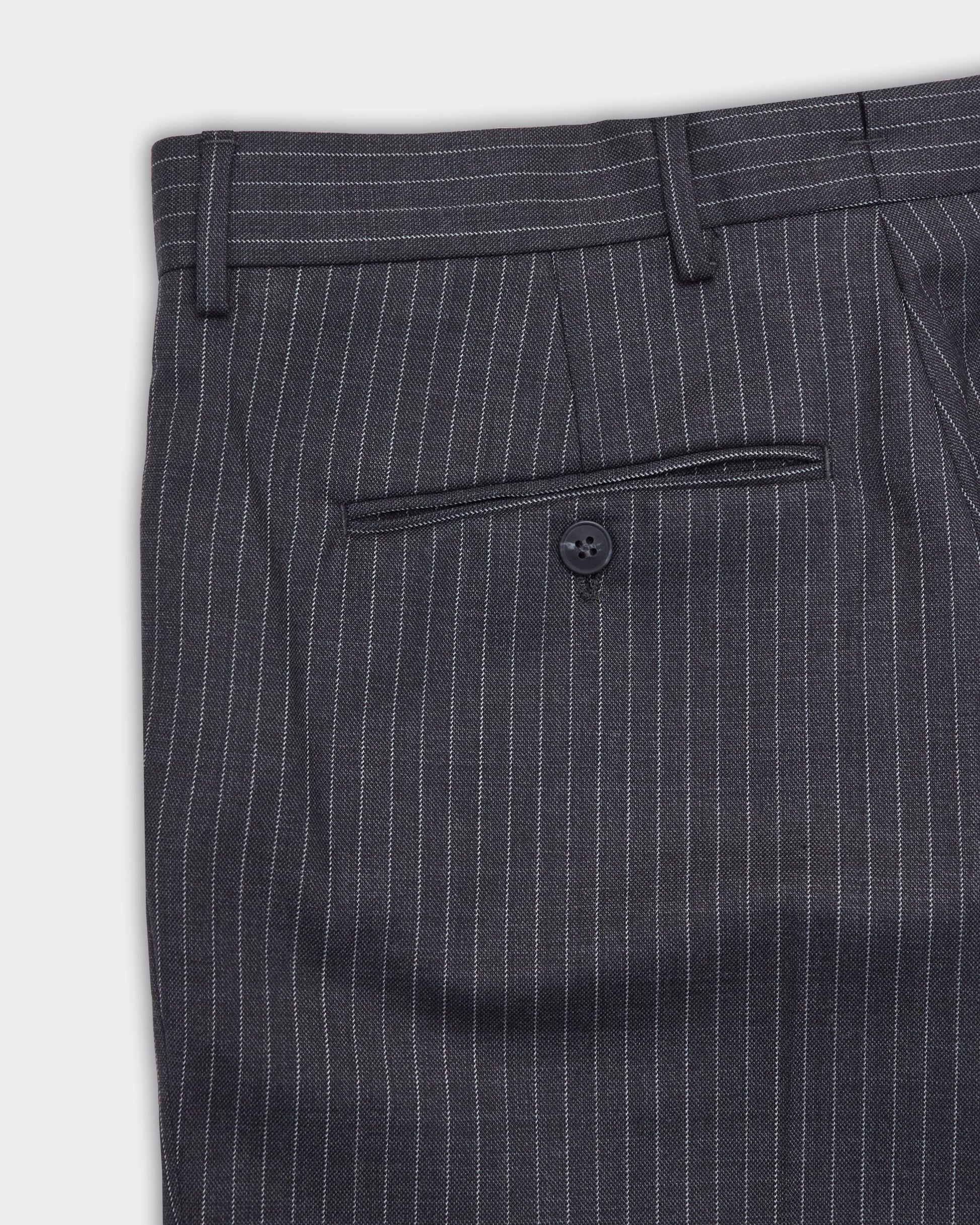 Pantalone grigio con righe sottili bianche, tasche posteriori con bottone.