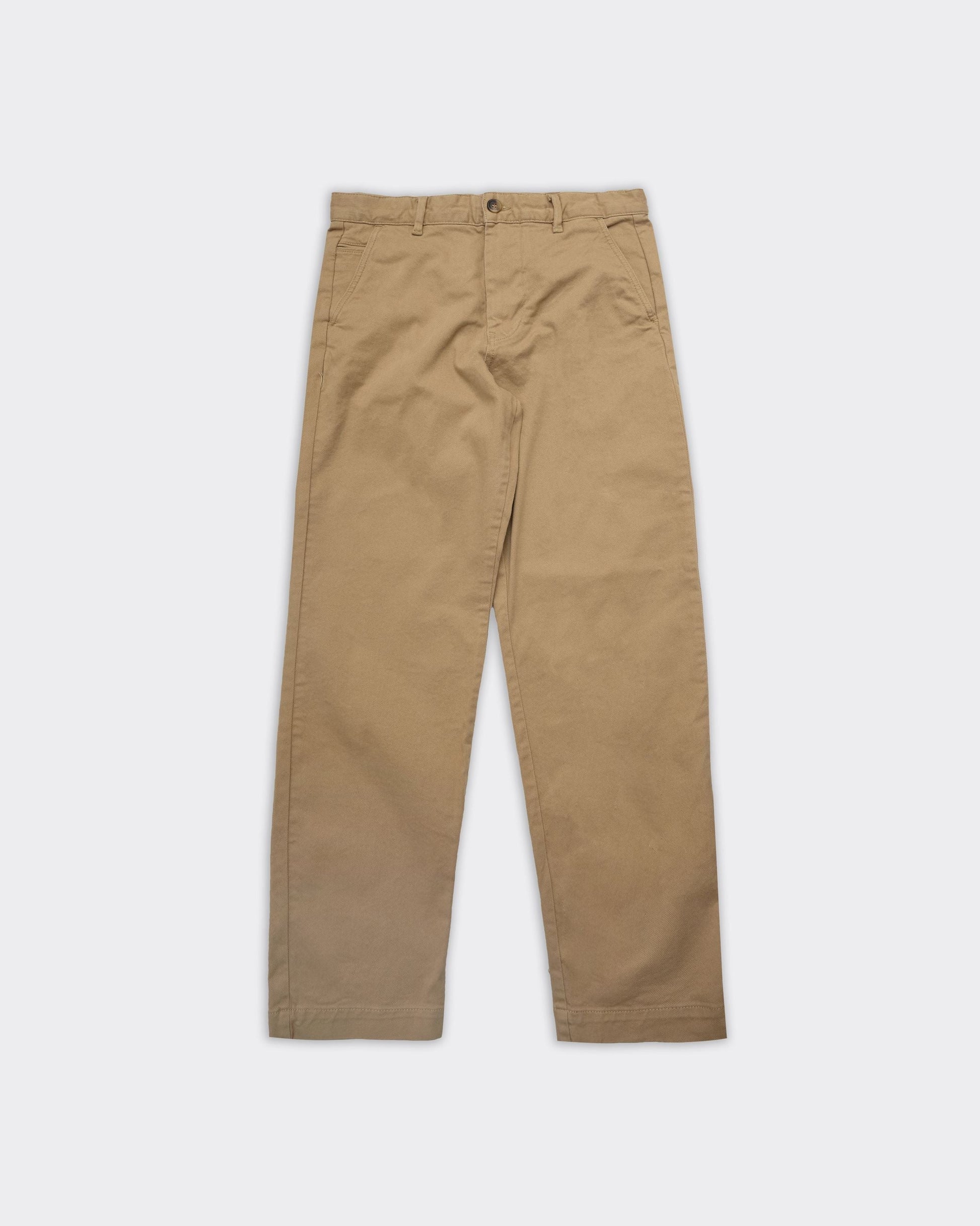 Pantalone color chinchilla in twill, con tasche laterali inclinati e tasche posteriori a fessura. Presenza di passanti per cintura.