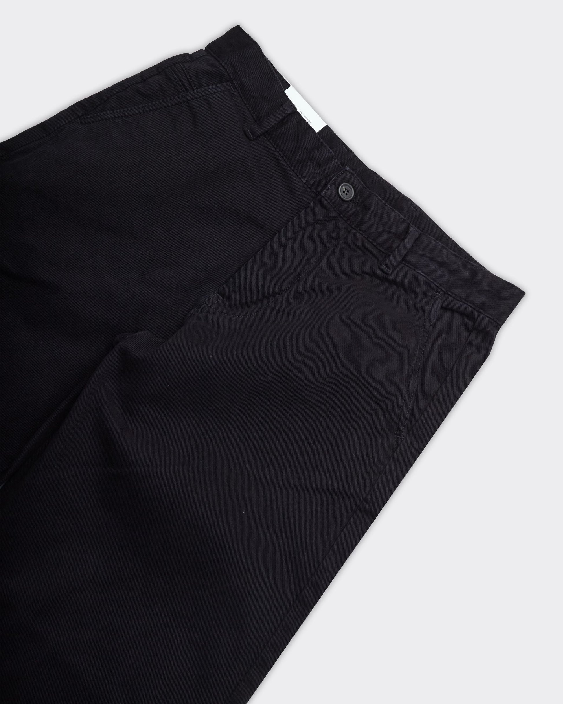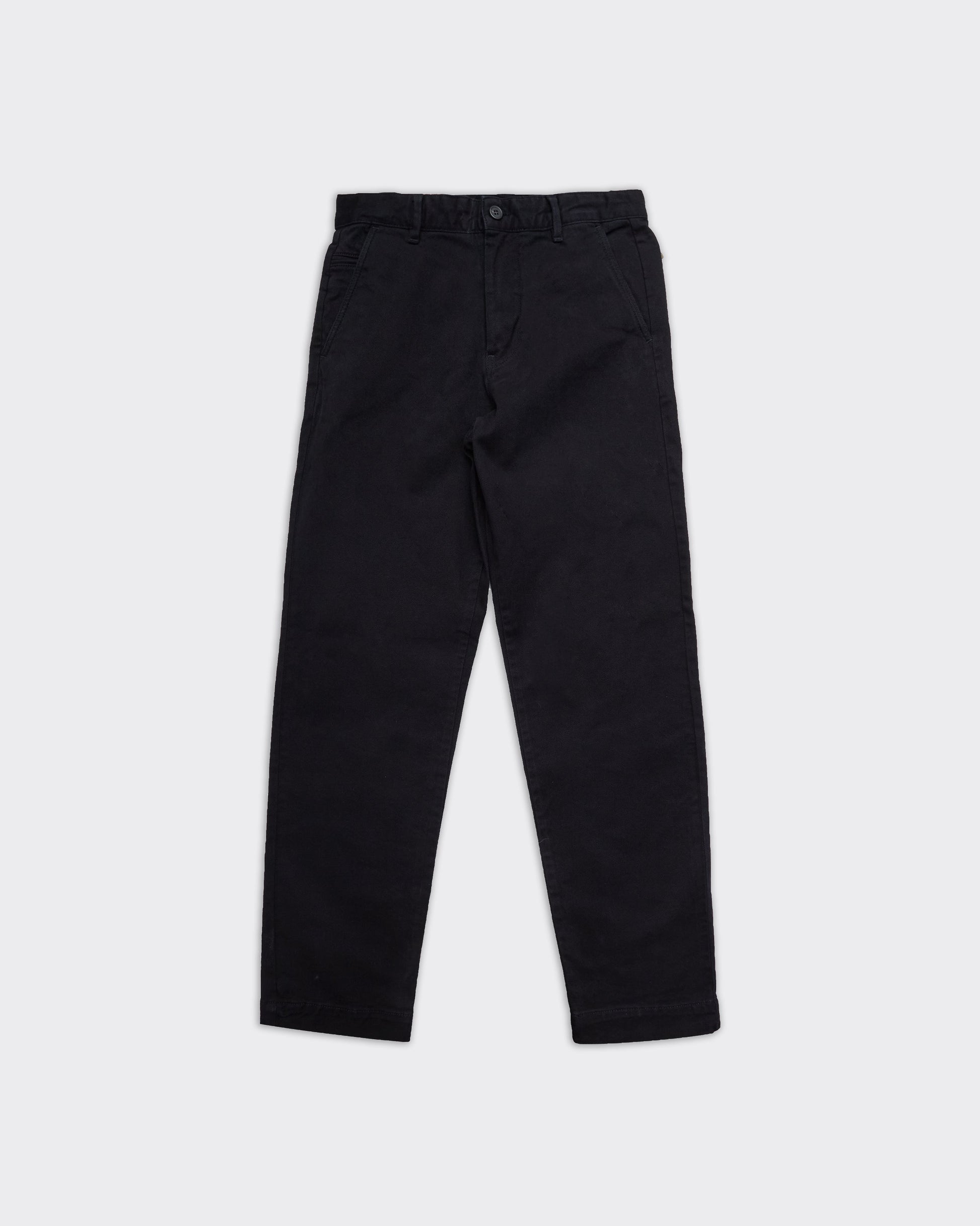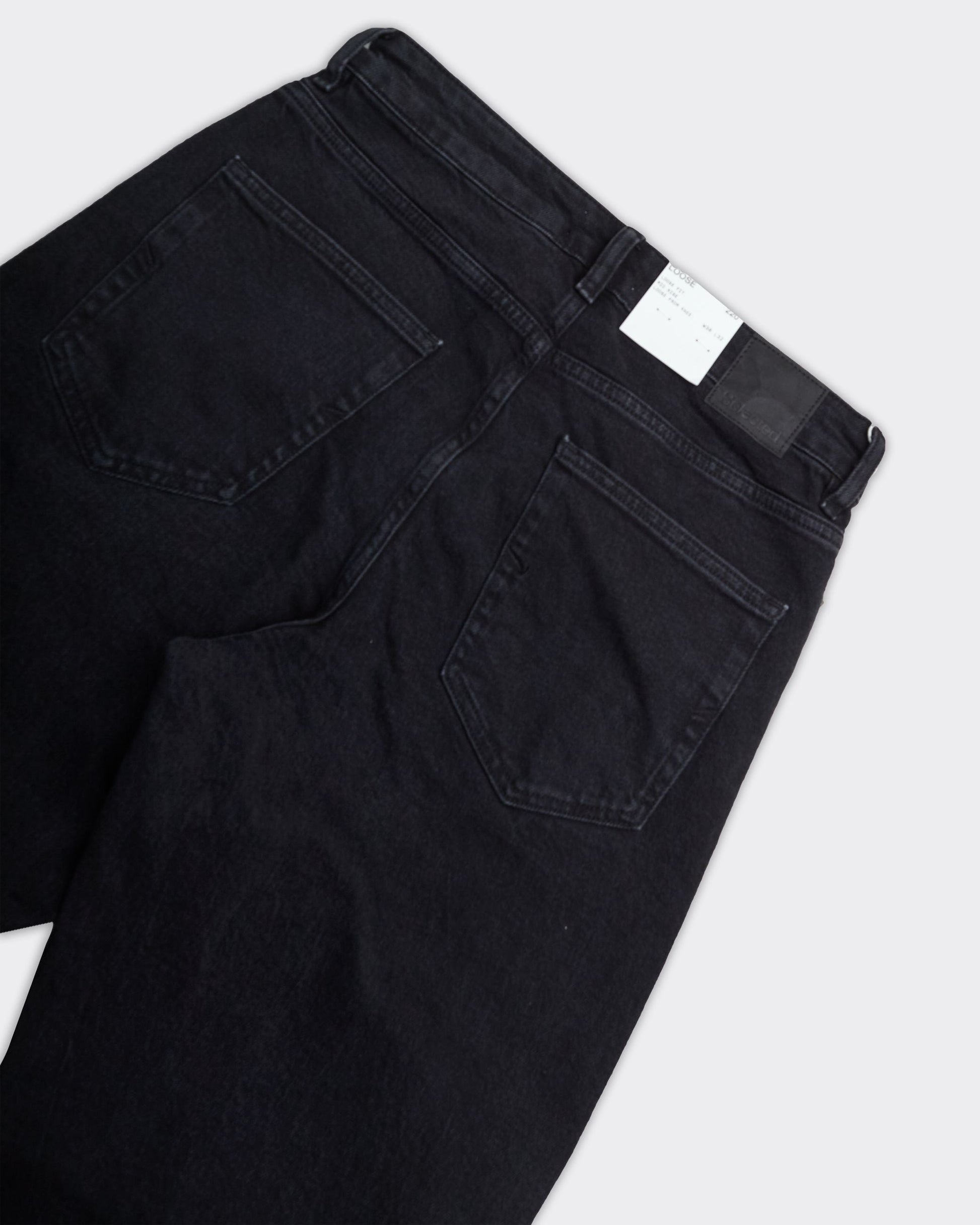 Pantalone nero in twill con design ampio. Tasche laterali e posteriori visibili.