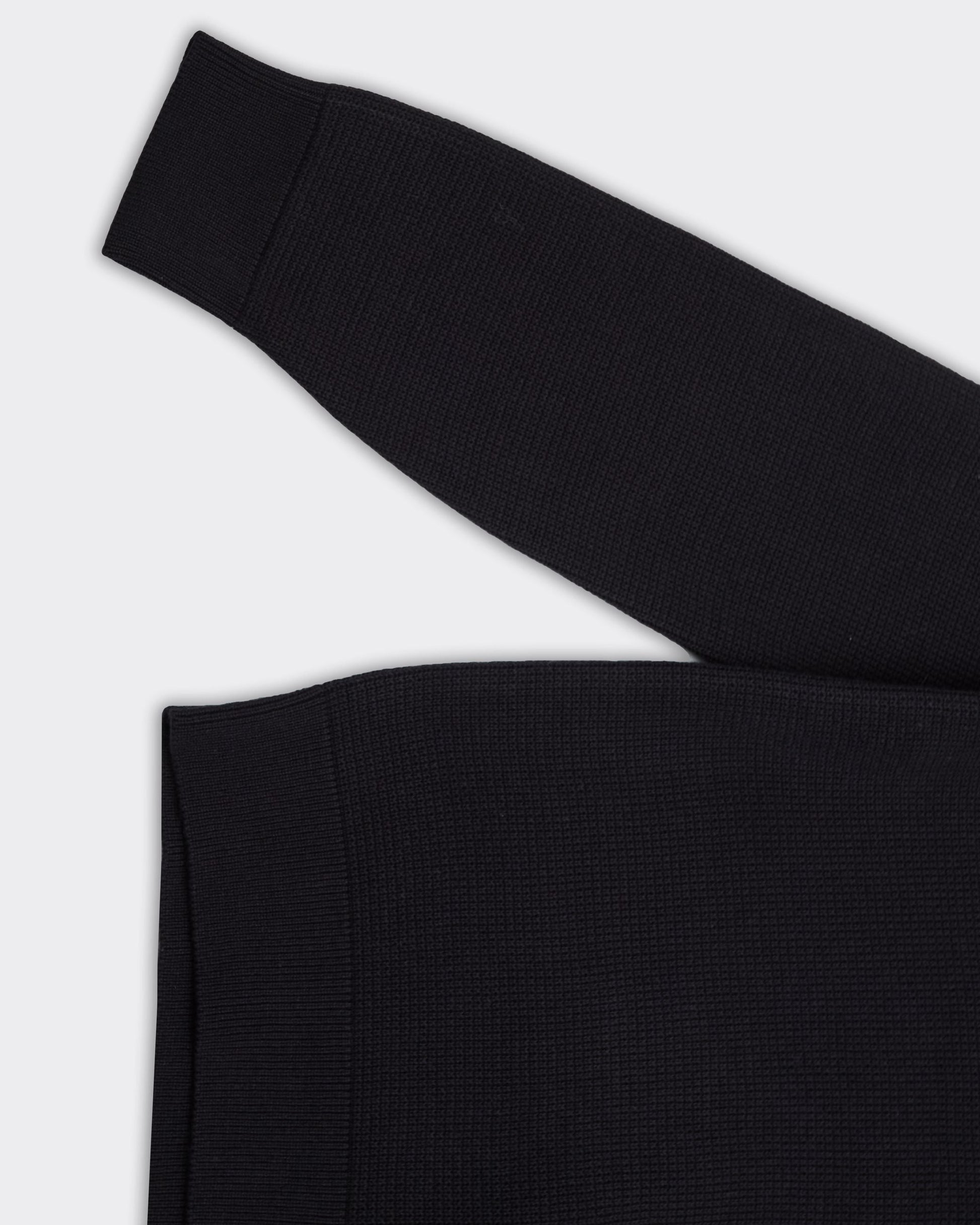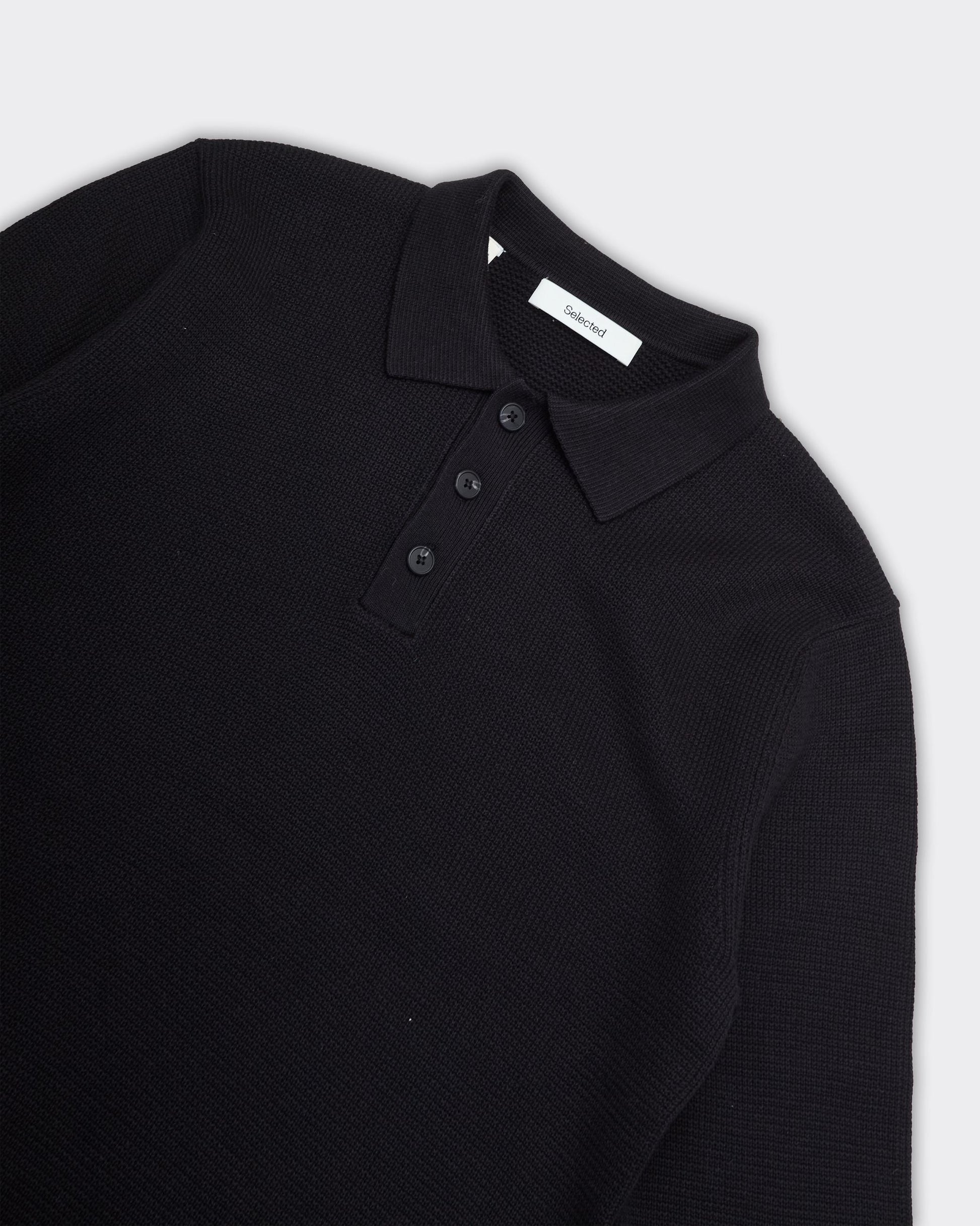Polo nera in tessuto lavorato a maglia, con chiusura a bottoni sul collo.